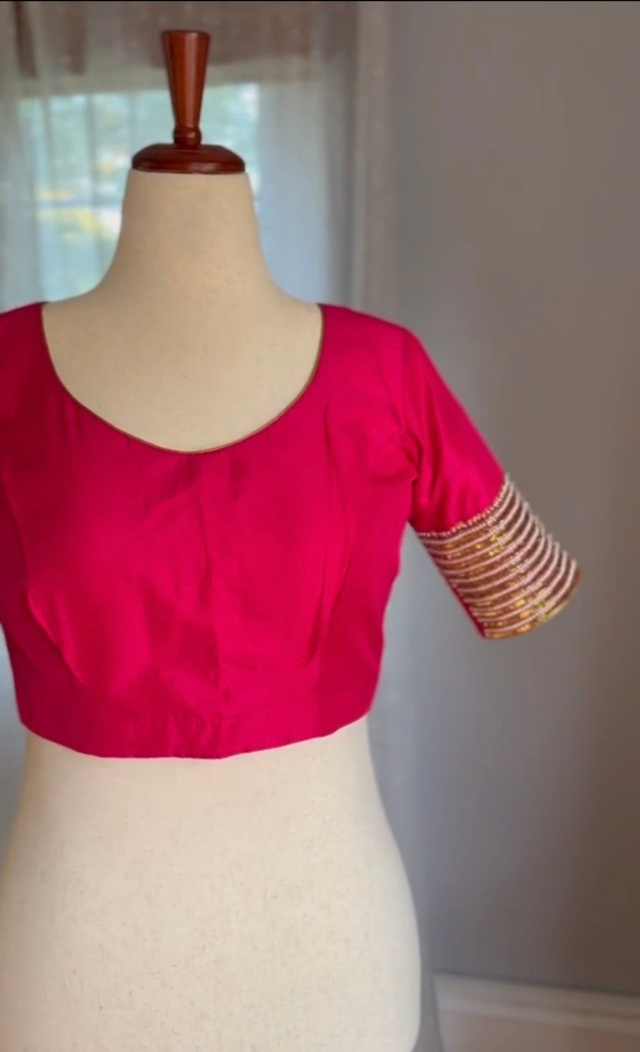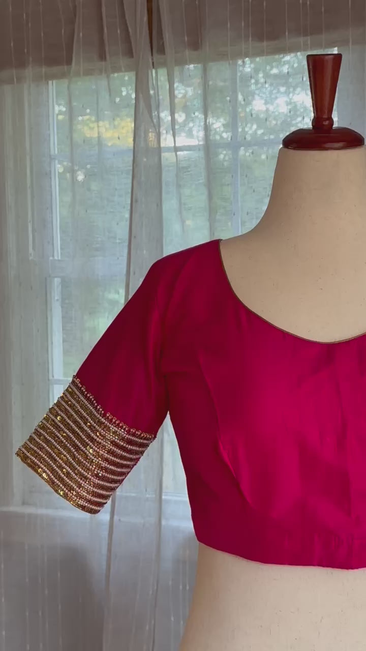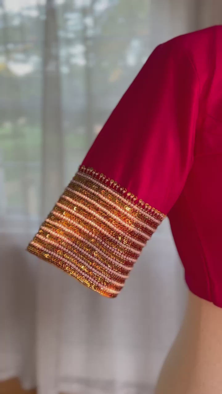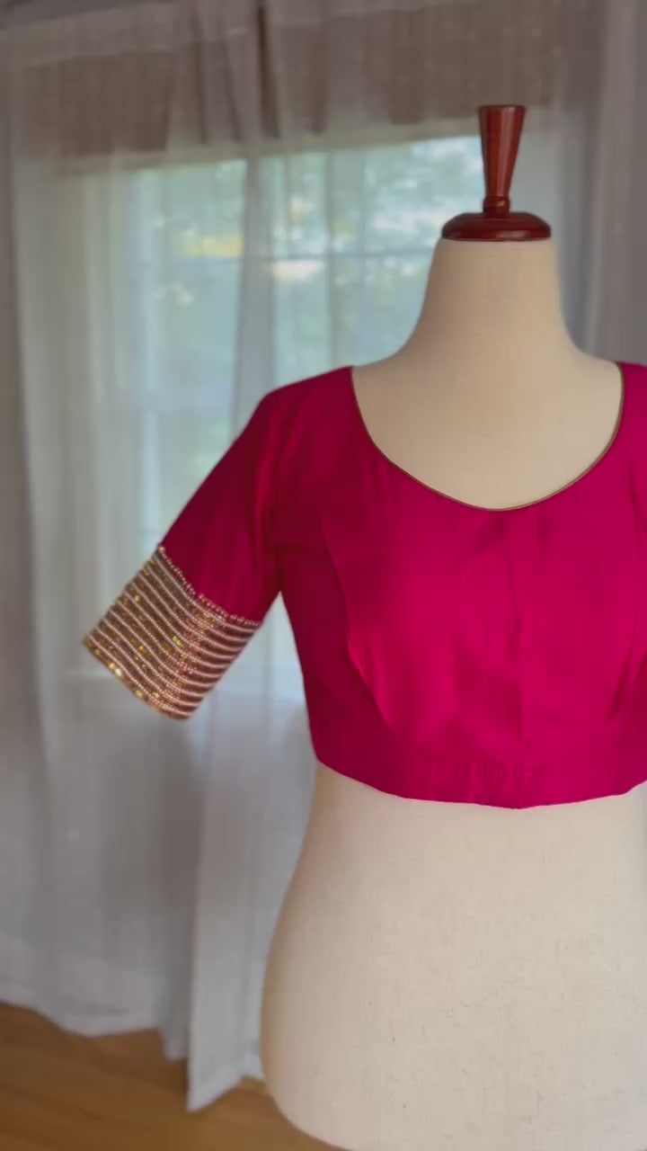 luxury and elegance served with our hand embroidered pearl gold sequin blouse in a beautiful pink color. The intricate embroidery, glistening pearls, and sparkling gold sequins make this blouse a statement piece that exudes sophistication.