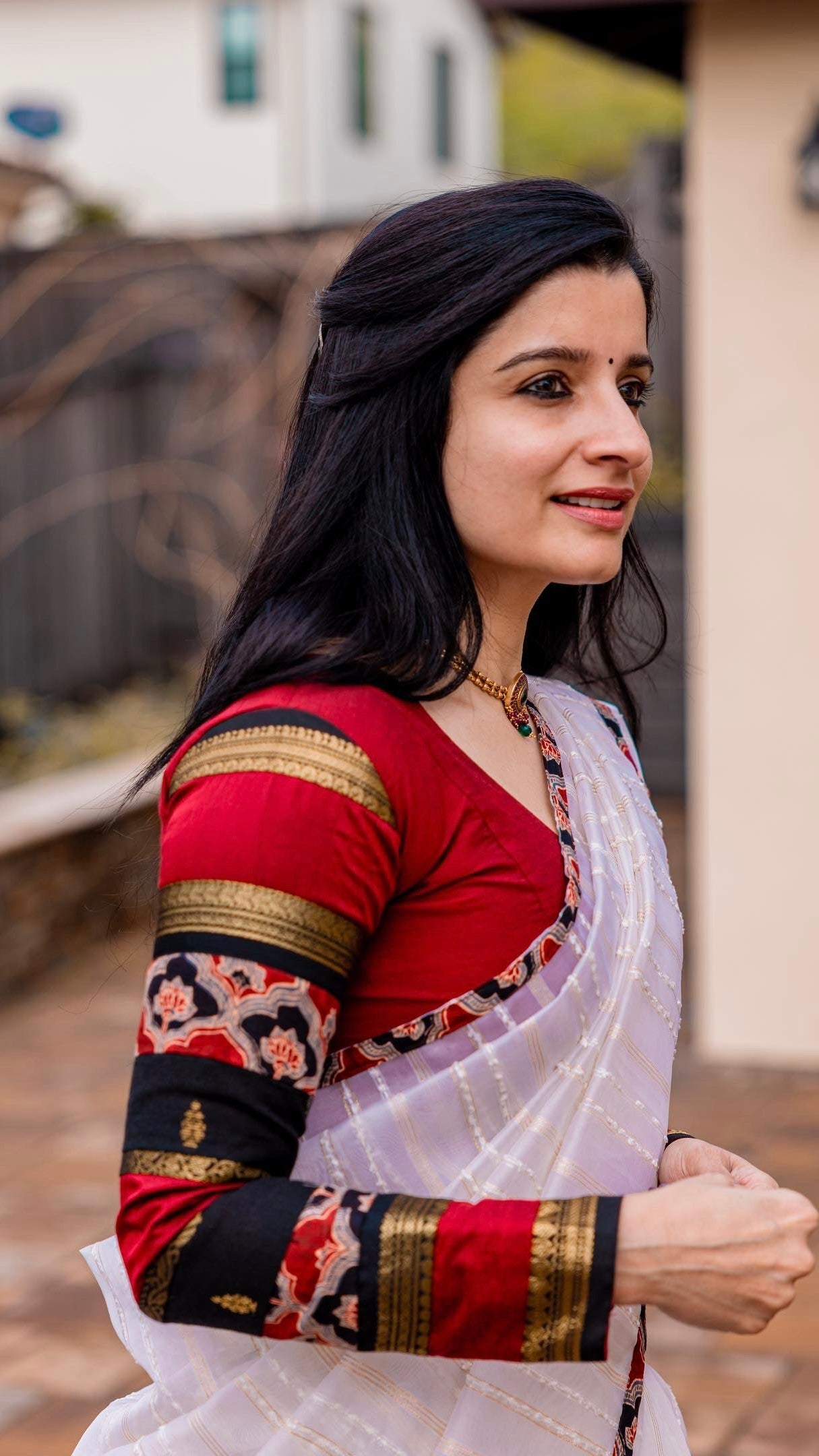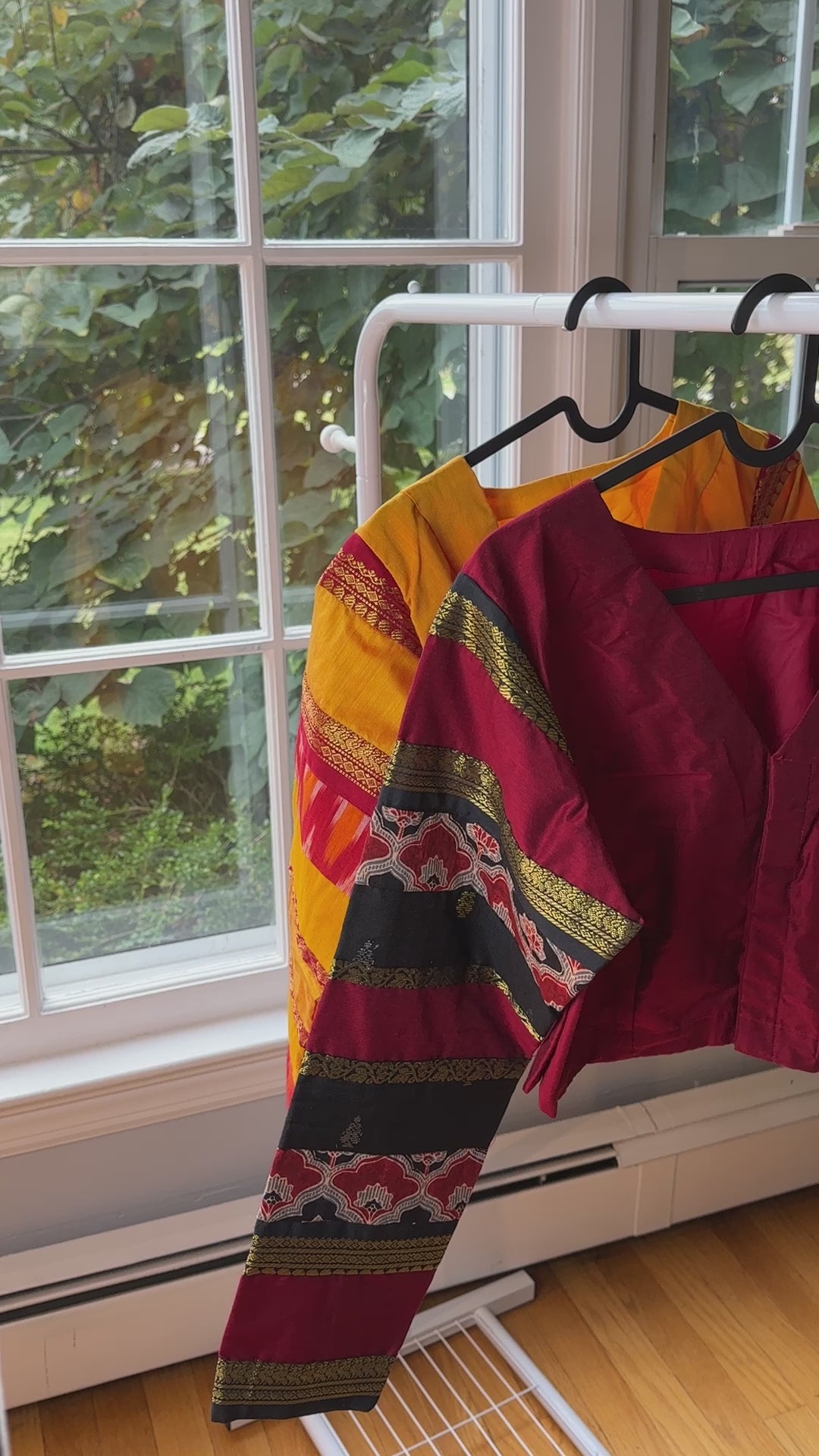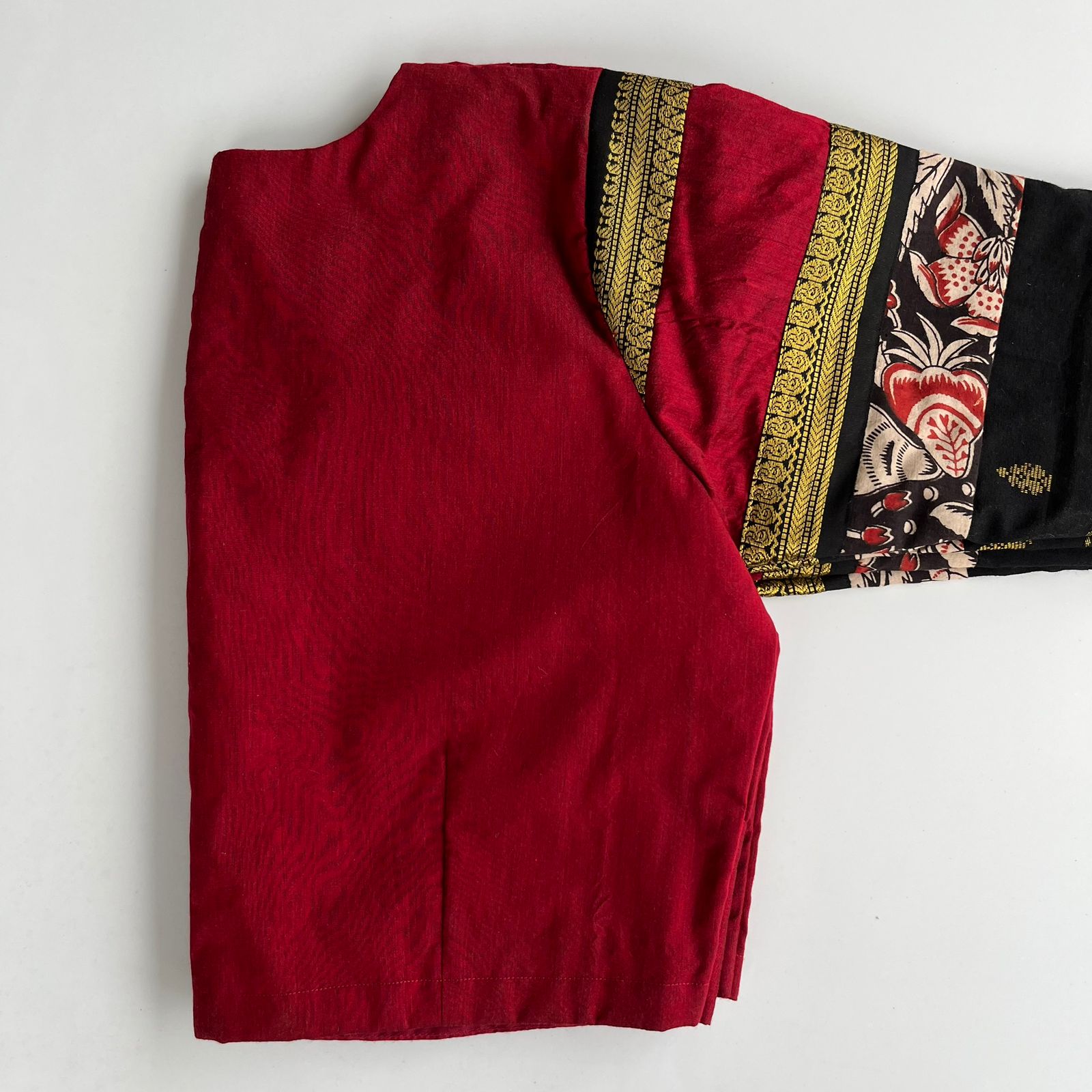 The blouse is a combination of silk, Zari, cotton, kalamkari and ajrakh fabrics. Stitched to perfection  !