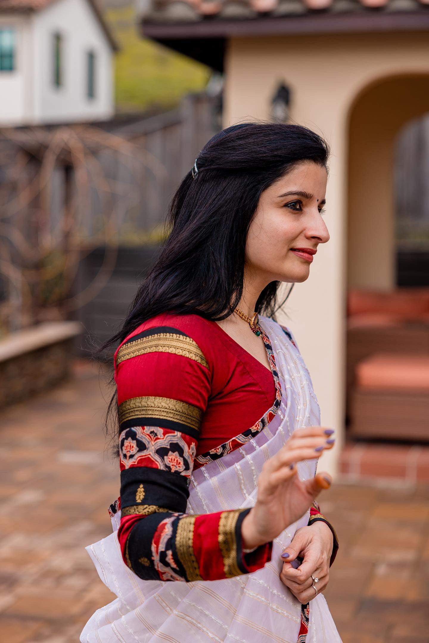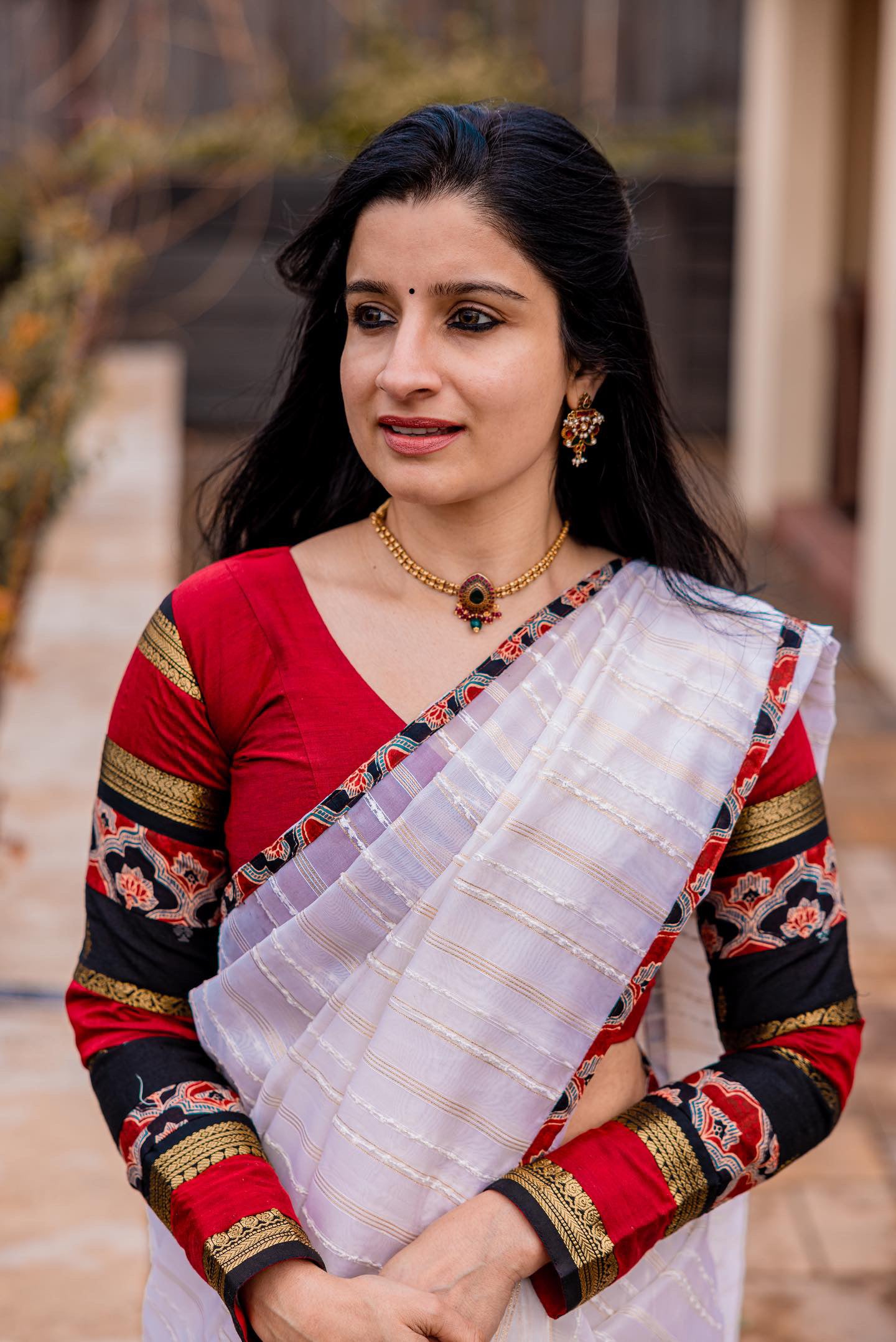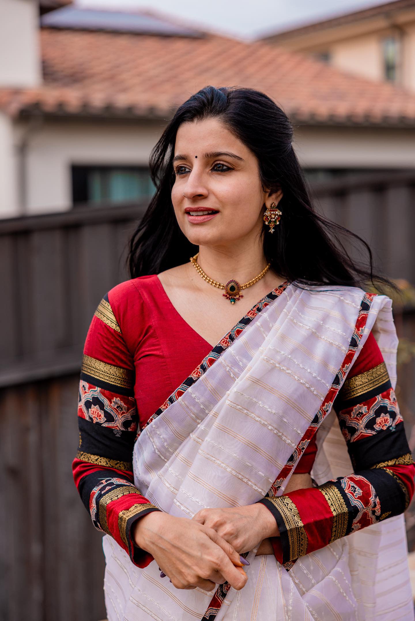 The blouse is a combination of silk, Zari, cotton, kalamkari and ajrakh fabrics. Stitched to perfection  !