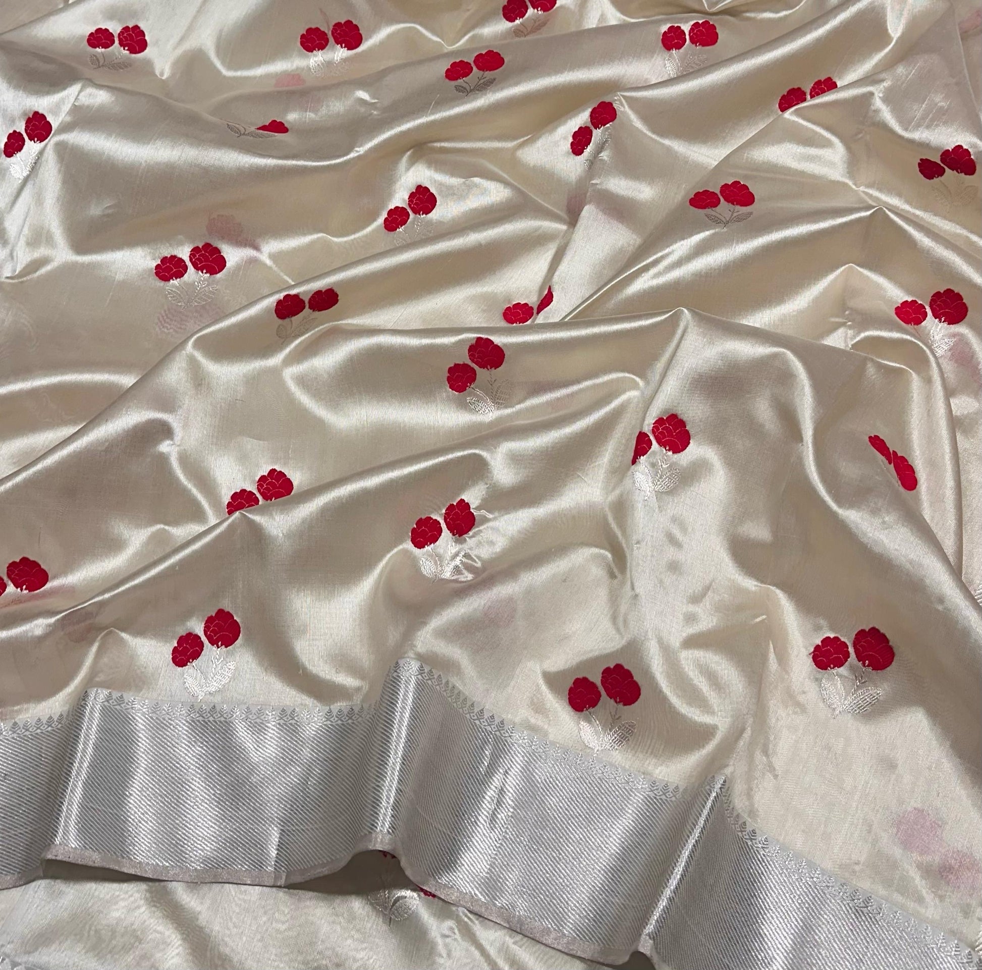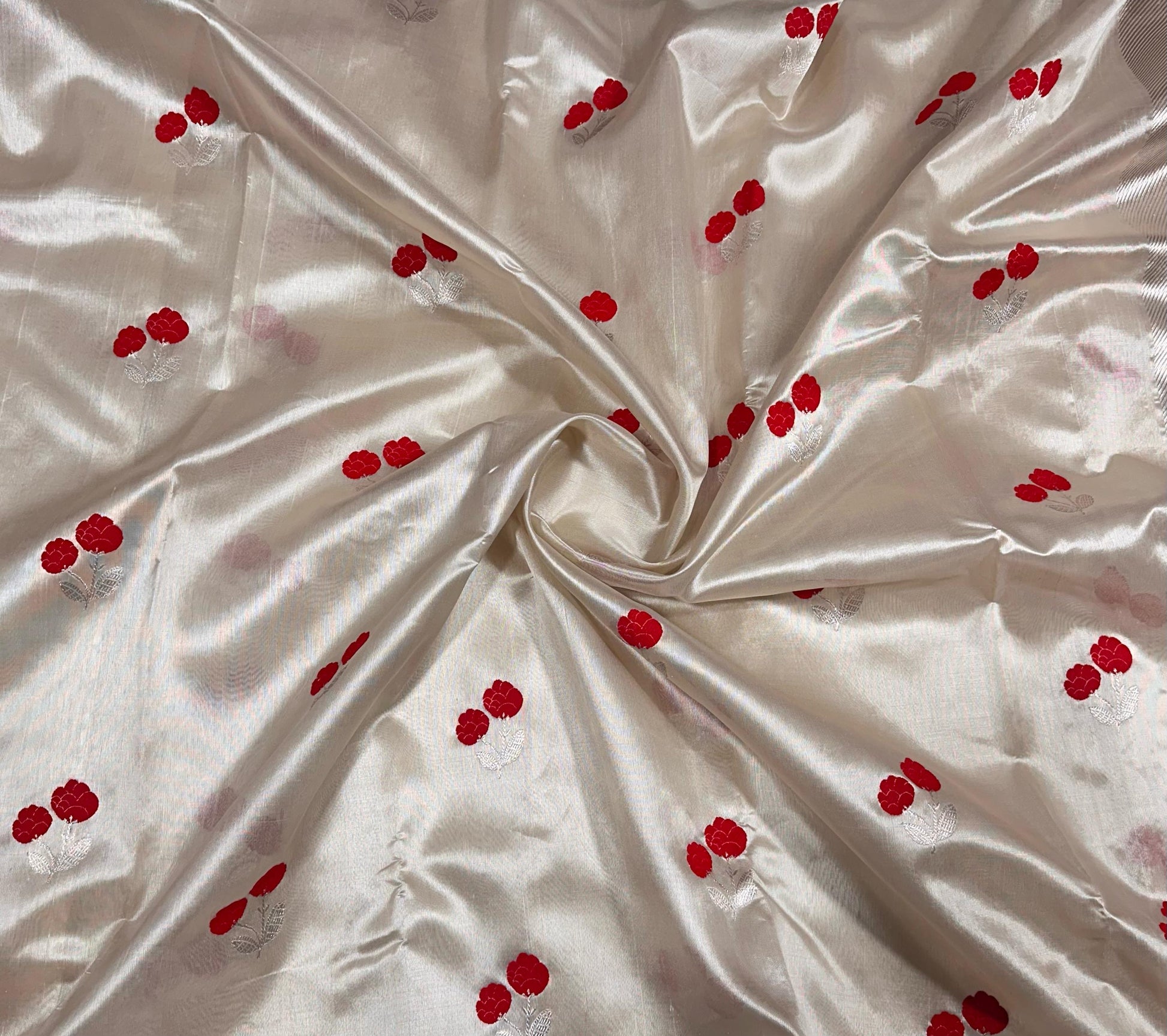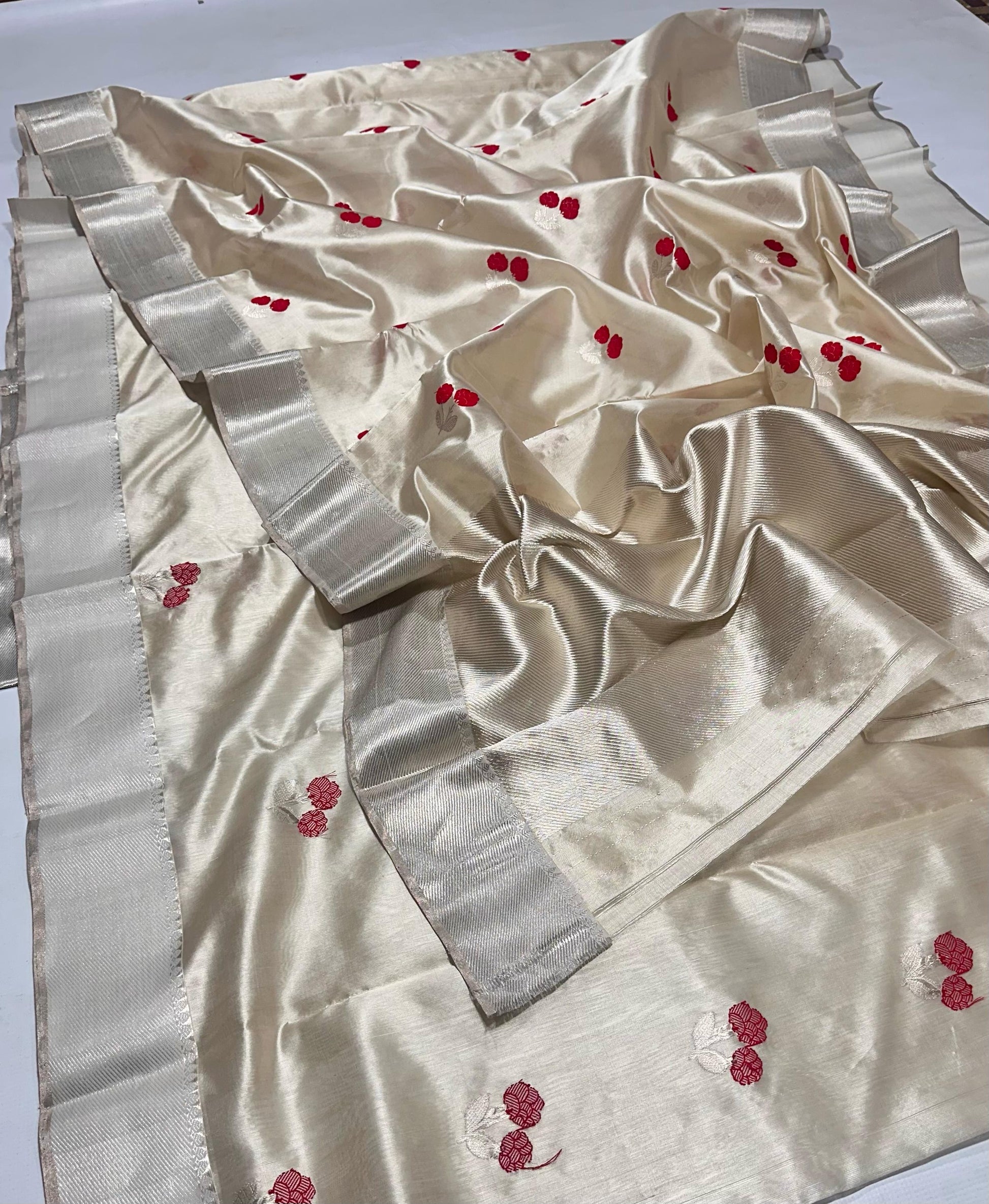 Pure silk Chanderi handloom in pleasant milk cream with twin flower zari butta and pink Mina