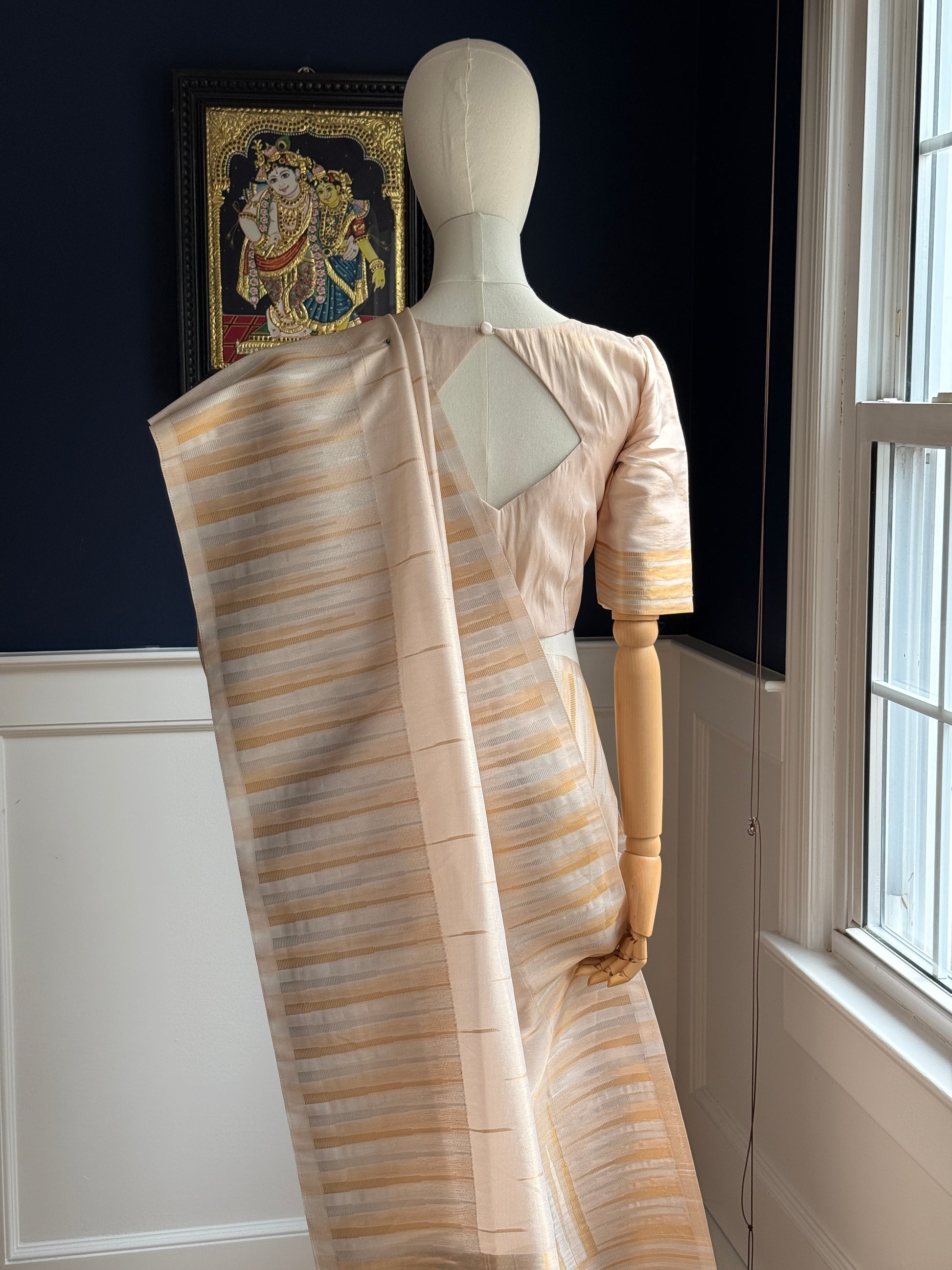 This exquisite semi Banarasi silk tissue saree is a vision of understated grandeur, perfect for festive occasions like Onam and traditional celebrations. Woven with masterful precision, the saree features double borders in antique gold and antique silver on both edges — a pairing that radiates quiet elegance.