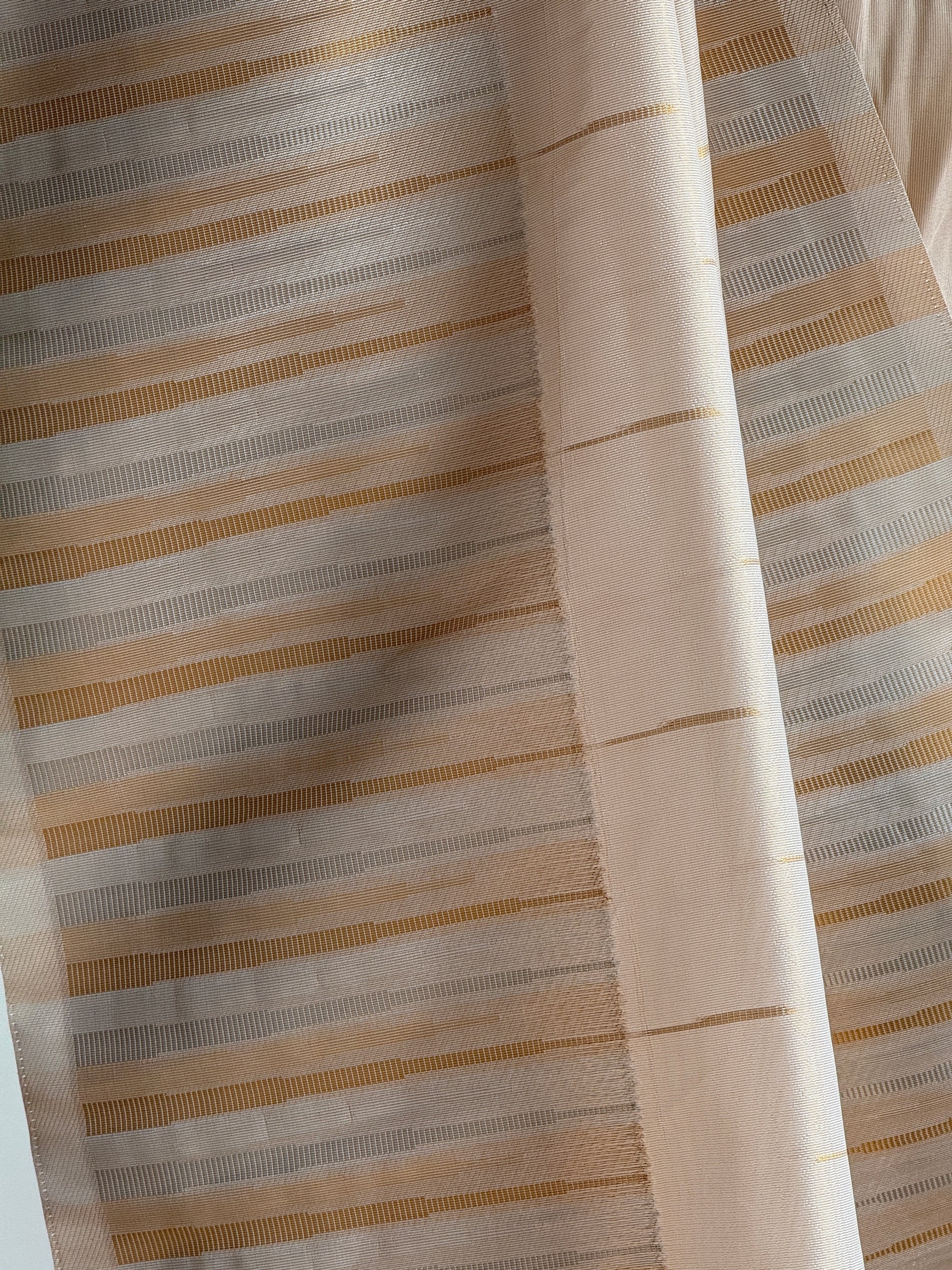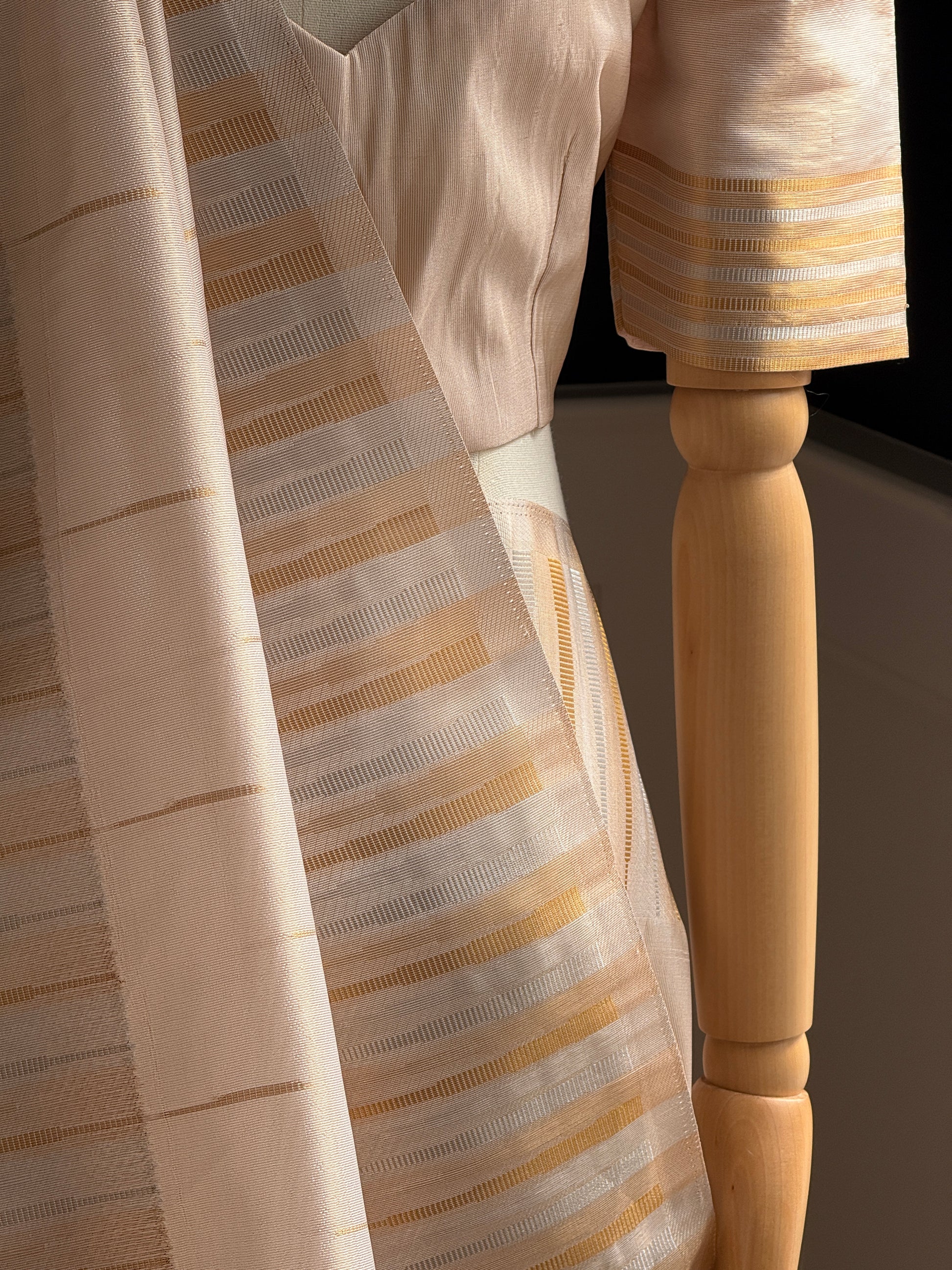 The antique gold sheen over the entire drape lends a soft, luminous glow, while fine golden lines run horizontally across the body, creating a subtle rhythm in the weave. The texture is lightweight, airy, and soft to the touch, making it a joy to wear for long hours without compromising on sophistication.