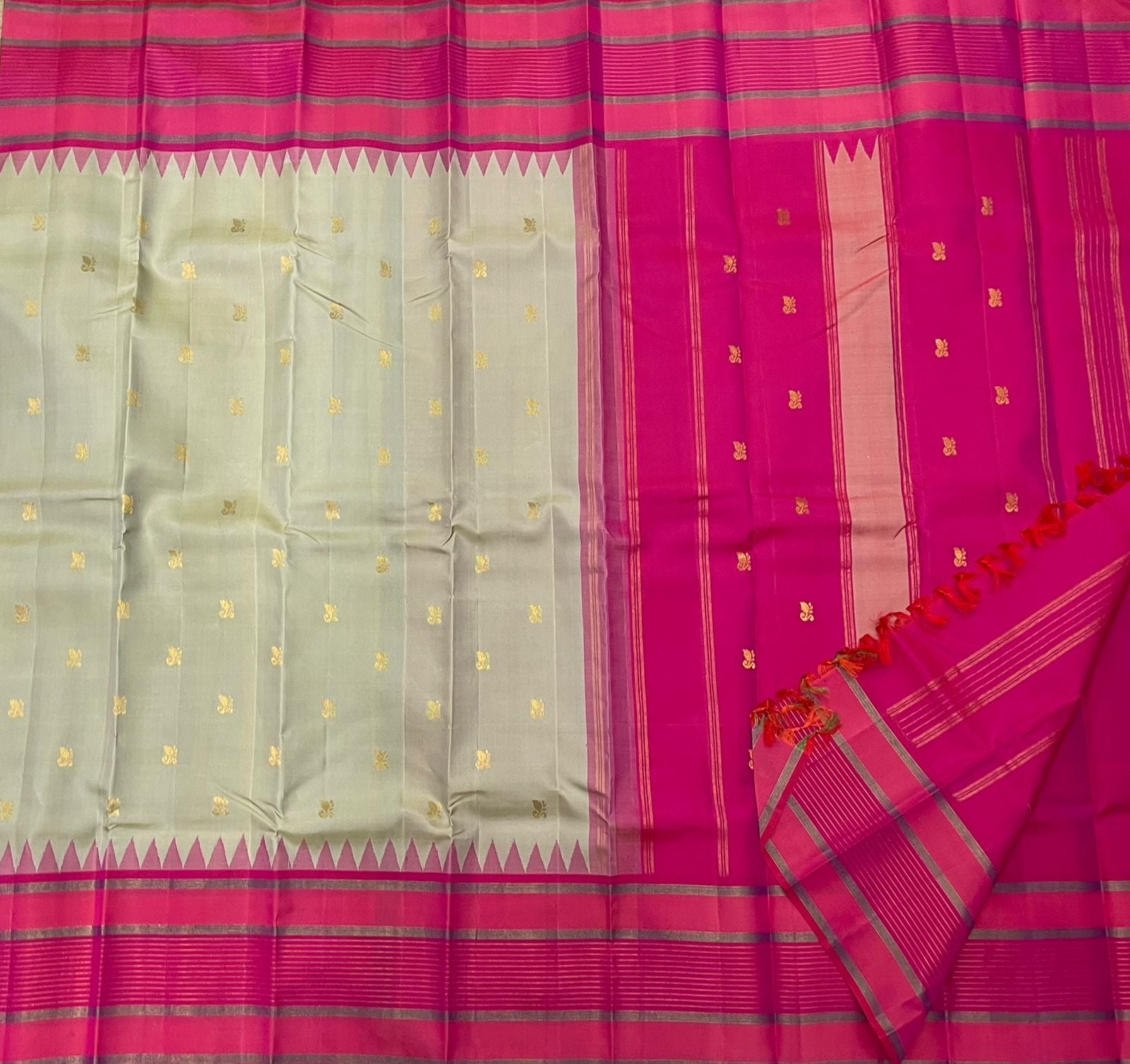Cardamom Roja • Pure Silk Kanchipuram Saree Pista Green with Gold Buttas • Rani Pink Contrast & Silver Zari Borders Silk Mark Certified • Free USA Shipping • Ships in Two Weeks ✅