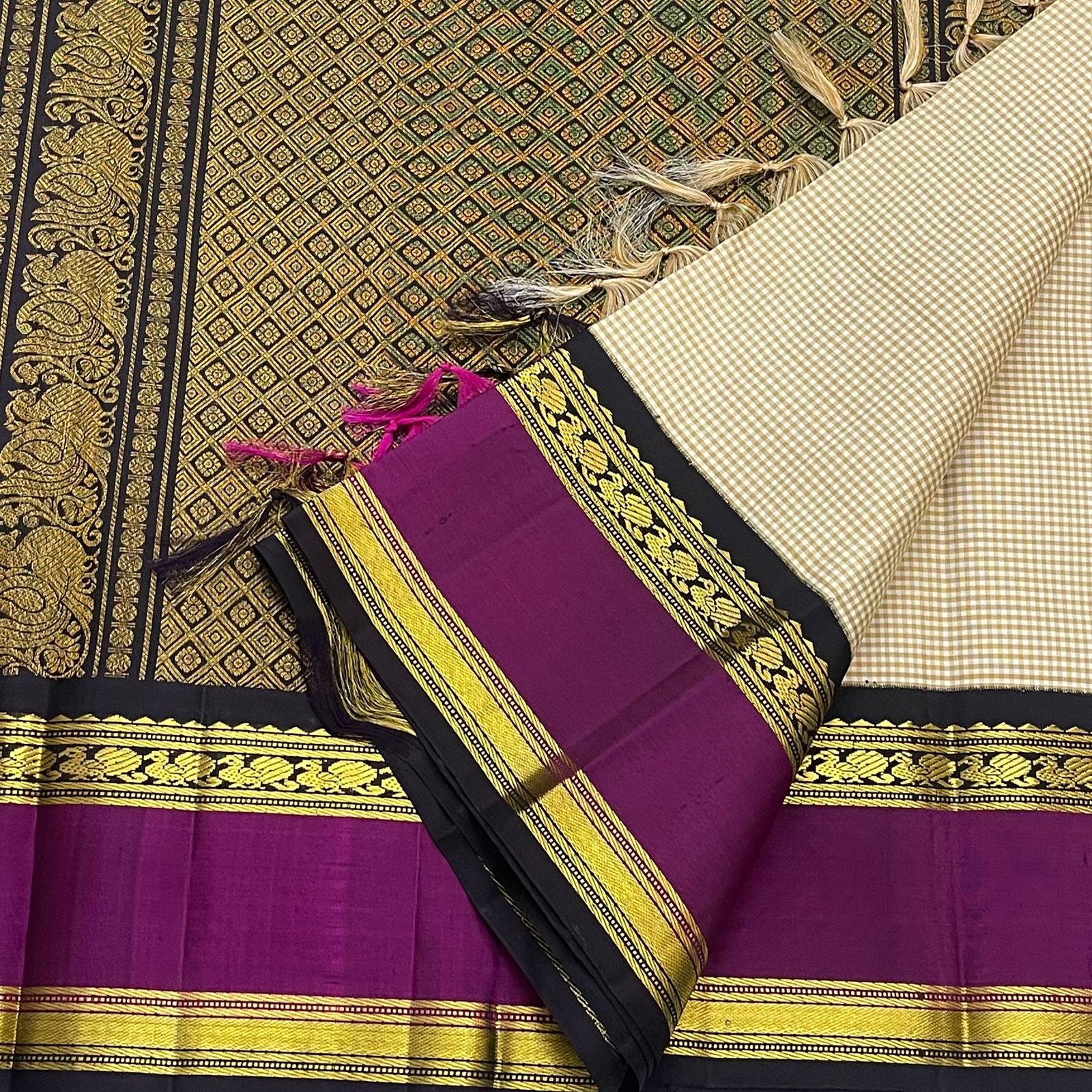 This exquisite Kanchipuram features a refined biscuit-beige ground woven in a delicate micro kattam (check) pattern—a tight ivory-sand grid that reads as elegant and light. This neutral body is stunningly framed by deep amethyst/rani-magenta borders and a bold, black-amethyst pallu, creating a sophisticated contrast of understated elegance and jewel-toned drama.