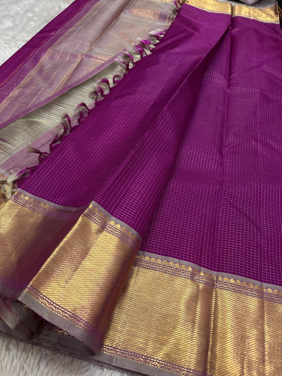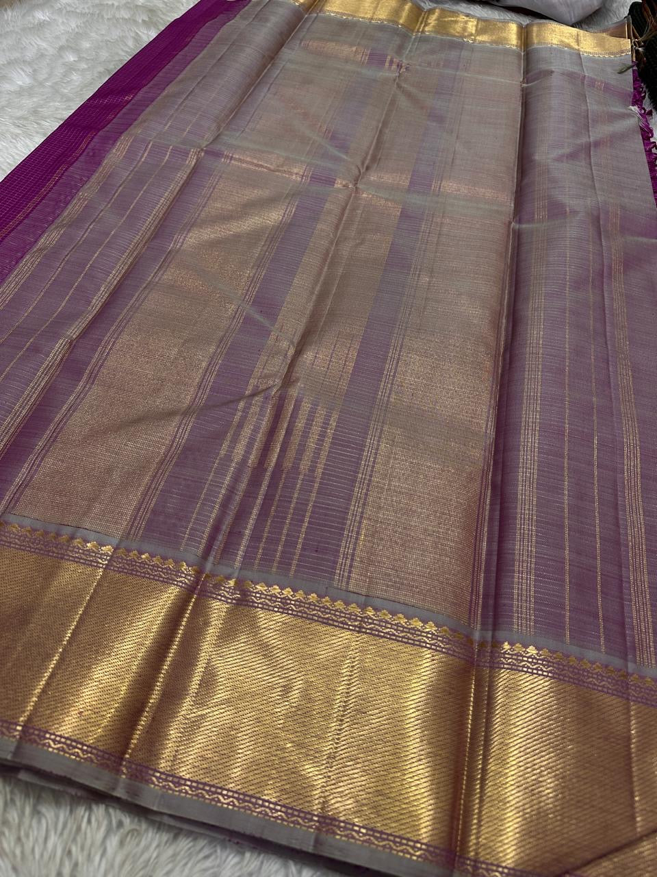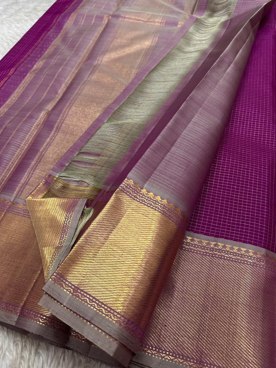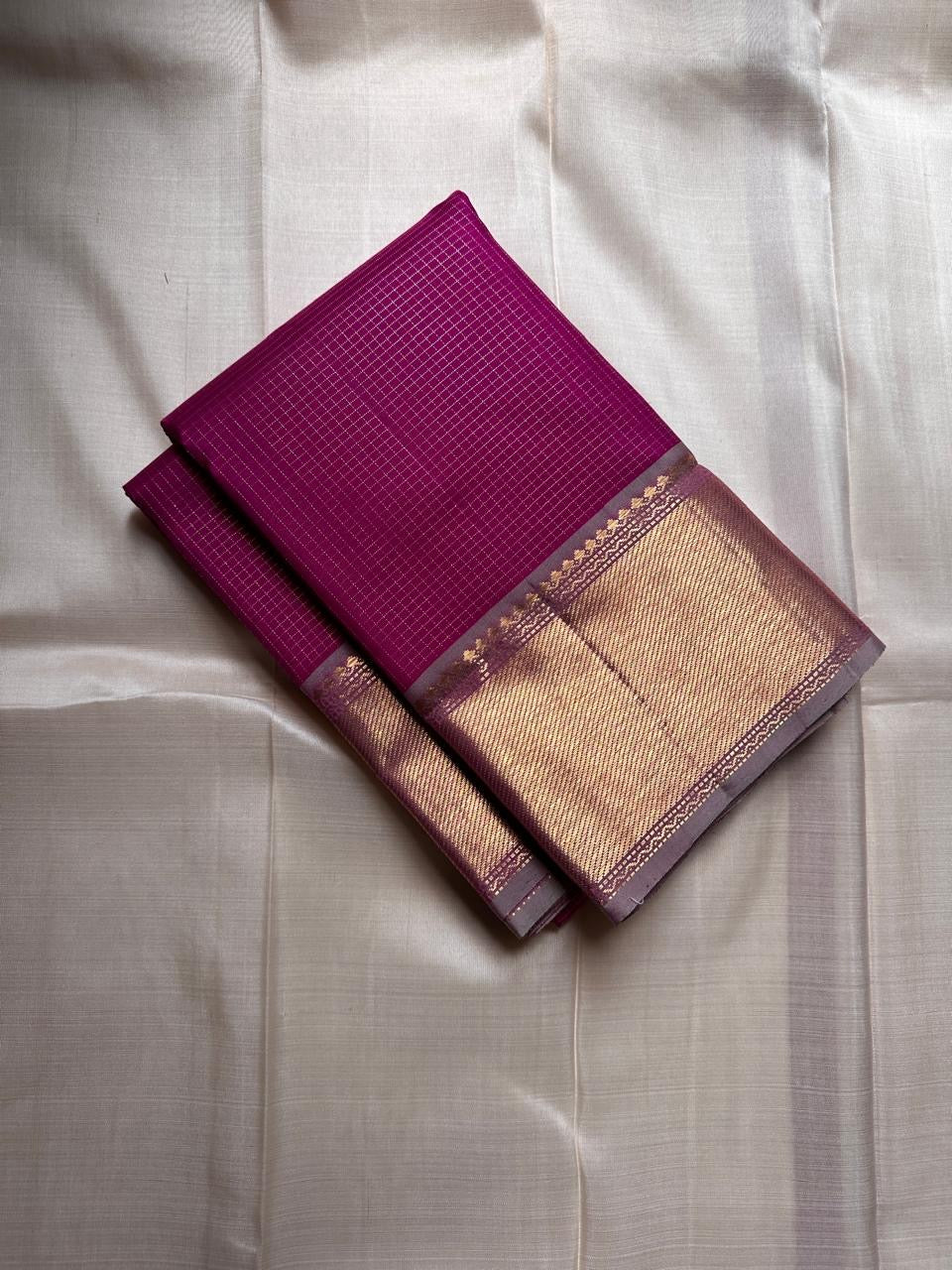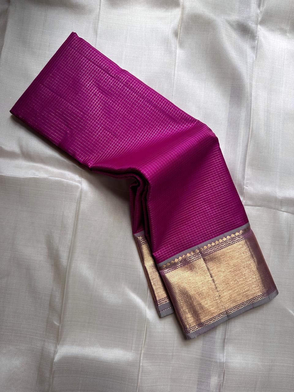 Graceful and luminous, Gulabi Rekha weaves together the charm of tradition with a modern sheen. The body shimmers in a radiant gulabi (pink–magenta) tone, adorned with a fine grid-like kattam (checked weave) in subtle zari. The contrast silver-gold zari border is minimal yet stately, lending an understated elegance. The soft tissue-style pallu unfolds in muted silver and gold with delicate zari striping, creating a versatile drape that glows beautifully in any light.