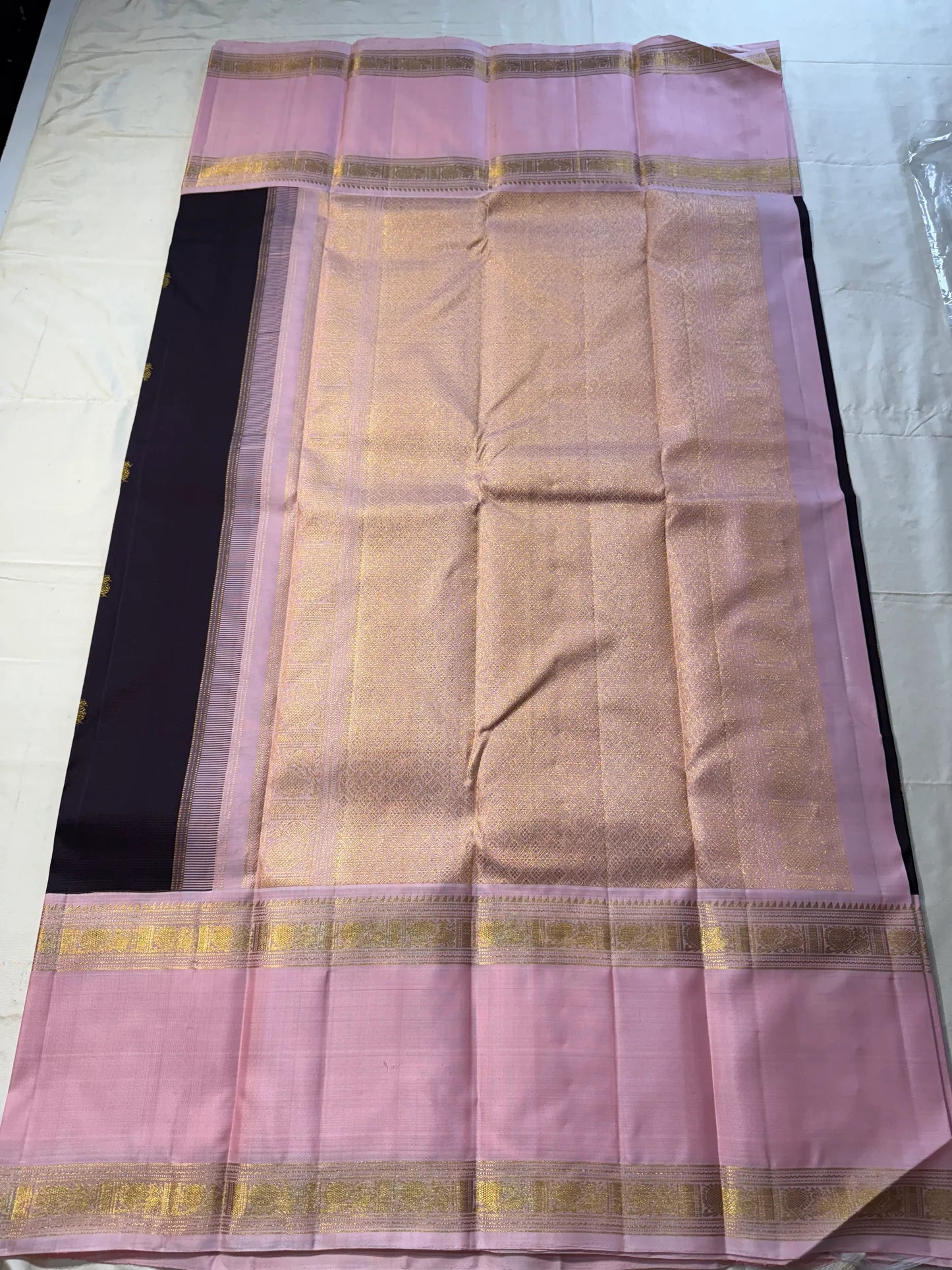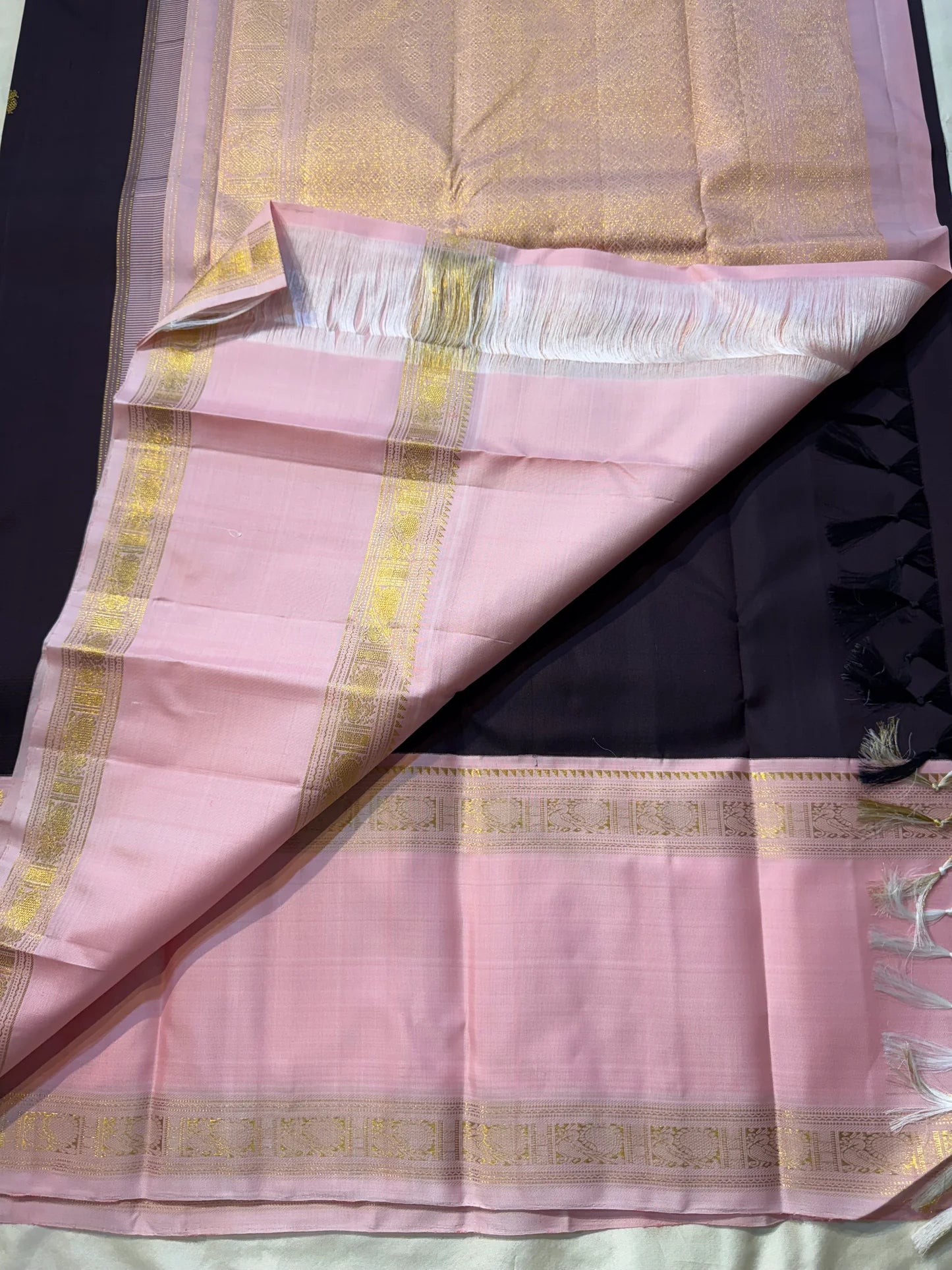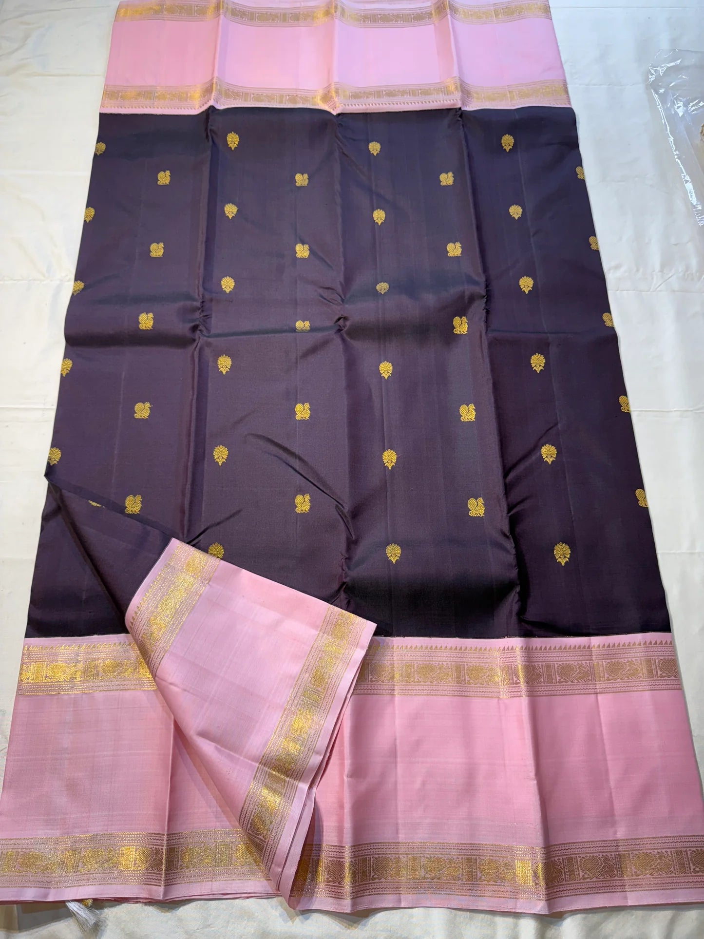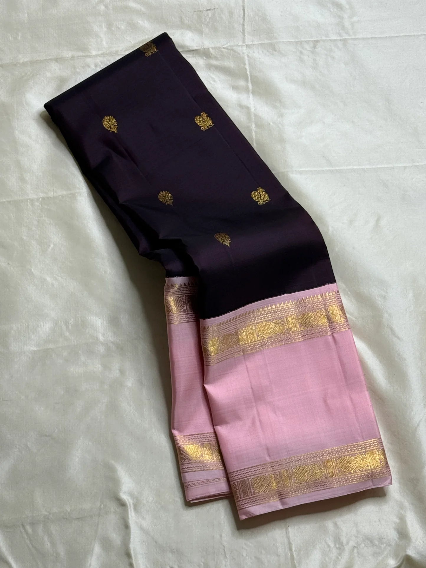 Aubergine & Rose Pink Pure Silk Kanchipuram Saree Gold paisley buttas across the rich aubergine body Contrast rose-pink korvai borders with floral zari work Opulent rose-pink brocade pallu with intricate jaal Silk Mark Certified • Ships in 2 Weeks•