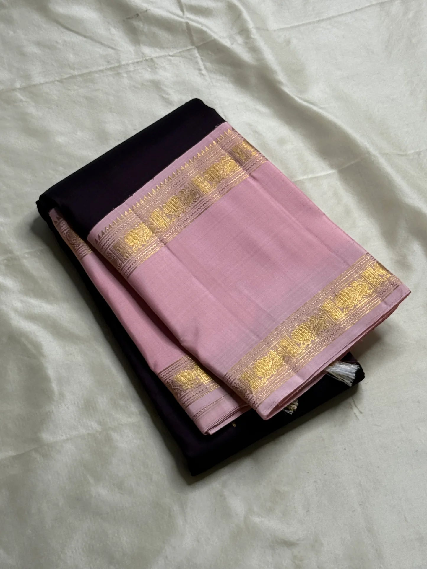 * Soft Rose-Pink Korvai Borders with Floral Zari Panels