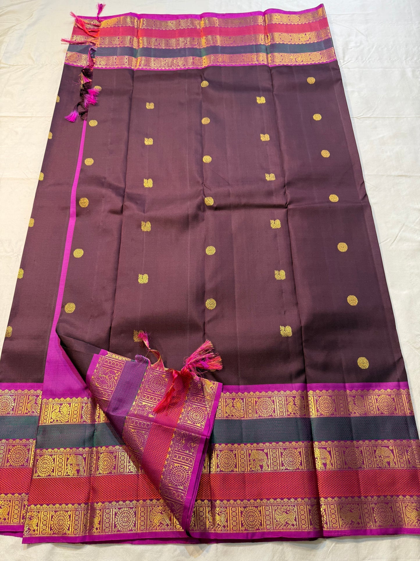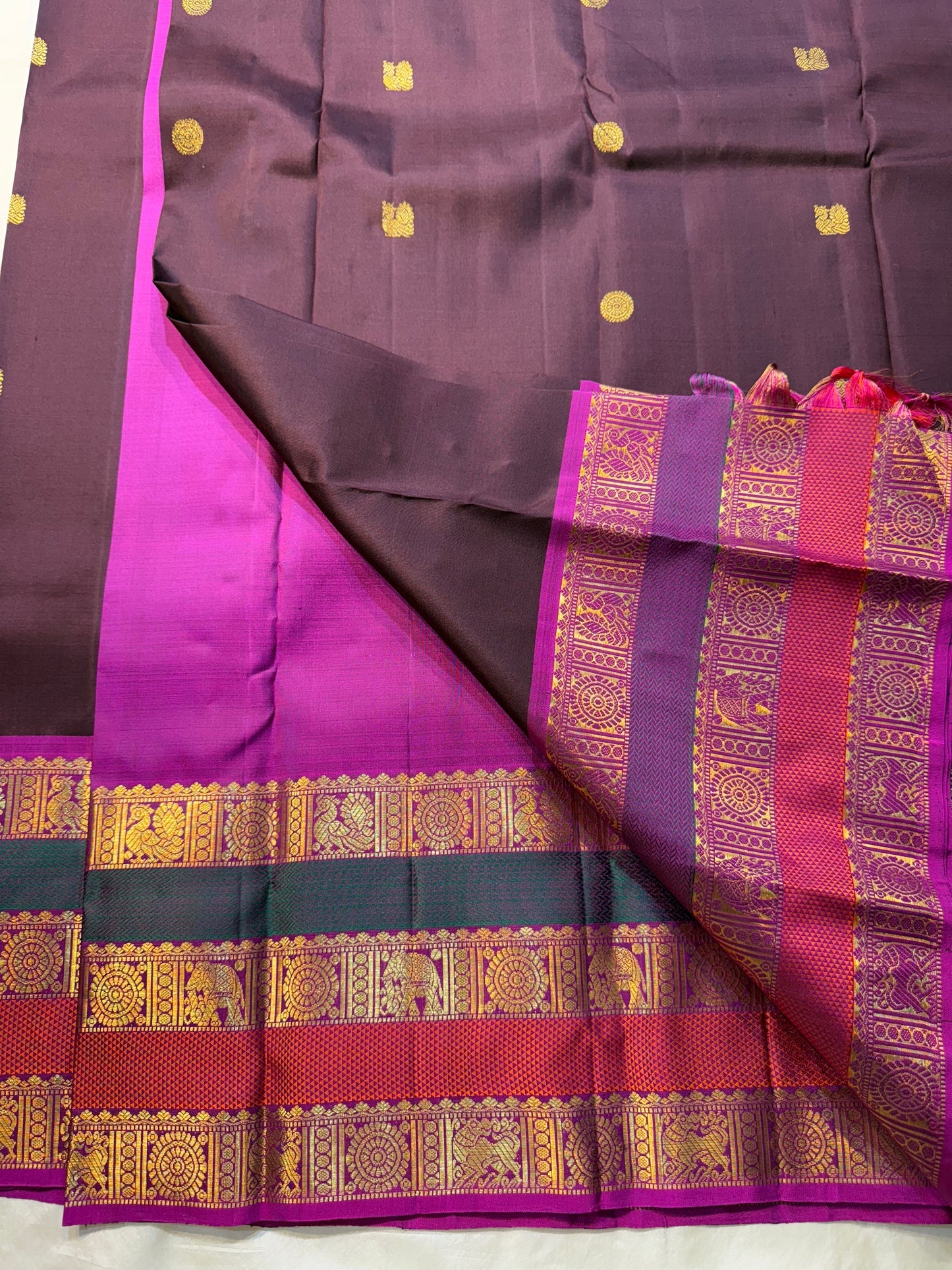 Pure Kanchipuram Silk Saree – Coffee Brown Body with Gold Zari Buttas & Rani Pink Korvai Borders