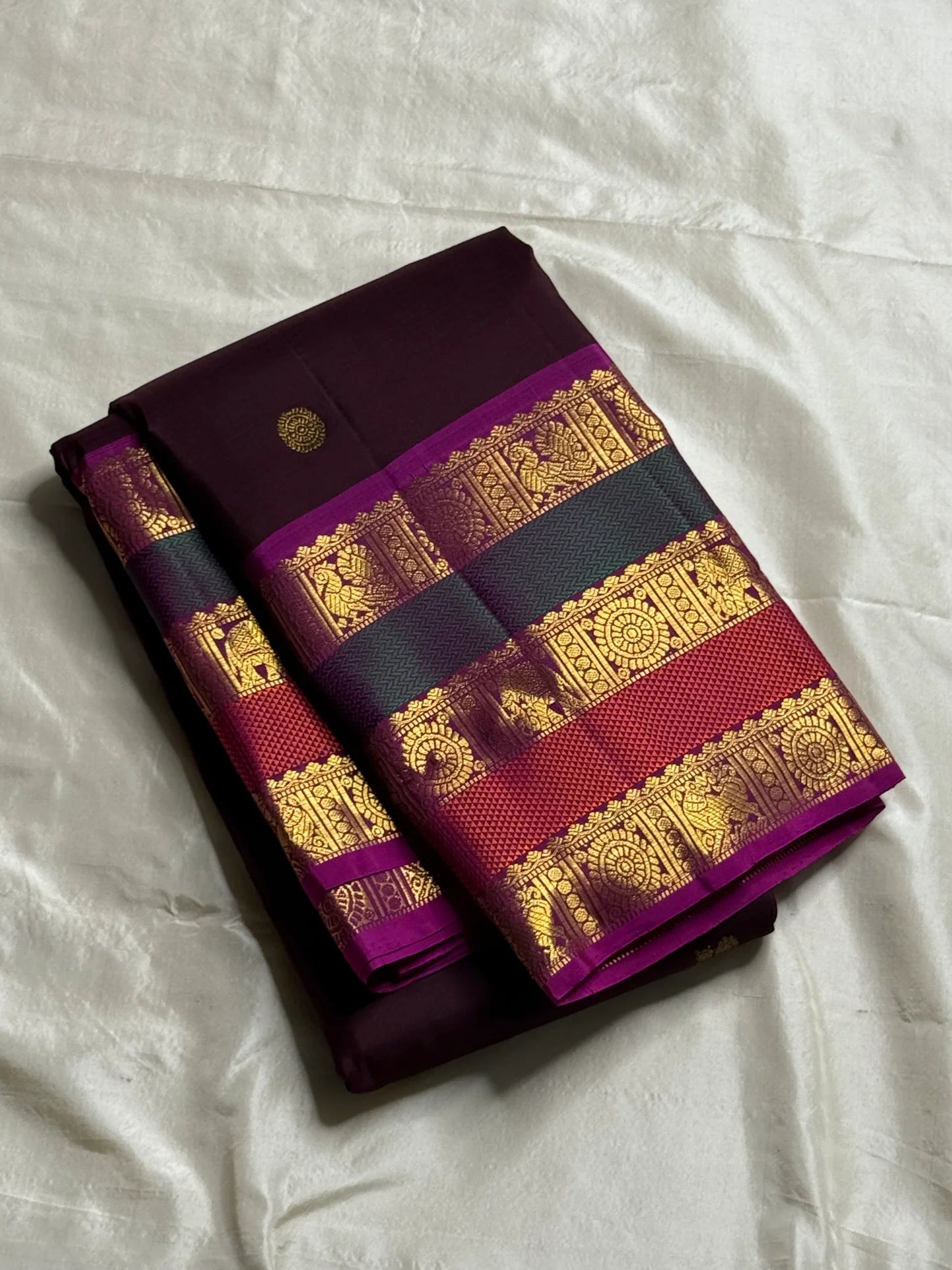 A masterpiece of earthy elegance, Coffee Brown Rajam blends rich tradition with regal charm. The body is a deep coffee brown shade, adorned with dainty gold zari buttas for subtle shimmer. The striking rani pink korvai borders are intricately woven with temple, peacock, and elephant motifs in antique-gold zari, framed with fine muthu–reku edging. The look is completed with a grand rani pink pallu, featuring vertical zari stripes and heritage brocade patterns, finished with hand-knotted tassels. This drape is perfect for weddings, temple visits, and festive occasions.