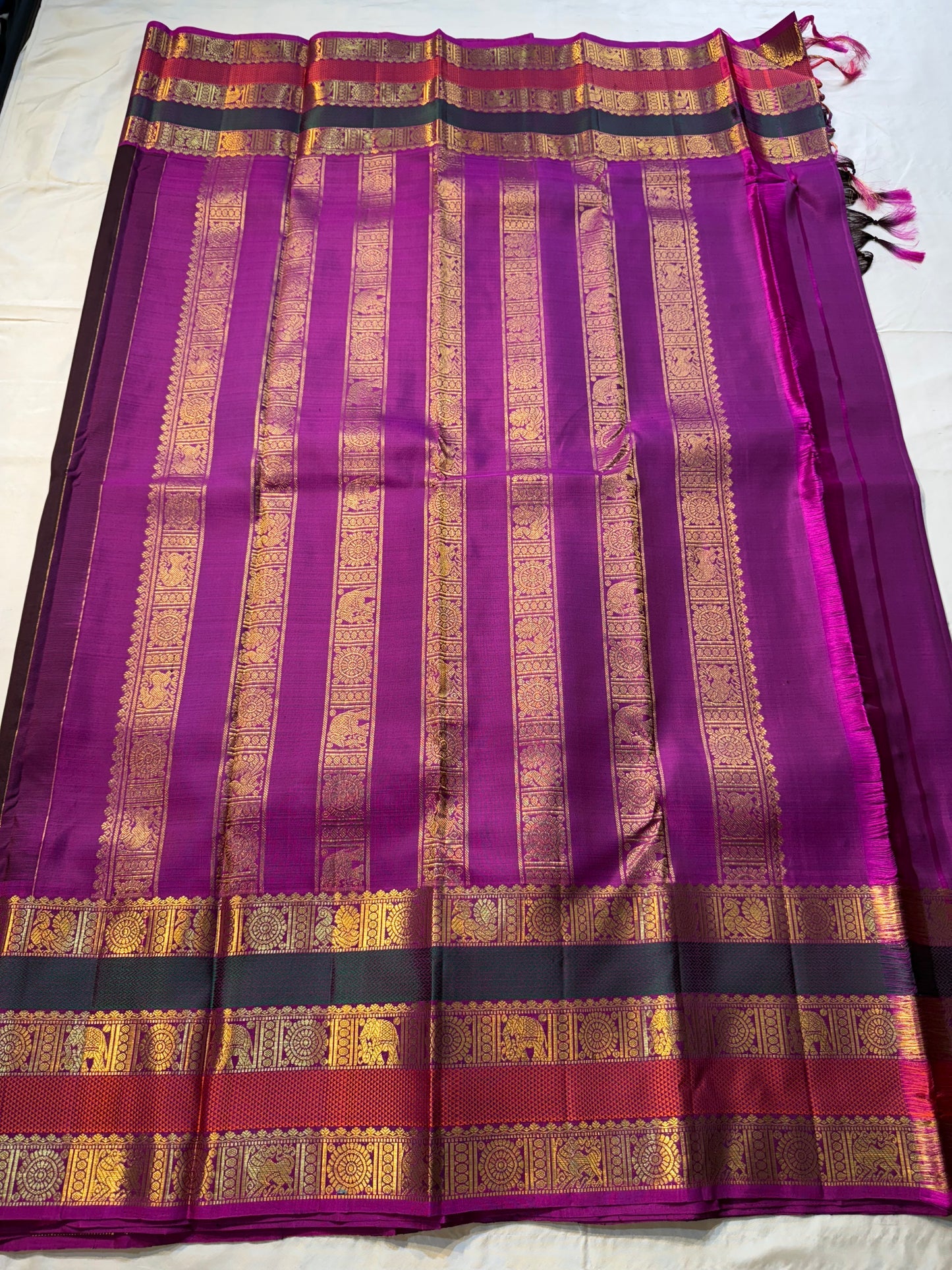 Coffee Brown Rajam – Pure Kanchipuram Silk Saree Coffee Brown Body with Gold Zari Buttas Rani Pink Korvai Borders with Temple, Peacock & Elephant Motifs Grand Rani Pink Zari Brocade Pallu with Vertical Stripes & Tassels Silk Mark | ships in two weeks