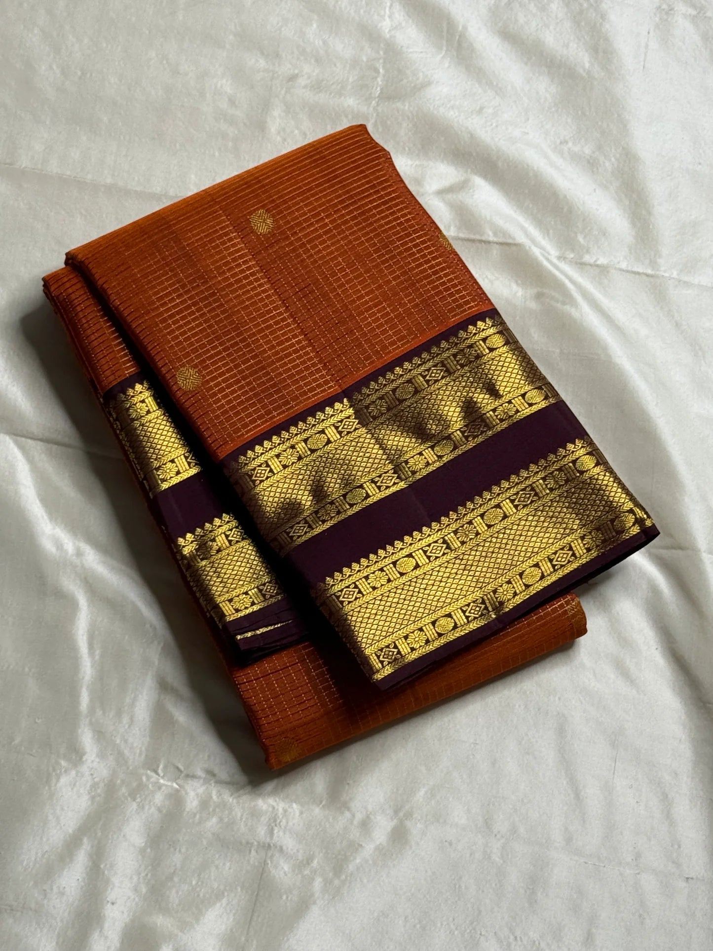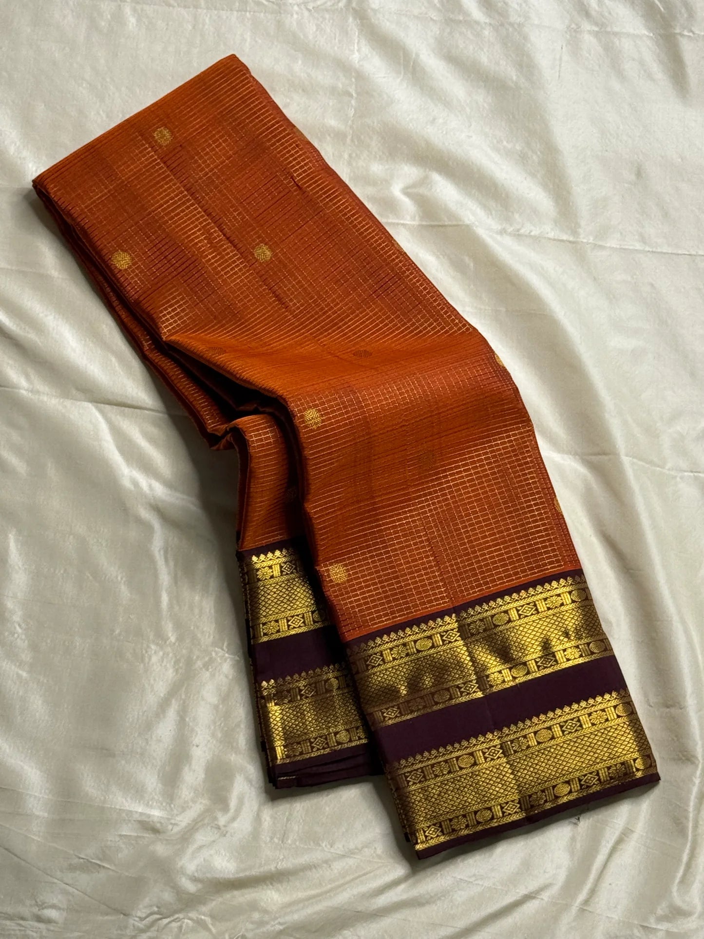 A luminous rust-orange kattam (micro-checks) saree adorned with petite gold buttas and finished with a traditional rettapet korvai join that pairs the body with a deep aubergine border. The grand border is layered with gold zari panels and kaddi lines, leading into a magnificent zari brocade pallu woven with diamond and chevron motifs — a true statement piece for festive and wedding celebrations.