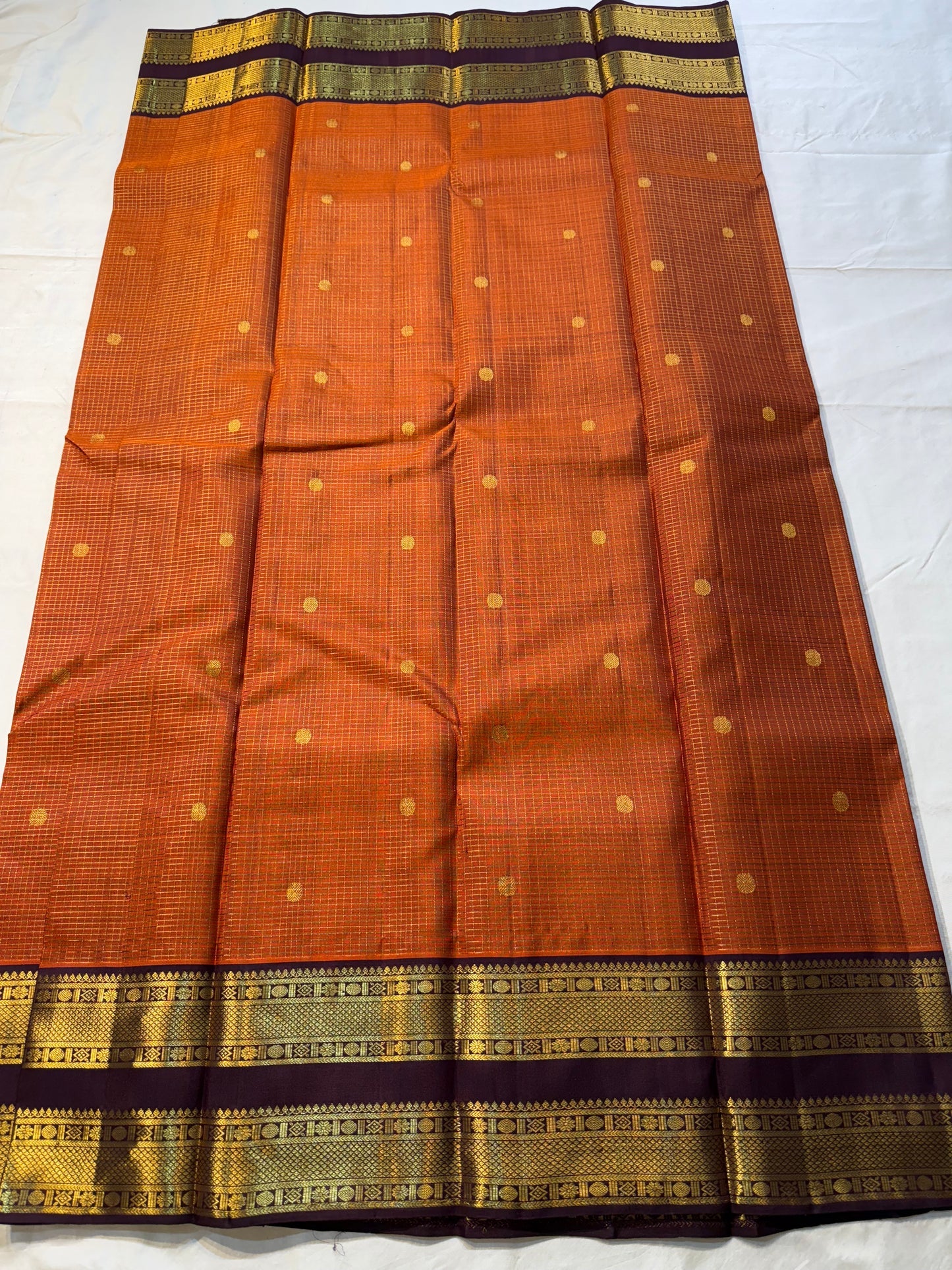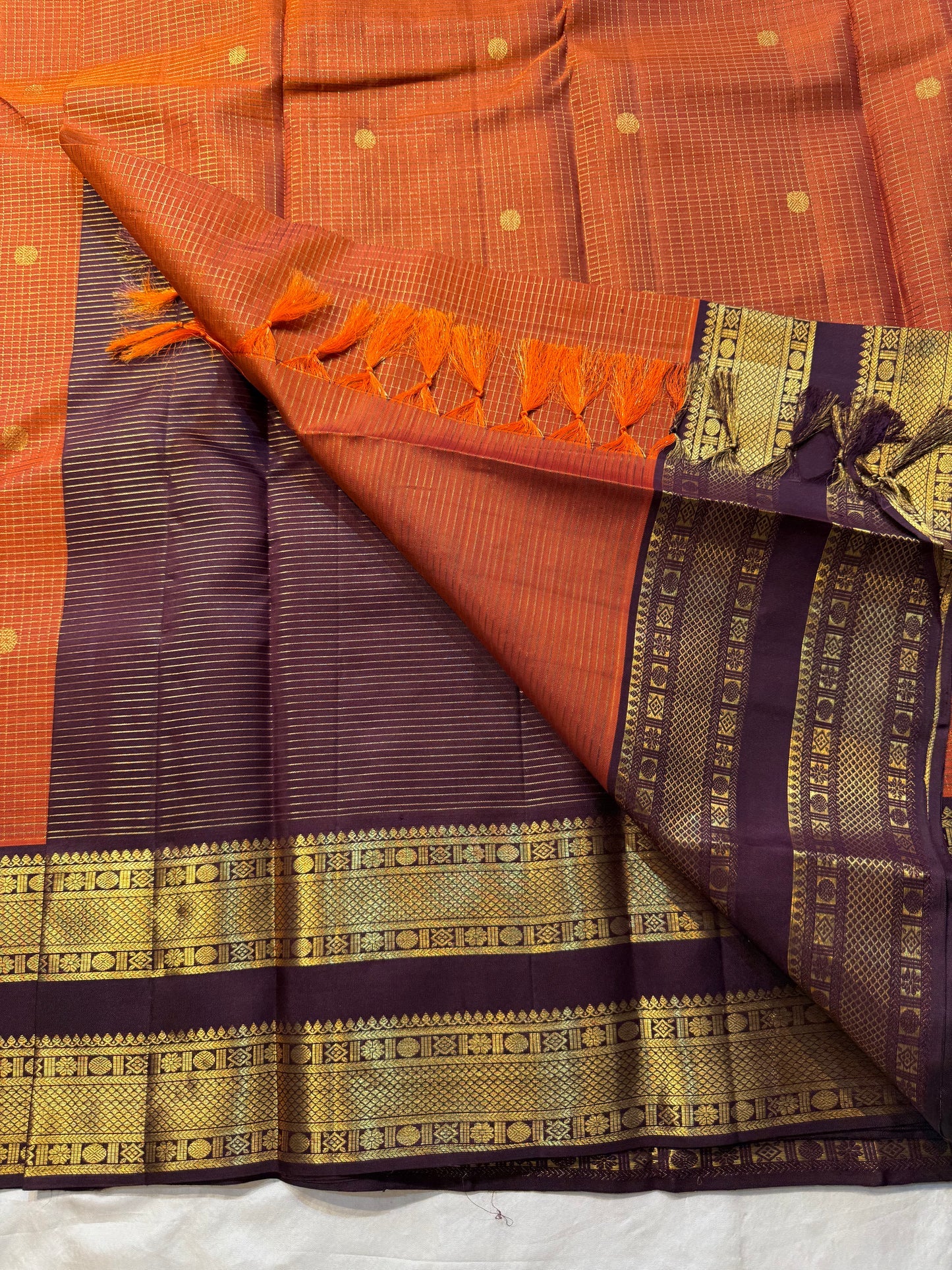 Rust Orange Kattam Rettapet – Pure Silk Kanchipuram Saree Rust Orange Body with Petite Gold Buttas & Fine Kattam Grid Deep Aubergine Rettapet Korvai Double-Line Contrast Border Rich Zari Diamond & Chevron Brocade Pallu Comes with Contrast Aubergine Blouse