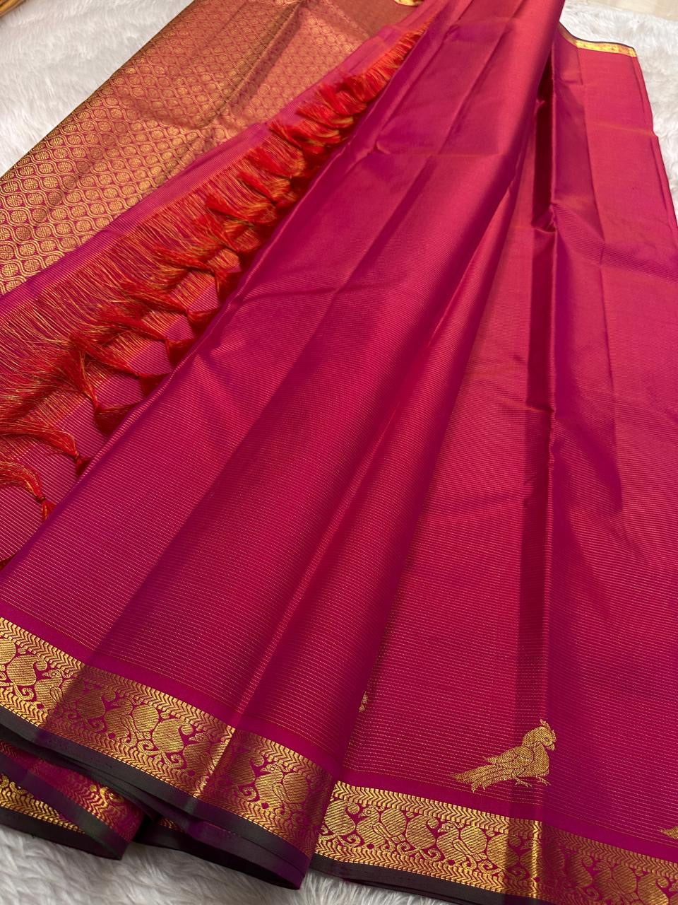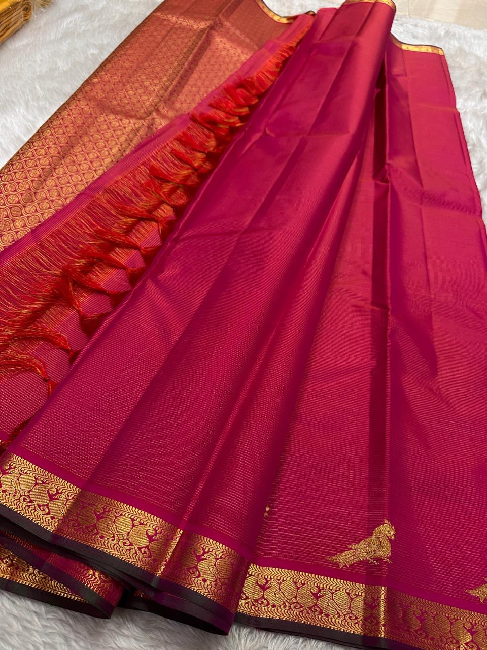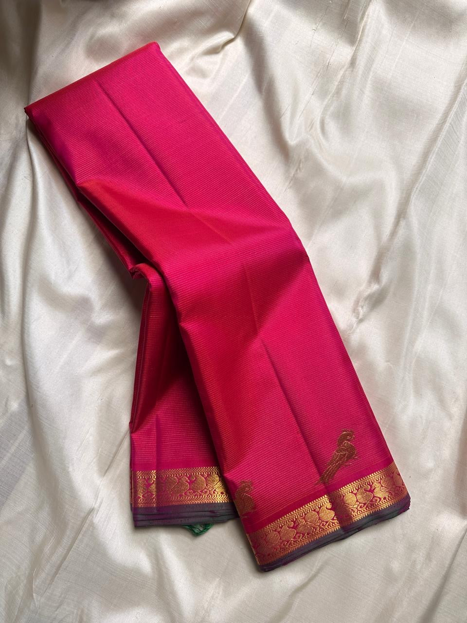 View compareVairaoosi Kili – Pink ✨ Pure Silk Kanchipuram Saree with Delicate Parrot Motifs 🕊️ Vanki Neli Zari Border 🌿 with peacock and paisley motifs & Opulent Brocade Pallu ✨