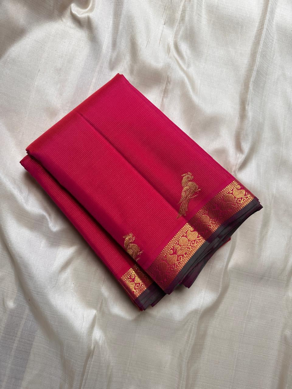 Vairaoosi Kili – Red celebrates the brilliance of vairaoosi weaving in a radiant red body, beautifully adorned with delicate gold kili (parrot) motifs that symbolize joy and prosperity. The shimmering texture of the vairaoosi technique adds depth and luminosity, making this saree truly timeless.