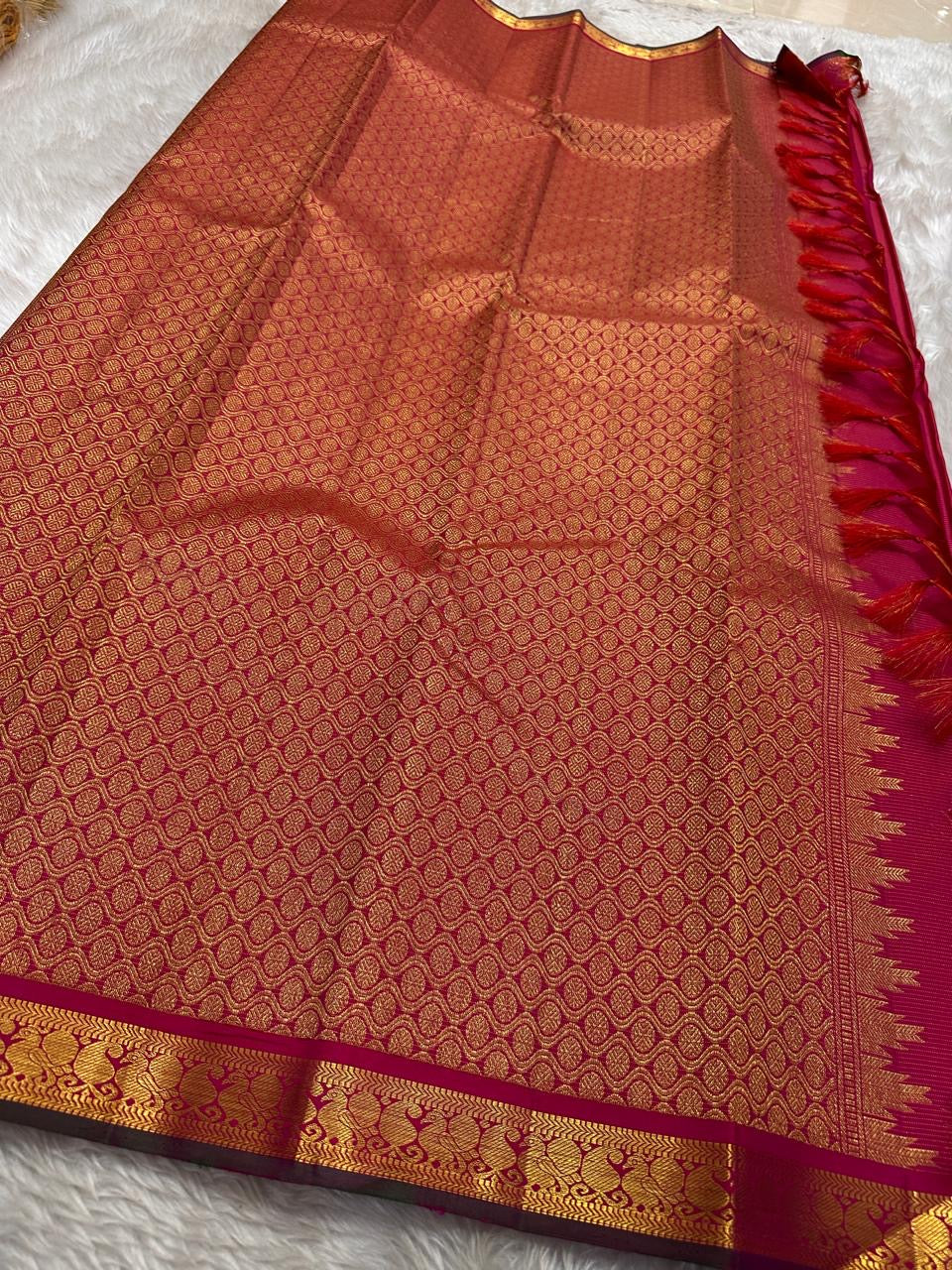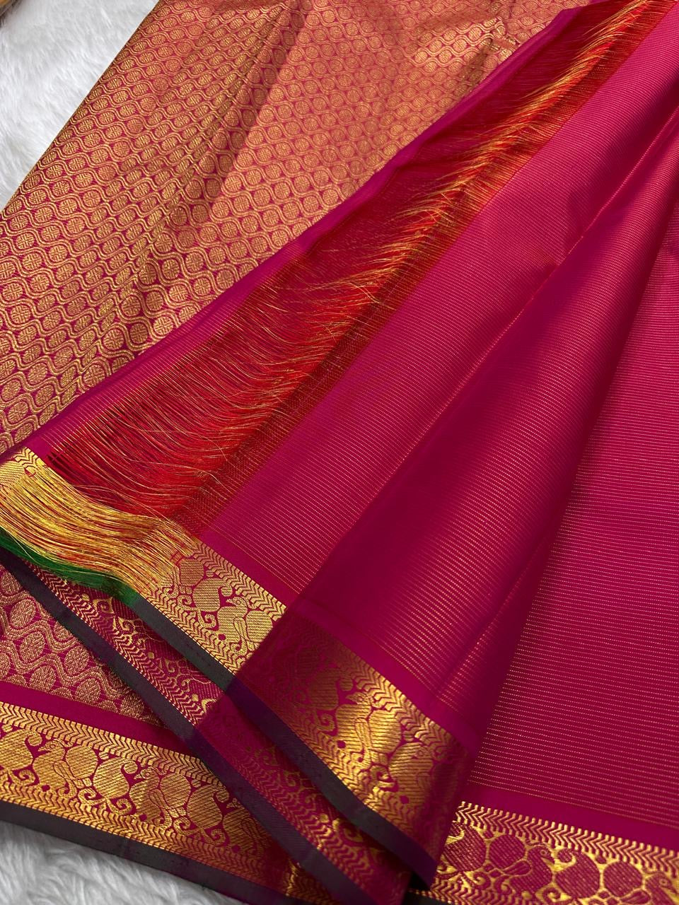 The saree features a traditional vanki neli border enriched with arai maadam and rudhraksham pet details, echoing heritage and auspiciousness. The border glows with an opulent grid zari weave, adding grandeur to every fold. The pallu continues the richness with intricate zari artistry, creating the perfect balance of tradition and elegance.
