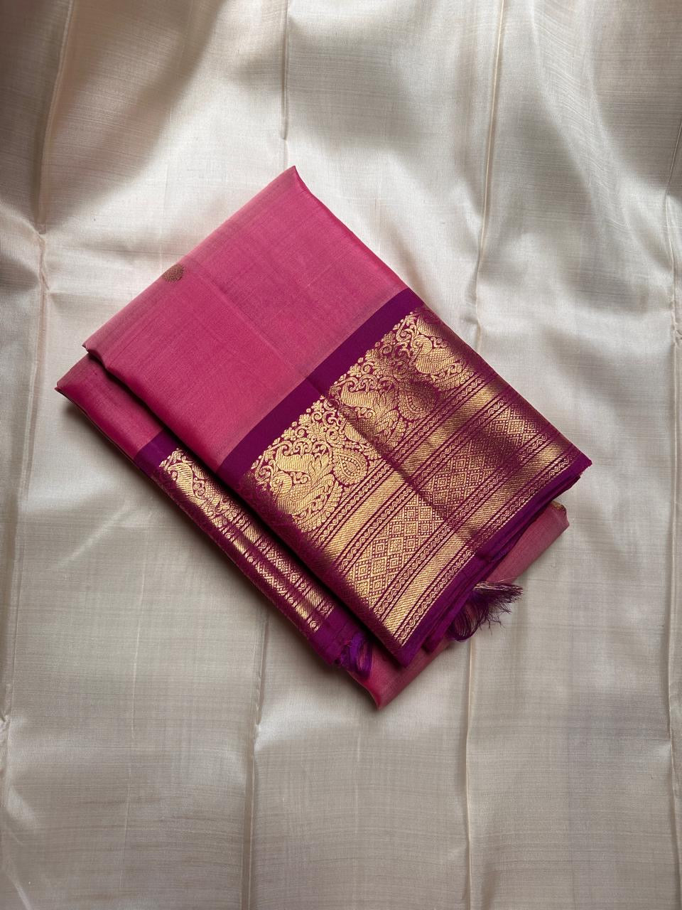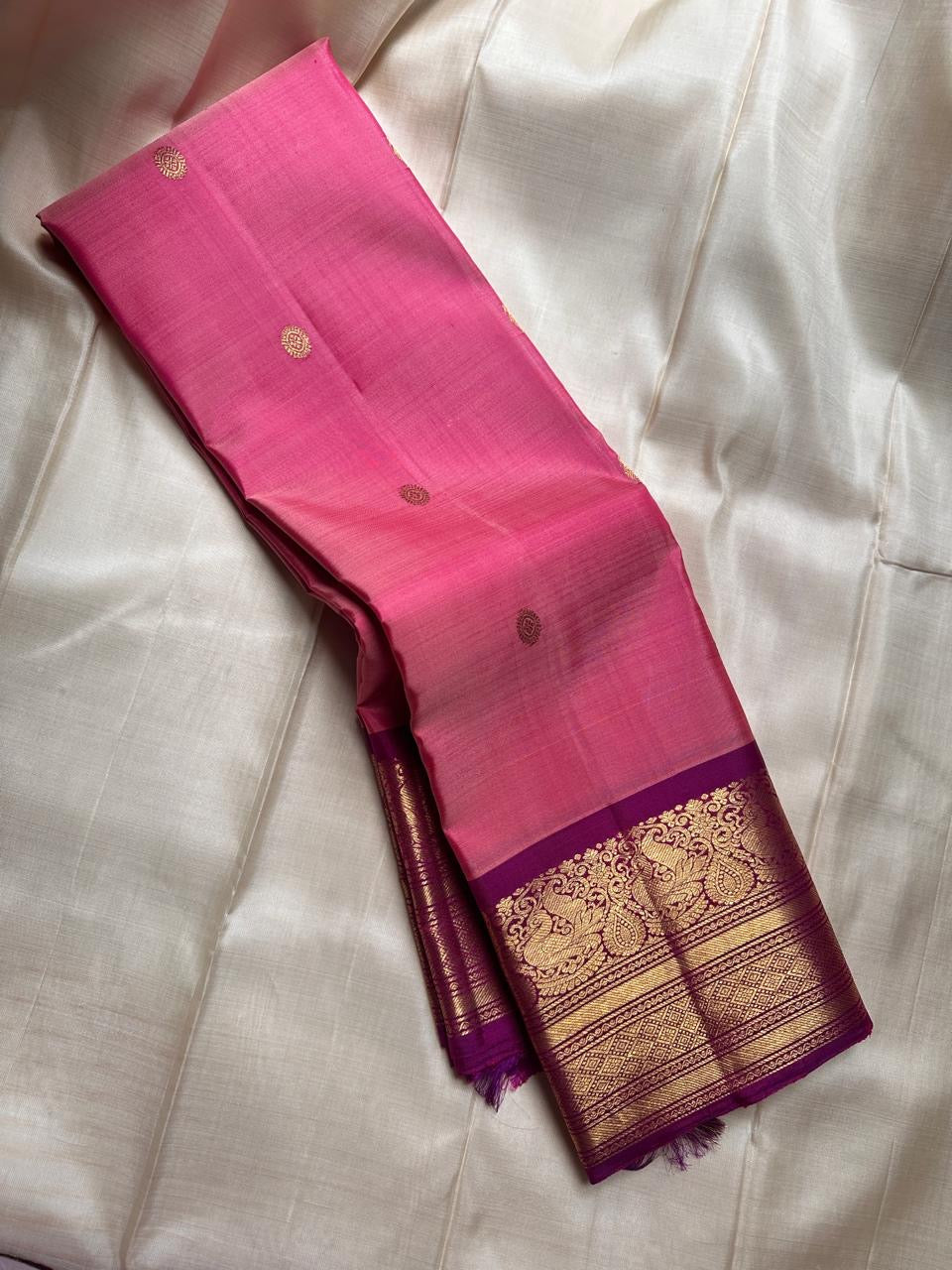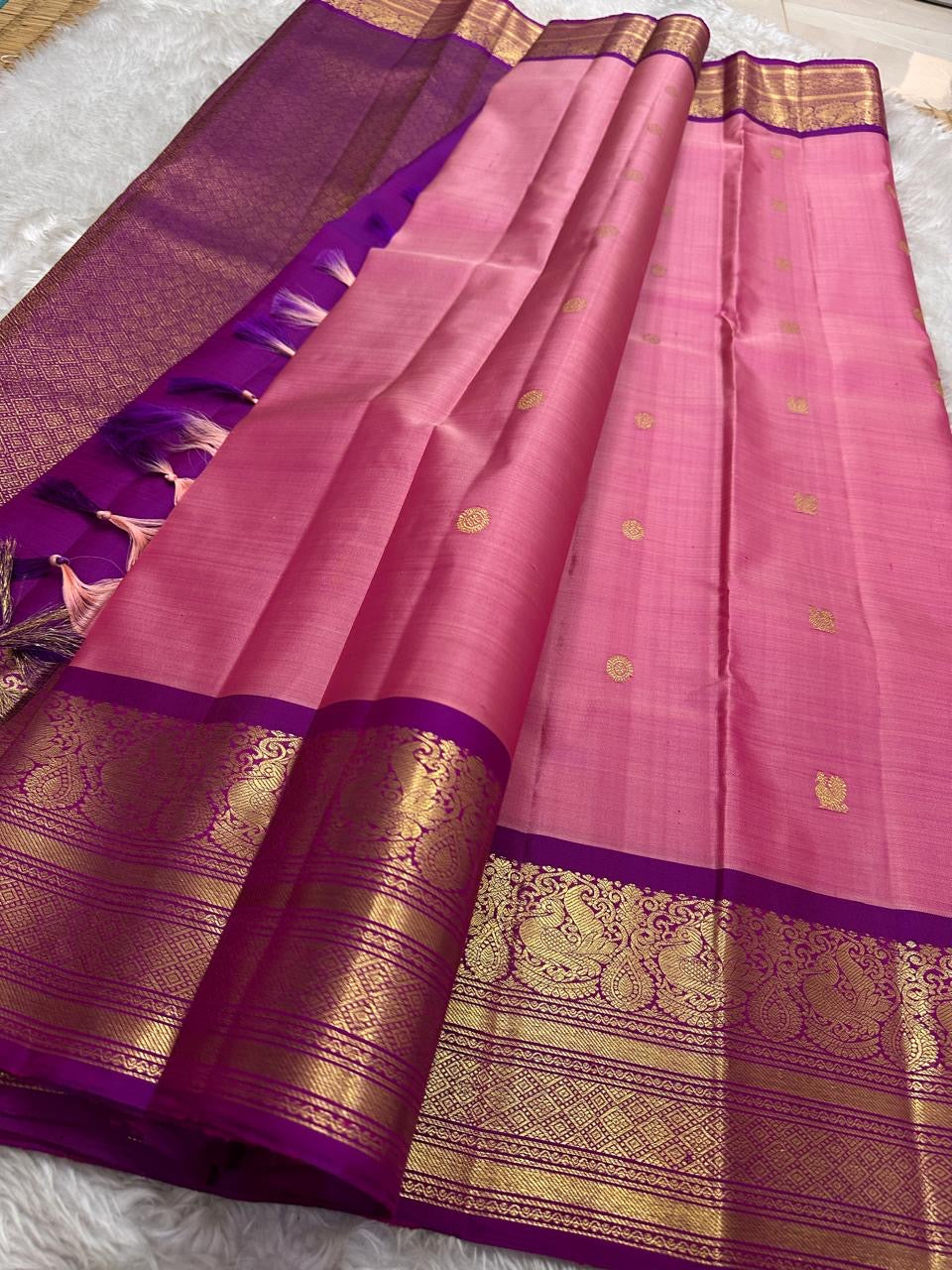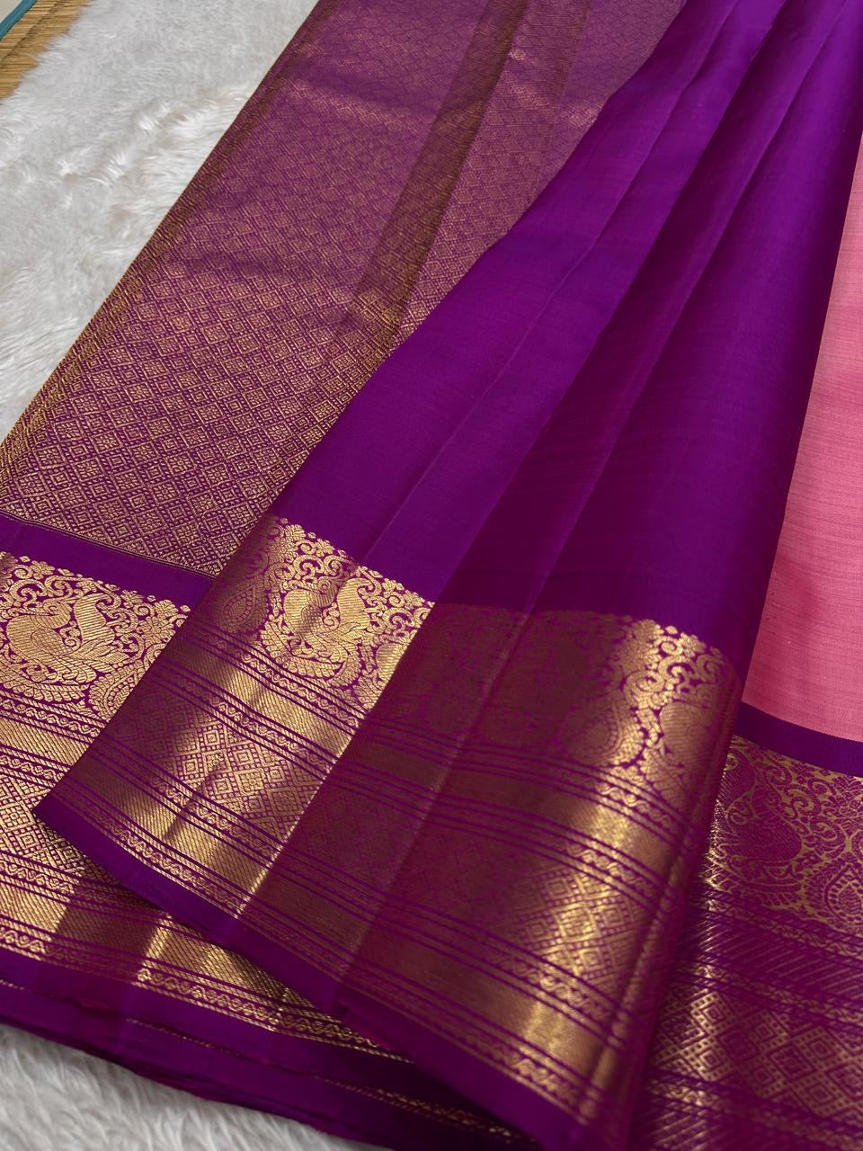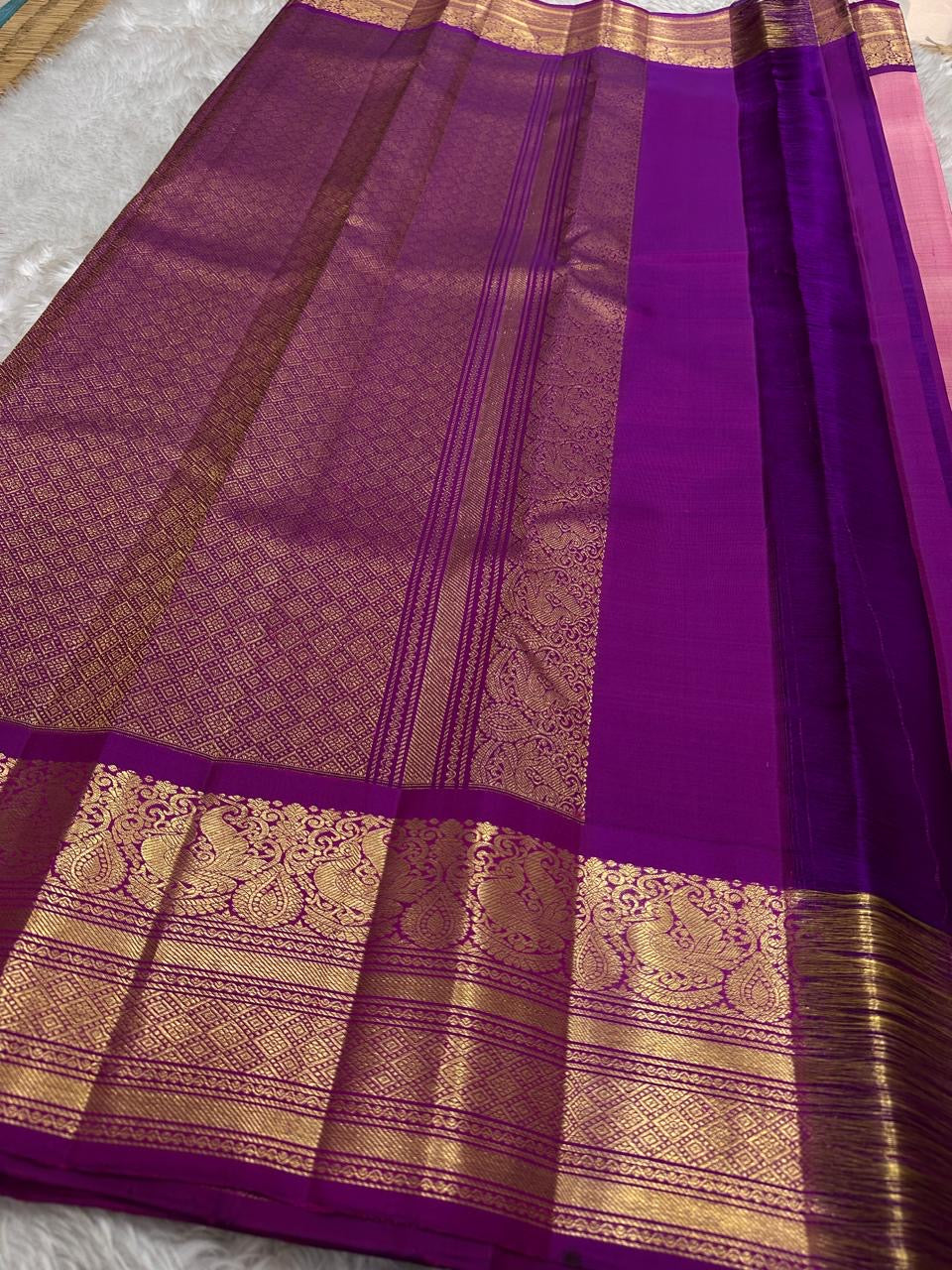 A dazzling blend of pink and purple silk, enriched with golden zari for a look that’s both festive and feminine.
