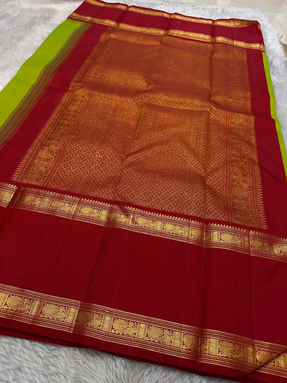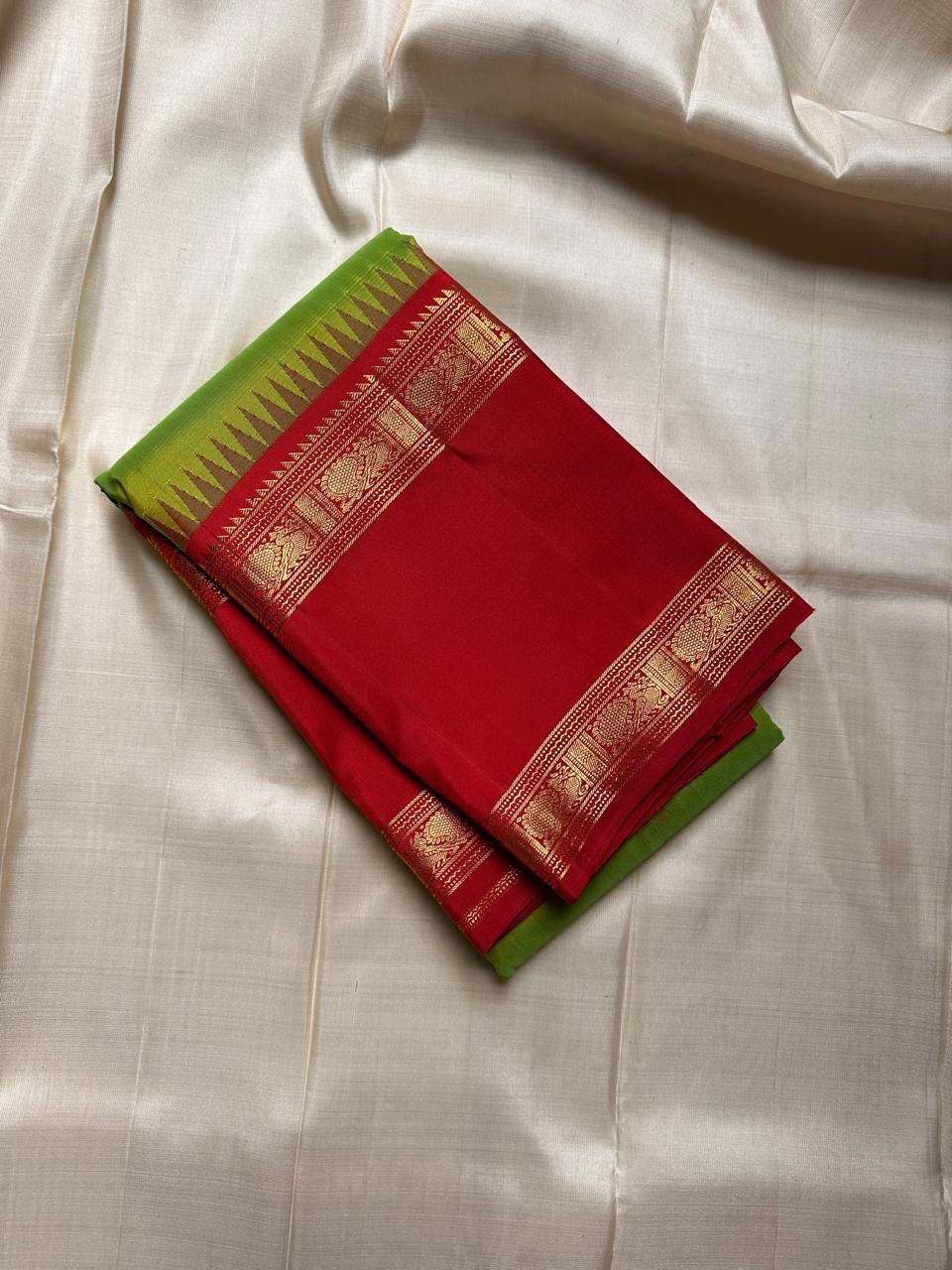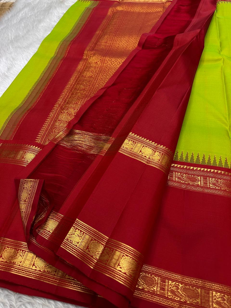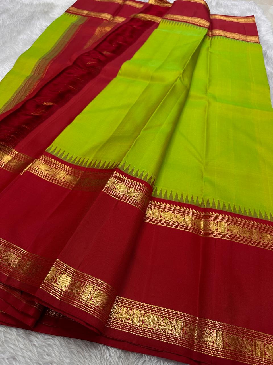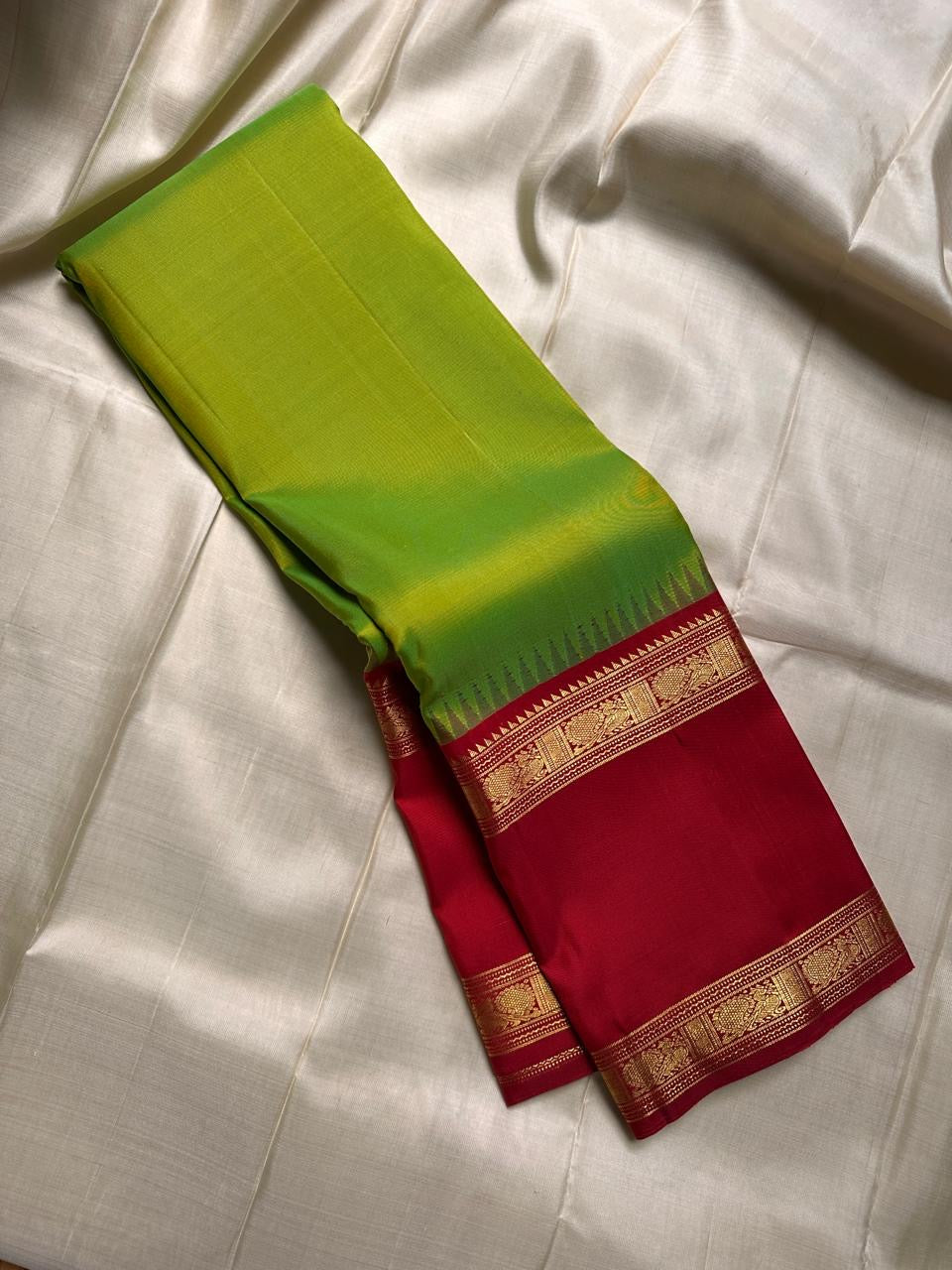 Ramani – Lime & Grass Green Pure Kanchipuram Silk shot color Saree with Red Rettapet Border with mayil zari motif and Rich 2G Zari Pallu