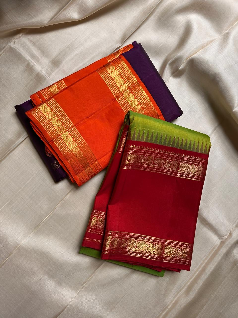 - Border: Red rettapet with handwoven mayil (peacock) zari motifs