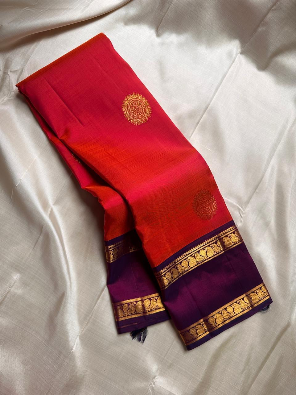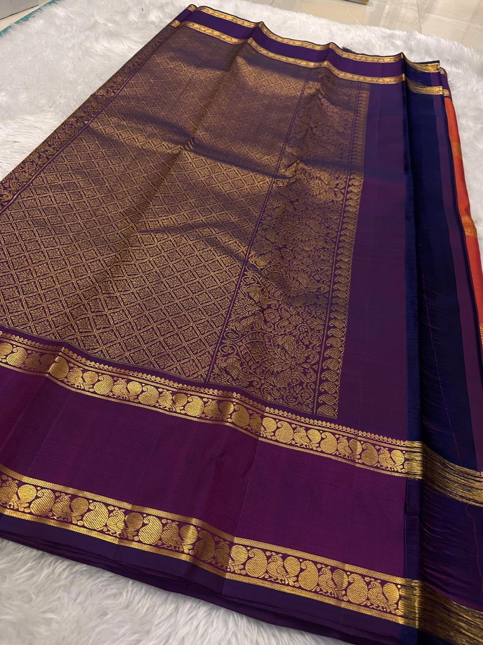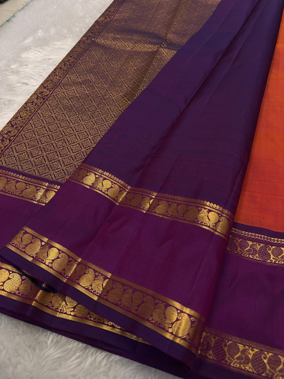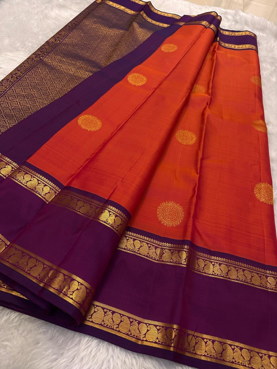 Bright marigold orange with purple rettapet border Mayil motif and beautiful mandala kamalam butta all over the pure silk Kanchipuram saree