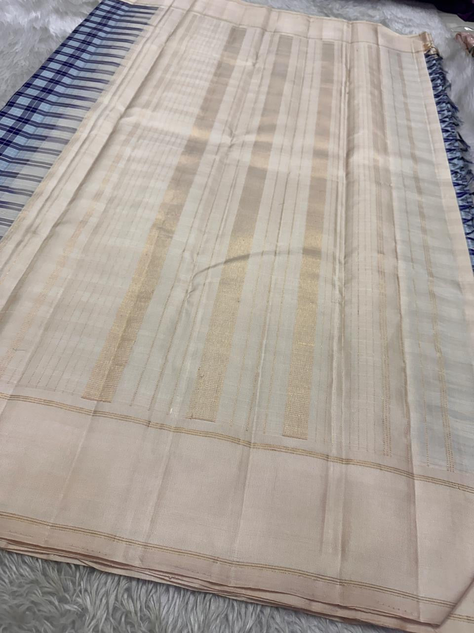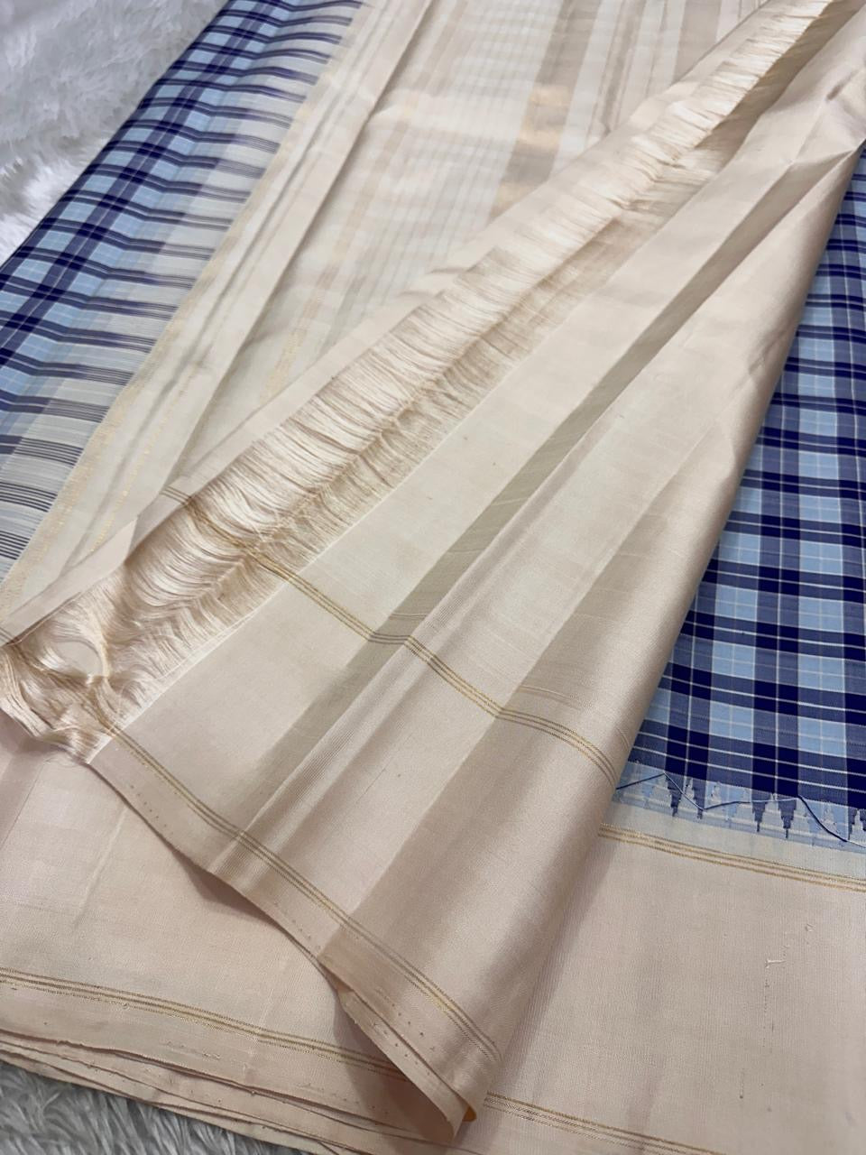 Handwoven in pure Kanchipuram silk, the saree features miniature podi kattam checks in navy, pastel blue, silver, grey, and cream—an elegant interplay of depth and light. The border, in soft cream silk, is detailed with fine zari stripes that lend quiet richness to the drape.