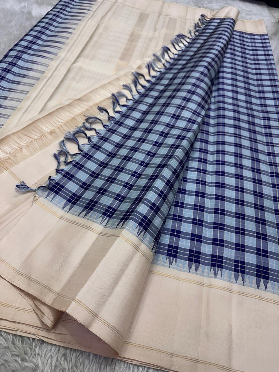 Nirai – Pure Kanchipuram Silk Saree with Navy, Pastel Blue & Cream Checks and Cream Zari Border