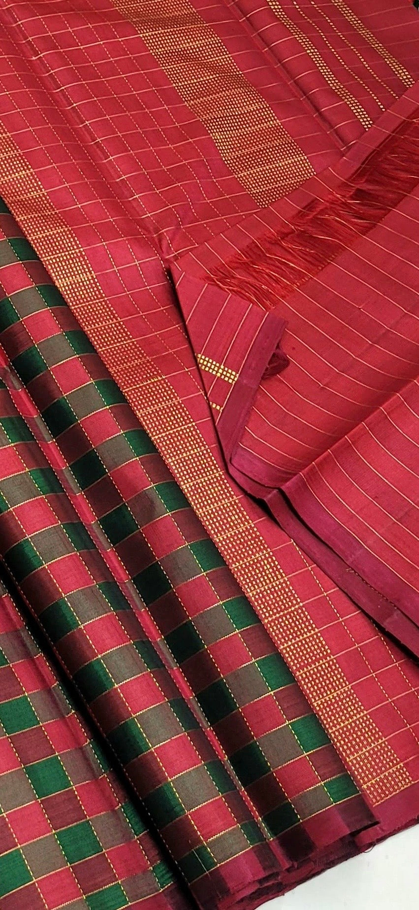 Red green maroon and gold checks pure silk Kanchipuram with seer zari Pallu