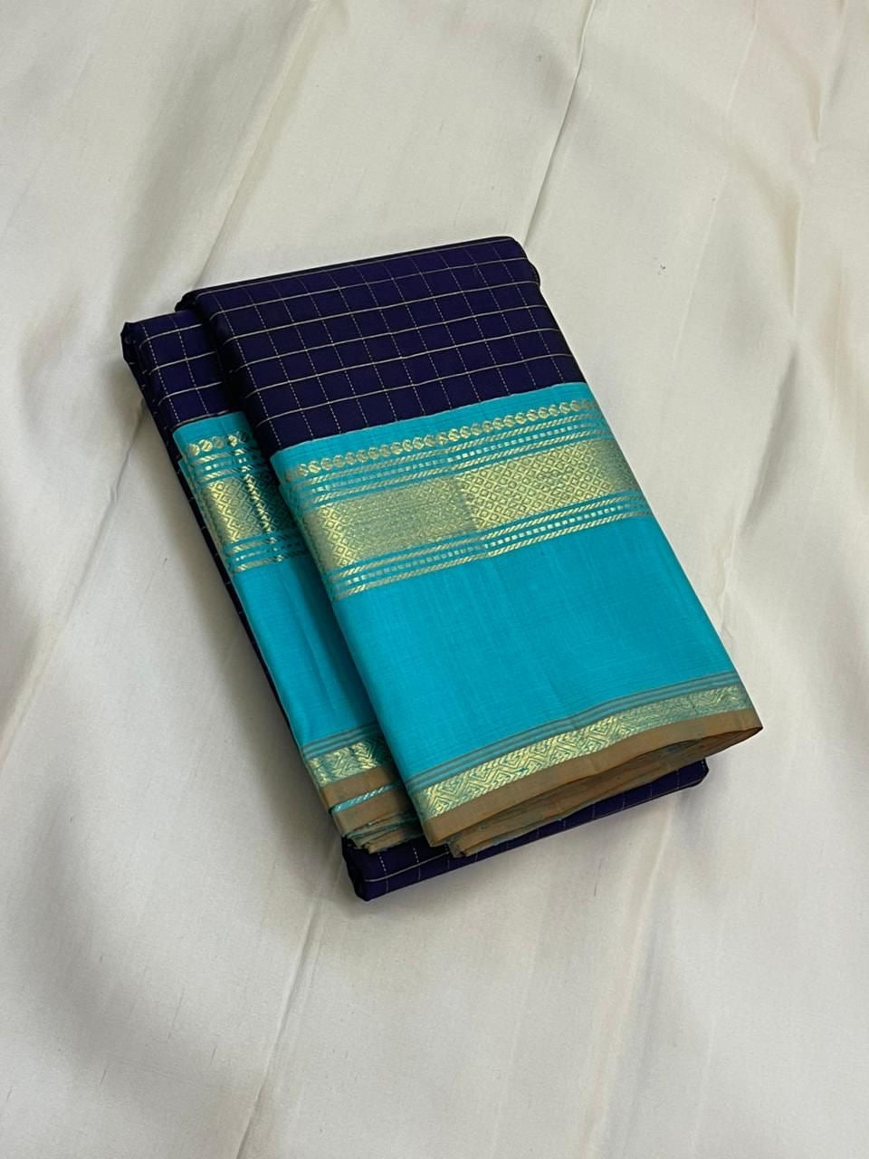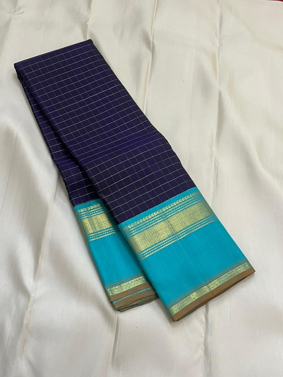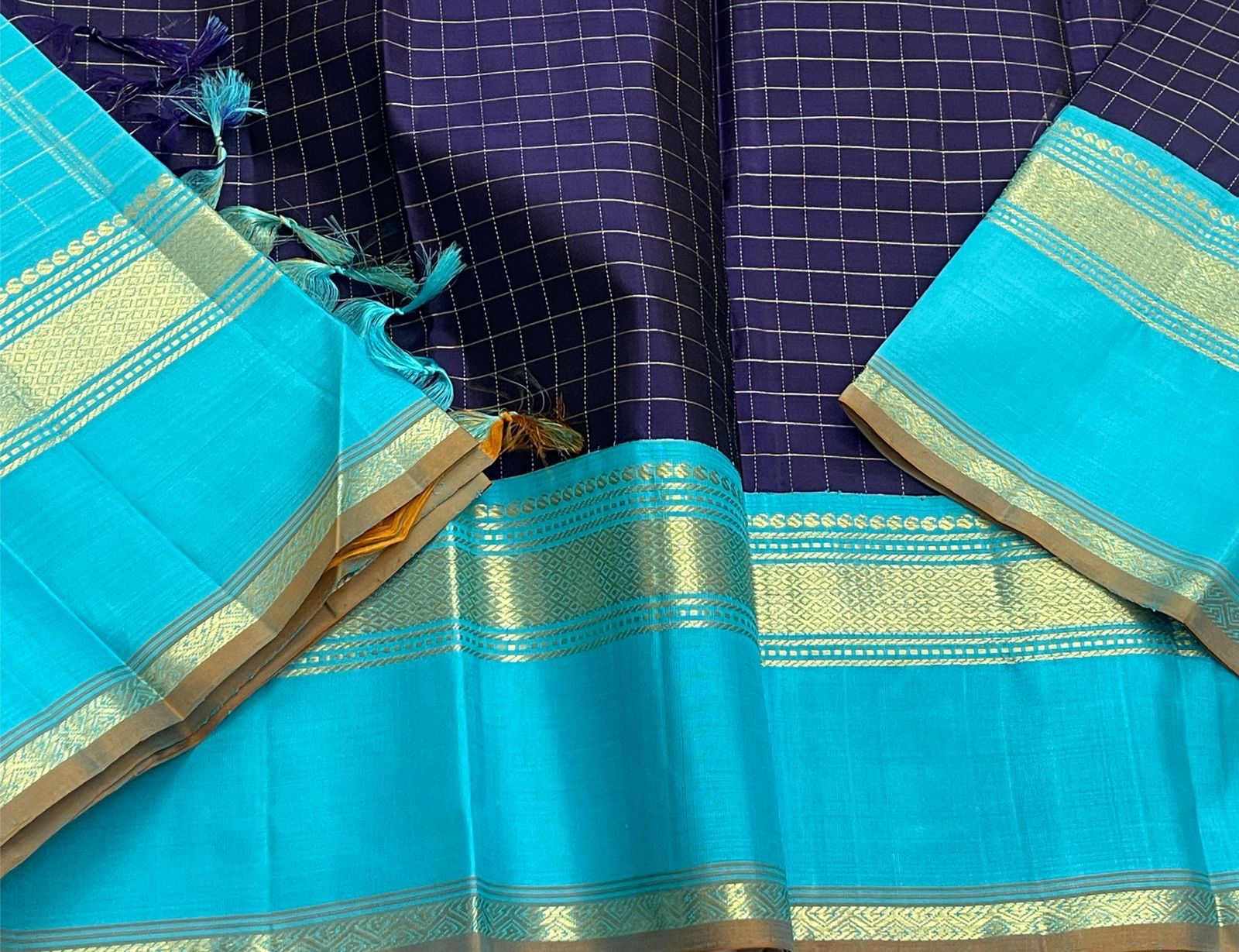 “Cerulean Kattam” evokes the calm of twilight and the brilliance of festive glow. The deep navy body adorned with intricate oosi-kattam checks exudes timeless charm, while the contrasting cerulean-blue korvai border adds a burst of coastal freshness. Its pallu shimmers with elegant zari lines—a perfect choice for Diwali soirées, weddings, and festive gatherings.