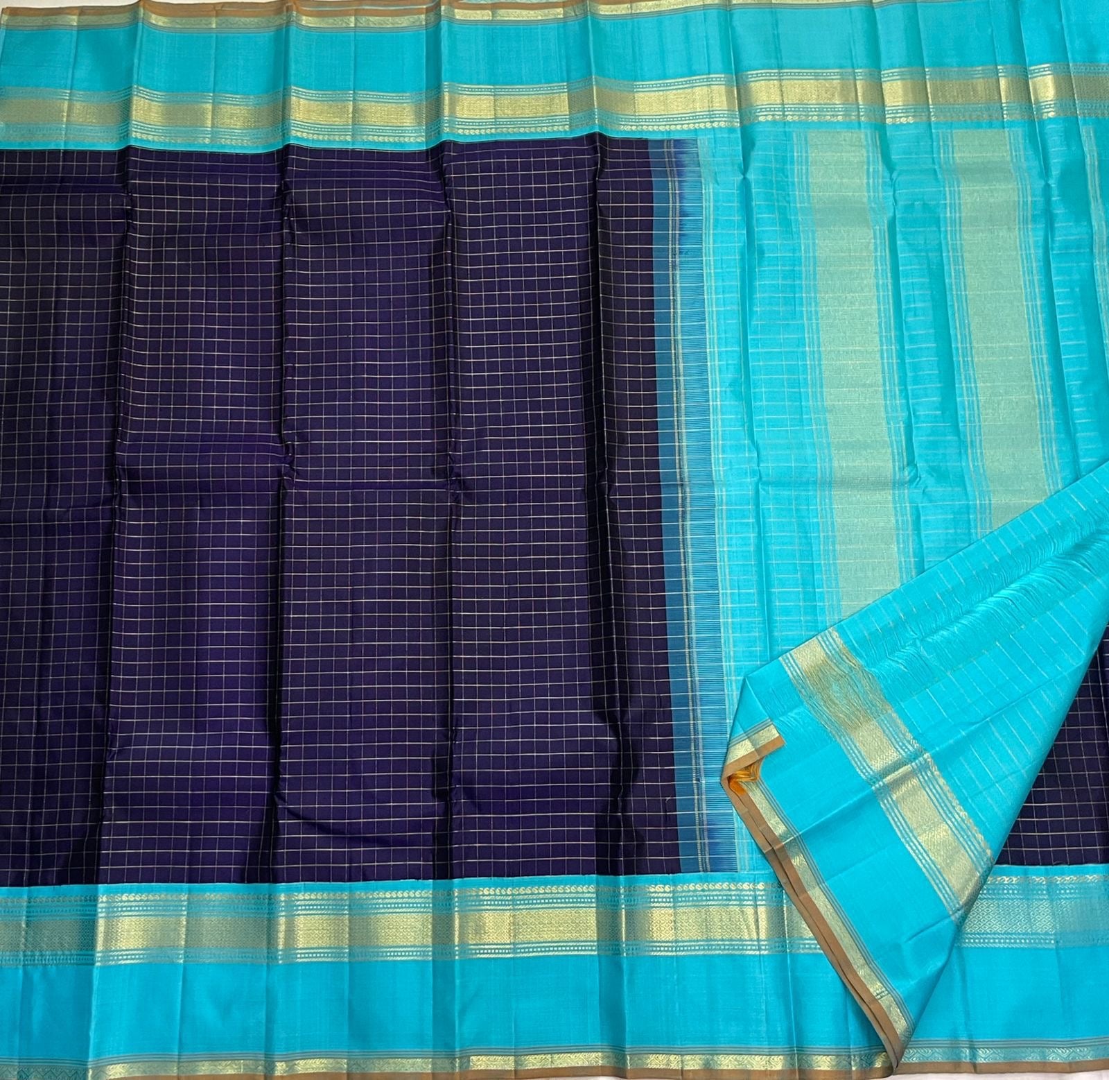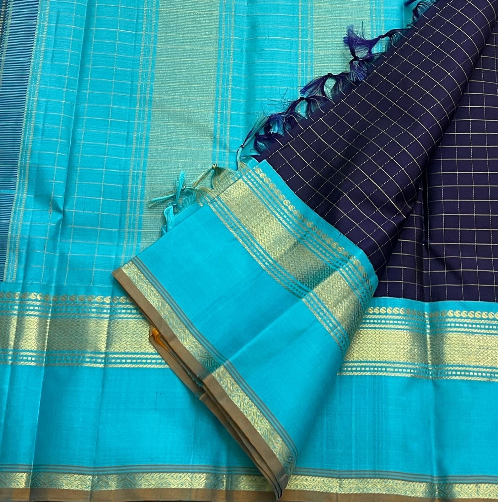 • Body: Deep navy-blue with oosi-kattam (fine gold grid checks).