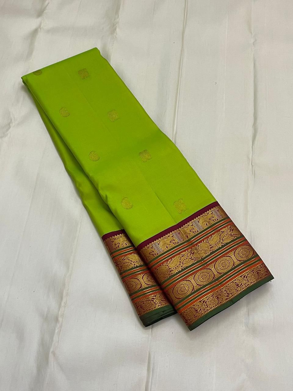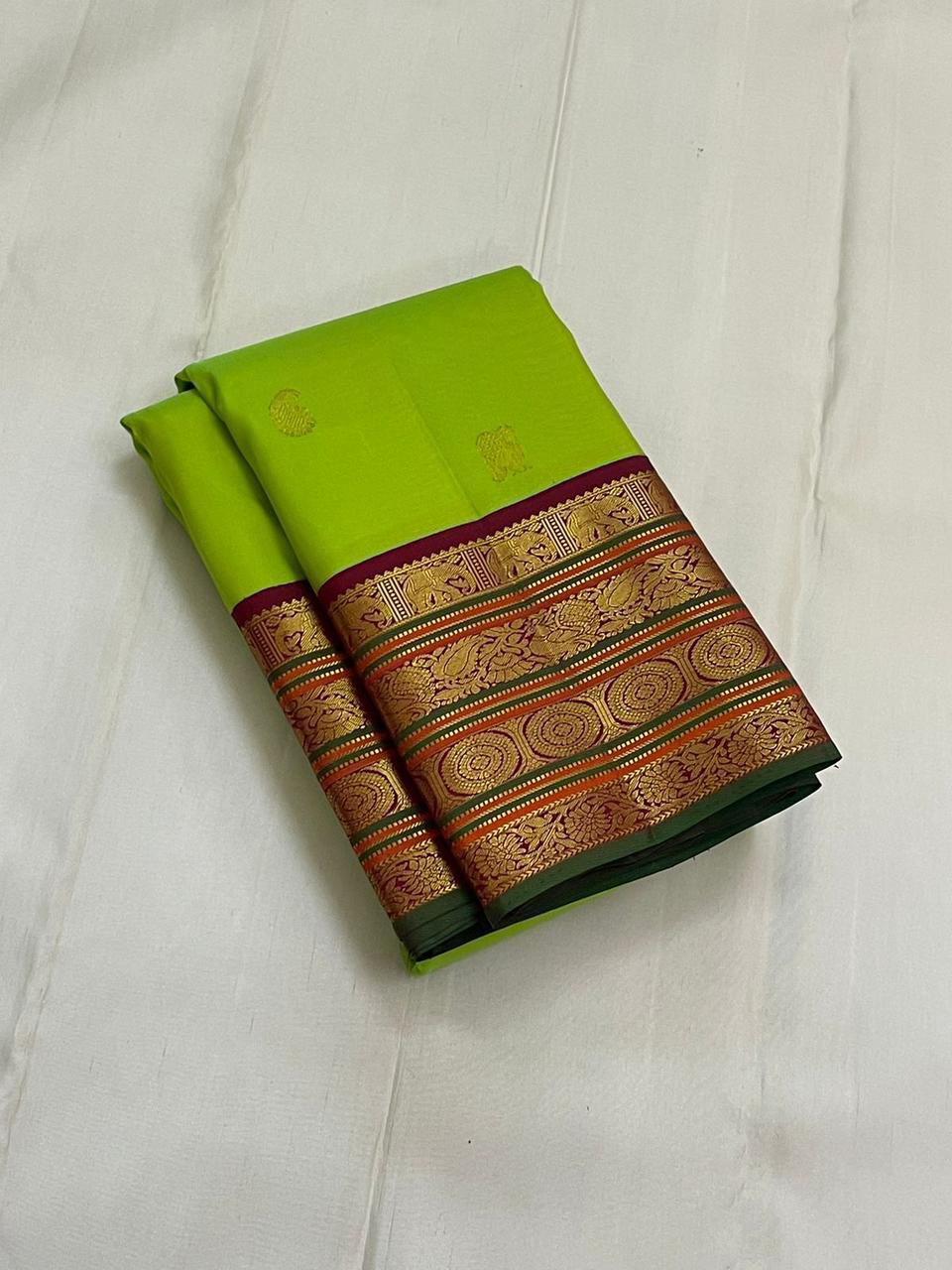 This saree comes with a matching lime-green blouse piece with zari borders, making it the perfect choice for weddings, poojas, and festive gatherings.
