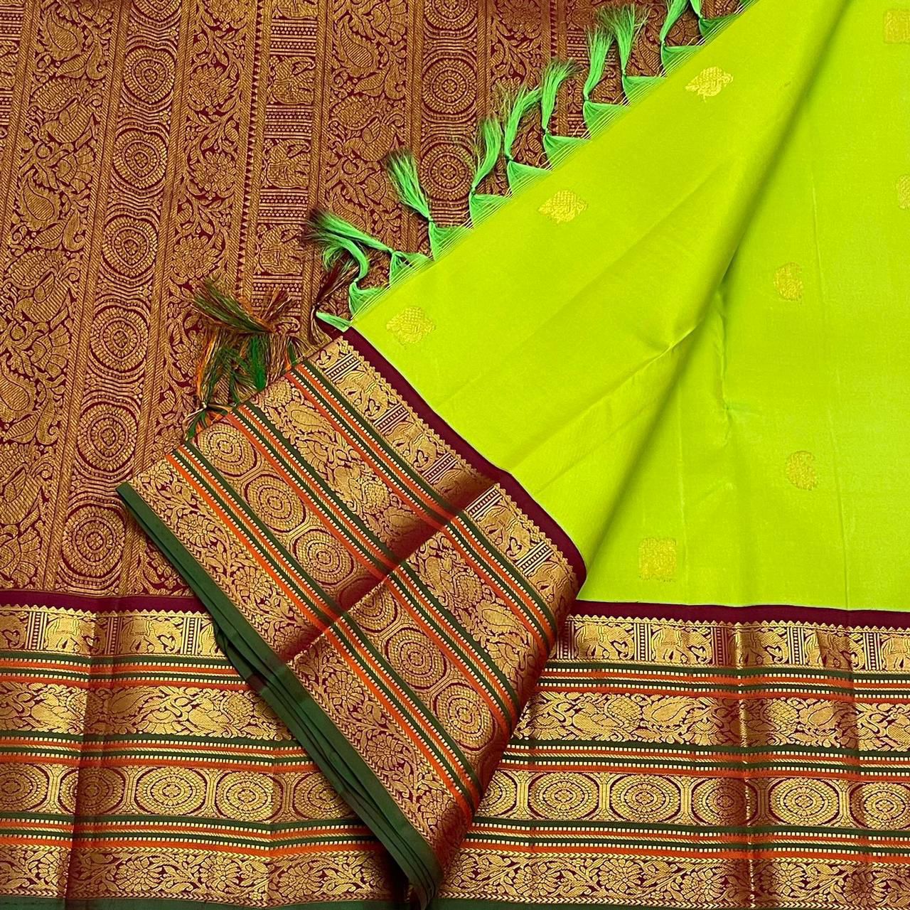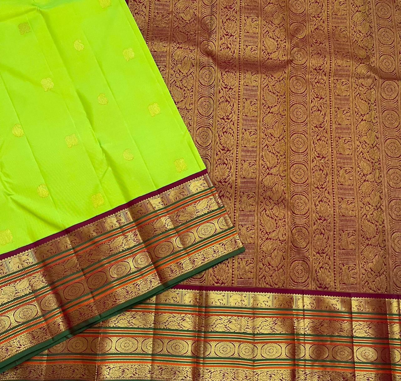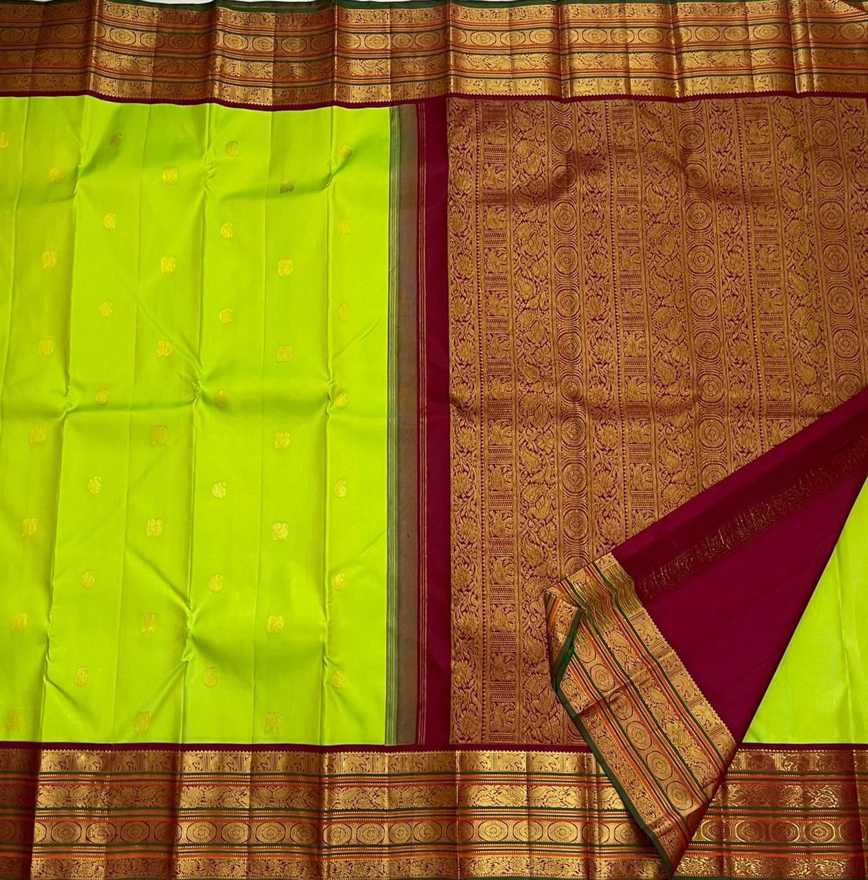 Lime Glow Korvai – Pure Kanchipuram Silk Saree with Zari Buttas & Rich Maroon Zari Pallu