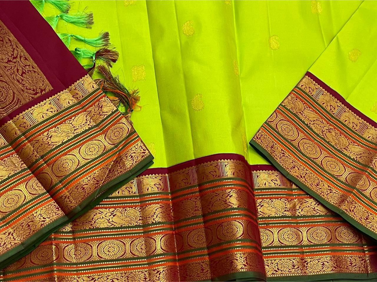Lime Glow Korvai Pure Kanchipuram Silk Saree – Lime Green Body with Gold Zari Buttas Contrast Maroon Korvai Borders with Intricate Zari Motifs Grand Maroon Zari Pallu with Heritage Weave and Hand-Knotted Tassels Silk Mark Certified ✅ | Fall & Pico Done ✅