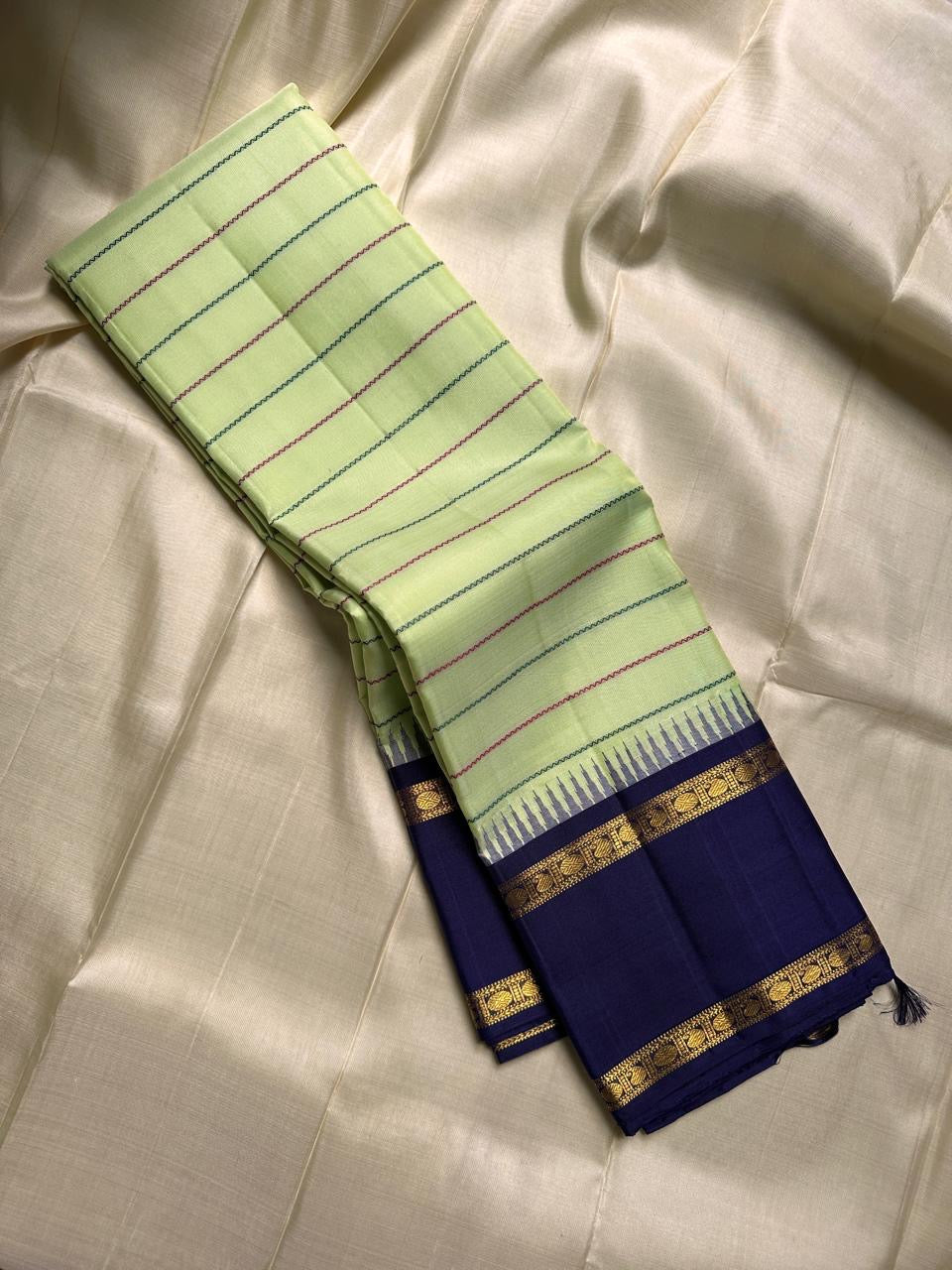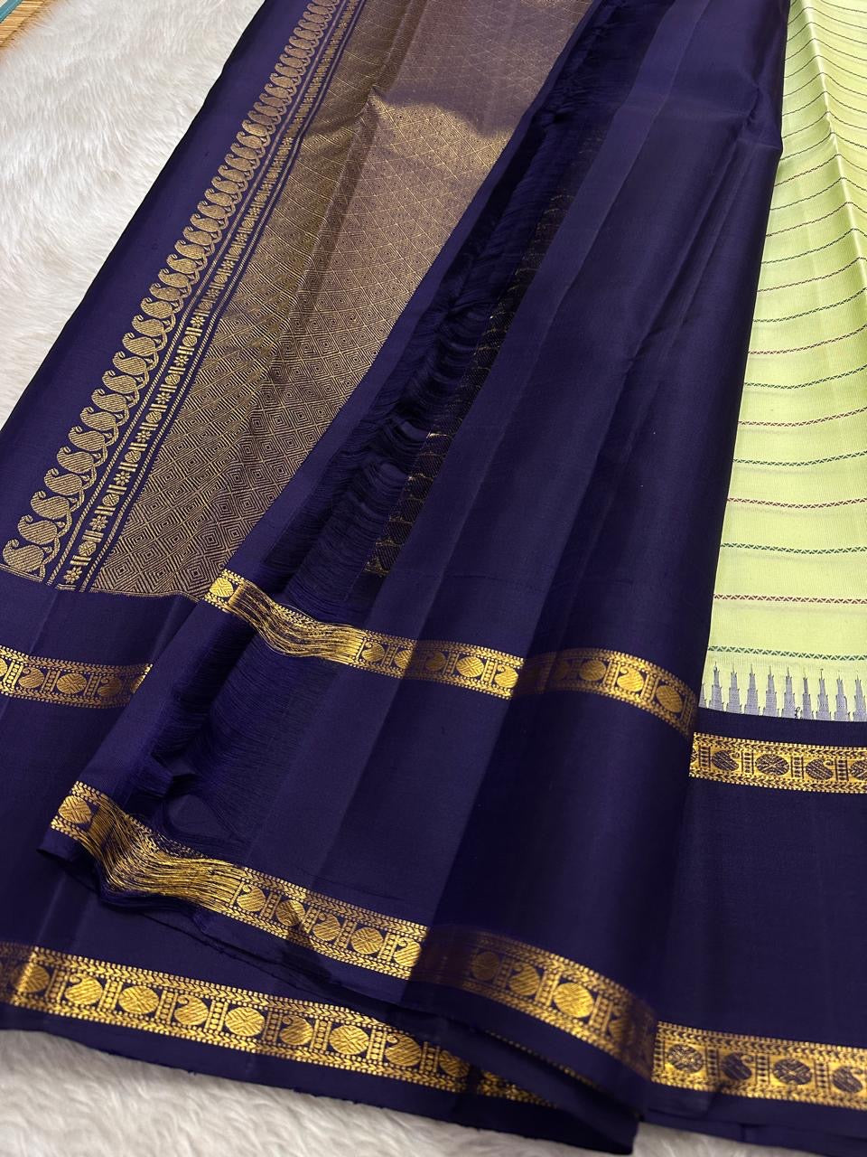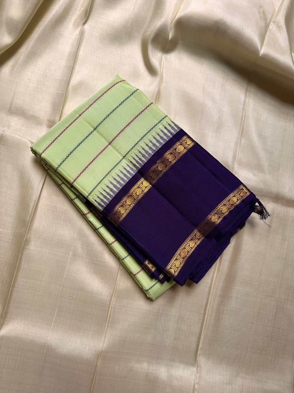 A refreshing heirloom beauty in a soft cardamom green body accented with delicate multicolor stripes running across the drape. The saree is finished with a deep aubergine/purple korvai contrast—borders gleaming in rich gold zari and a grand pallu woven with a fine geometric lattice. A row of temple (gopuram) teeth rises along the skirt line, adding classic South Indian character. Elegant for weddings, temple visits, and festive evenings.