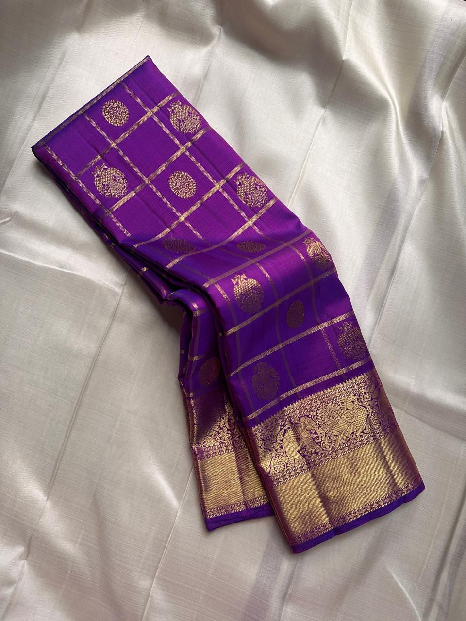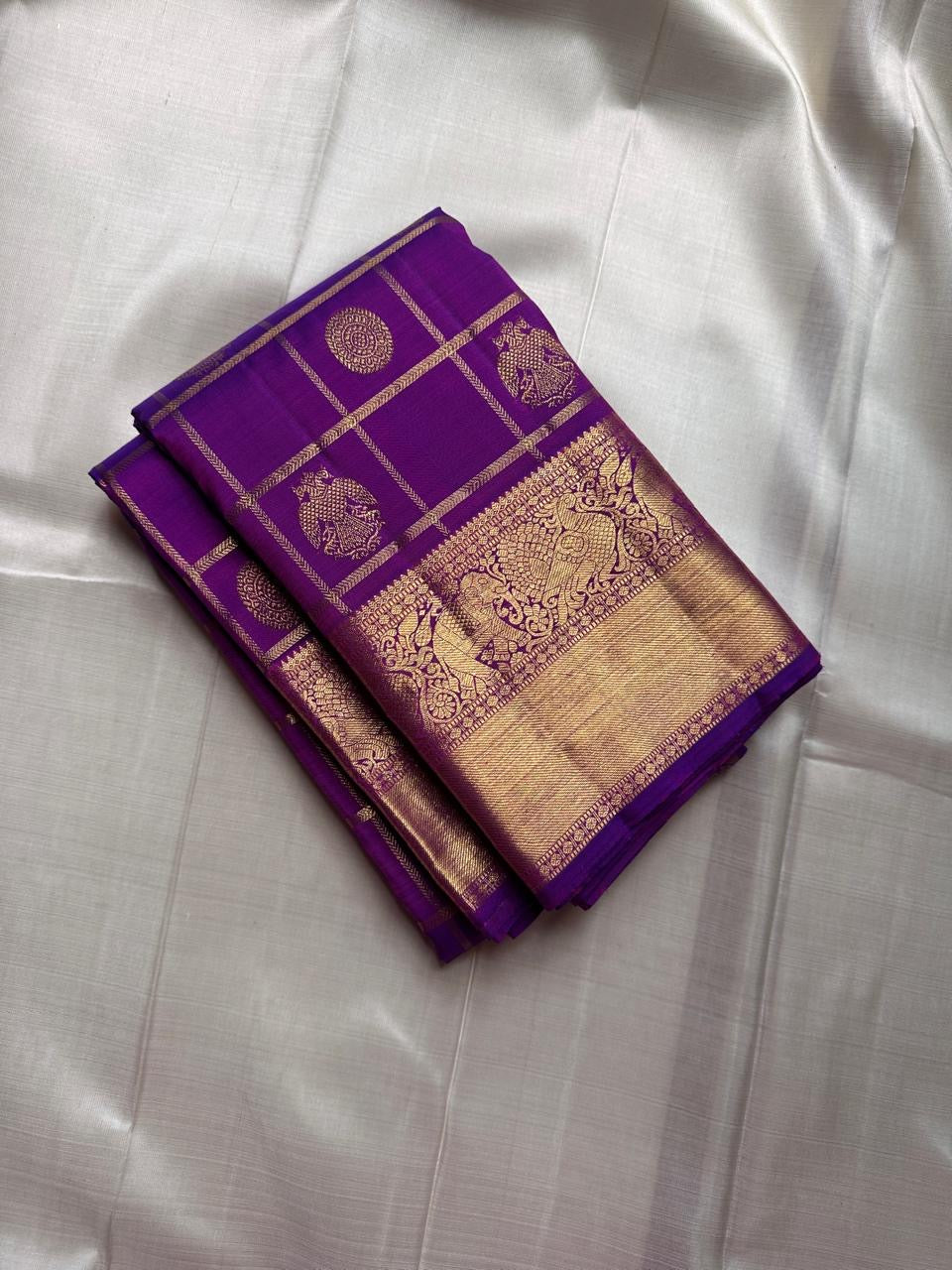 Pure Kanchipuram Silk Saree – Amethyst Purple Kattam Checks with Gandaberunda & Floral Zari Borders