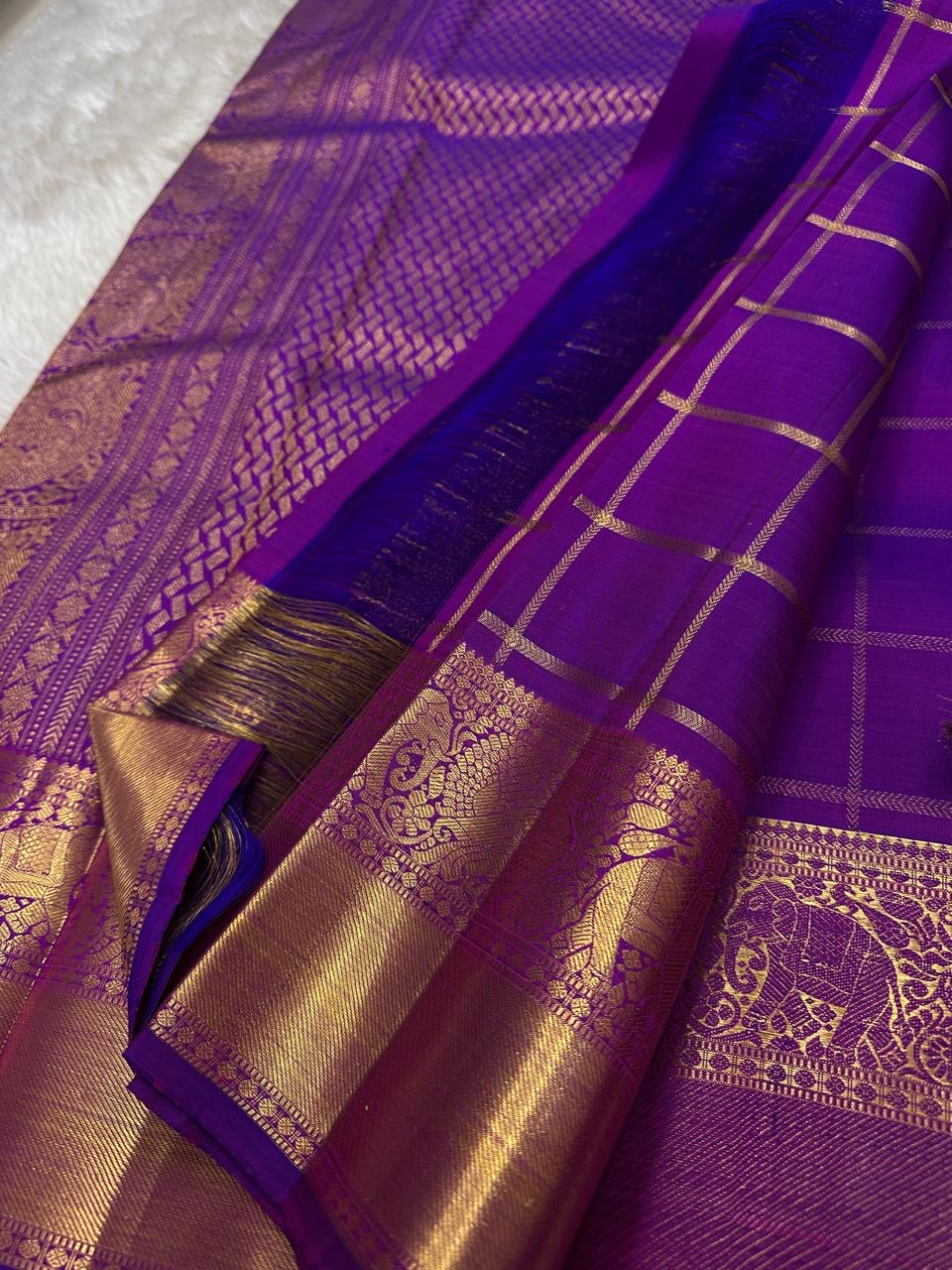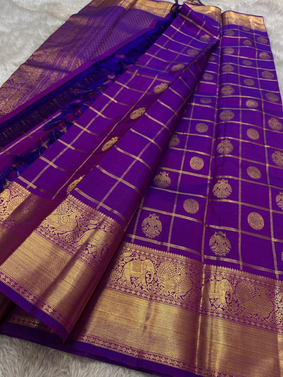 - Body: Amethyst purple with kattam checks, chakram & lotus buttas
