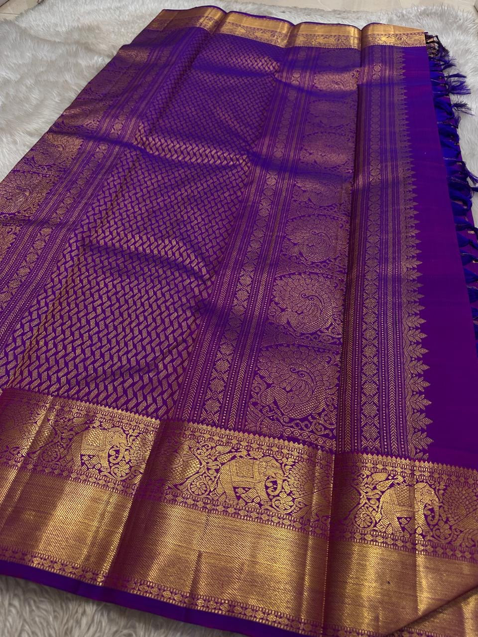 - Pallu: Majestic purple zari brocade pallu with traditional jaal weave