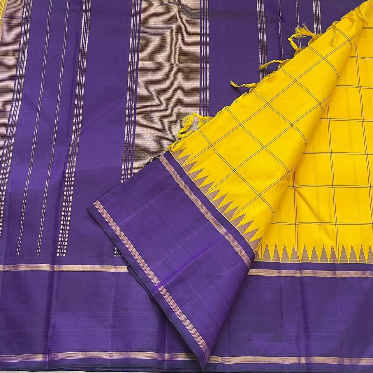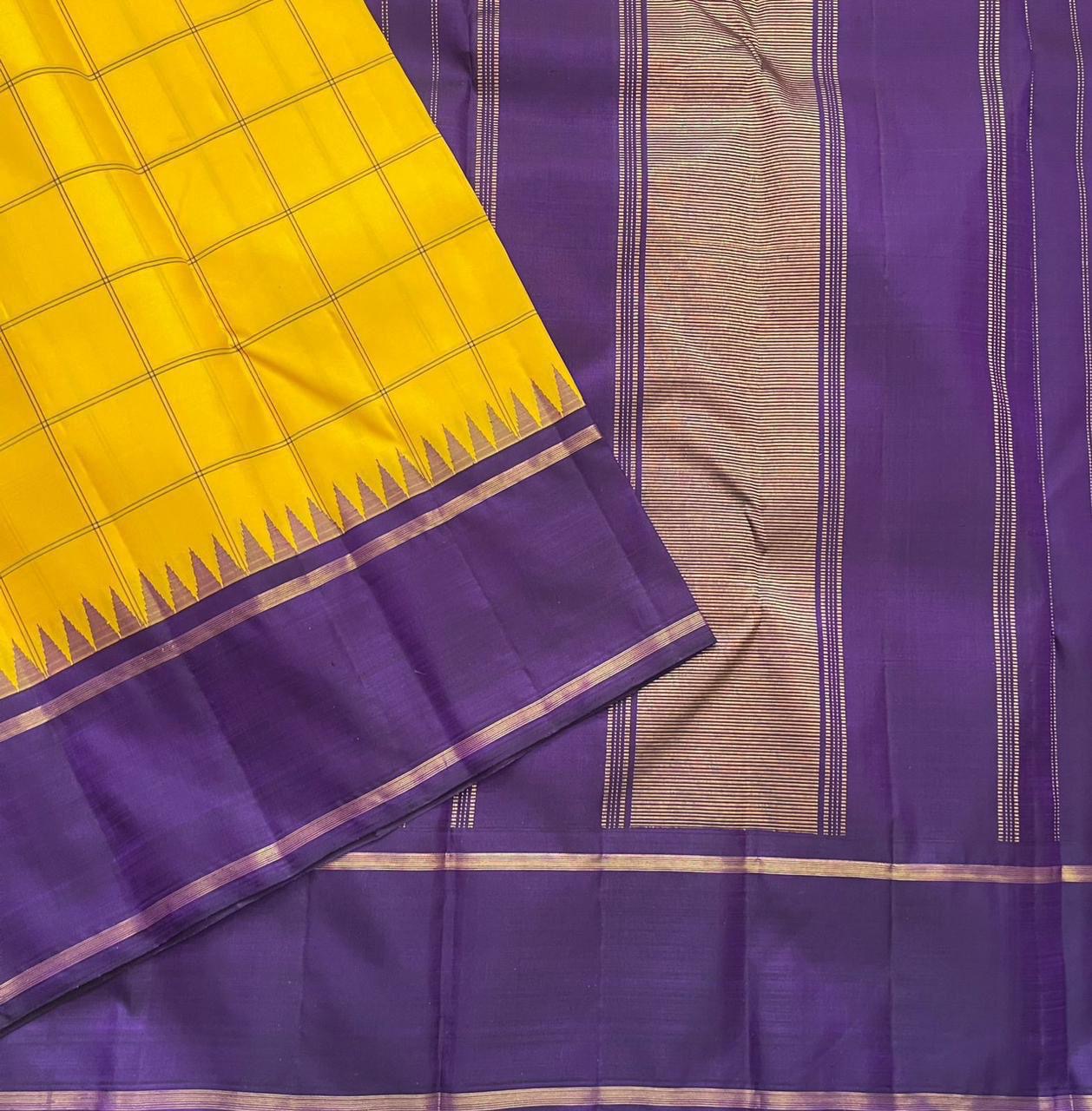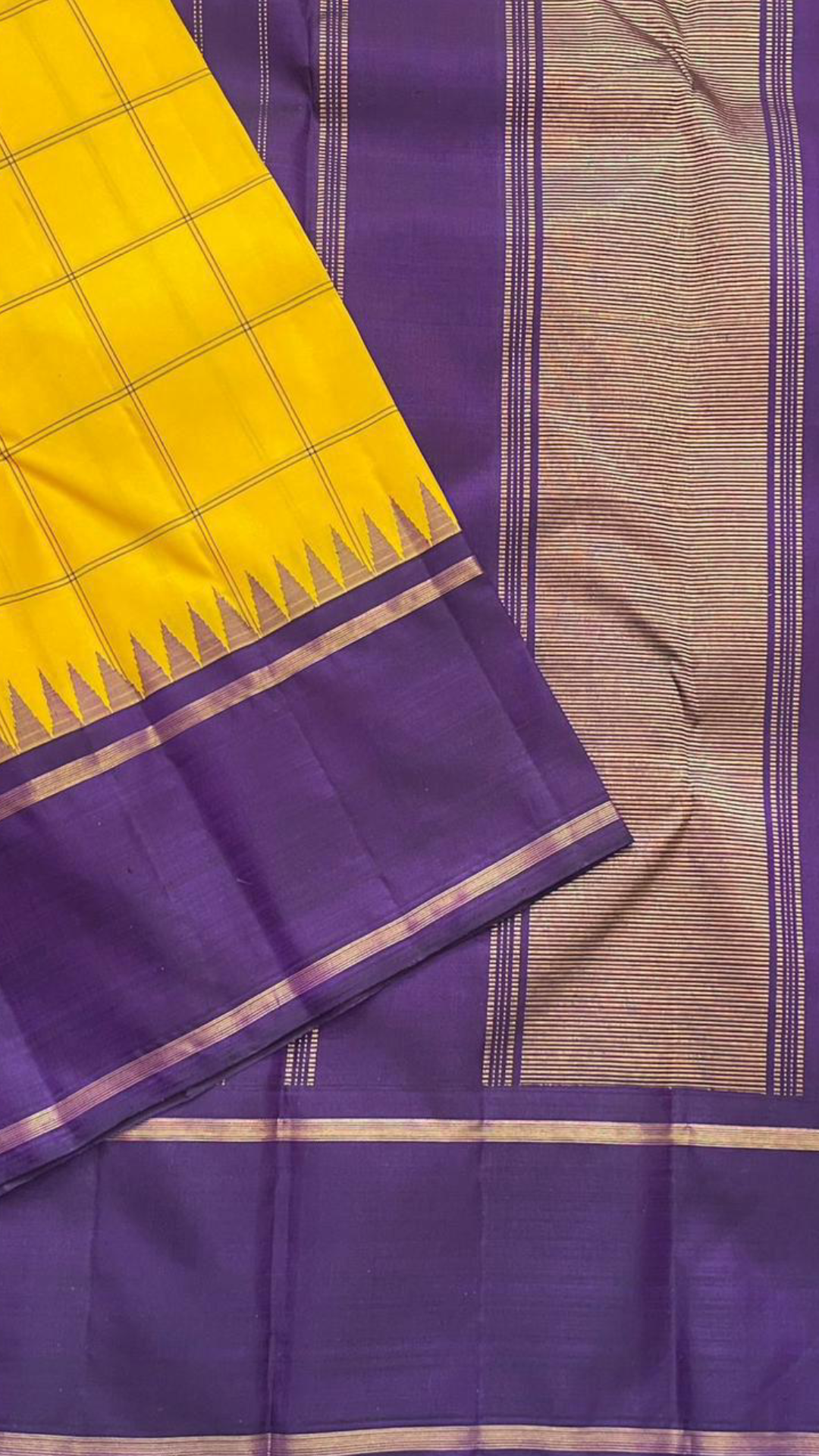 Haldi Violet Kattam Korvai Pure Kanchipuram Silk Saree – Bright Haldi Yellow Checks with Contrasting Violet Korvai Borders Minimal zari lines for an elegant look Grand violet pallu with delicate zari stripes, silk mark certified, ships in 2 weeks