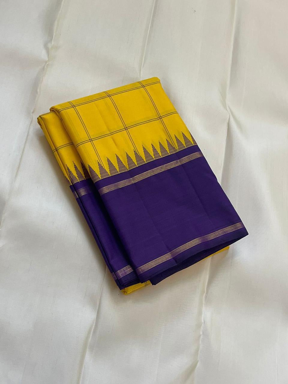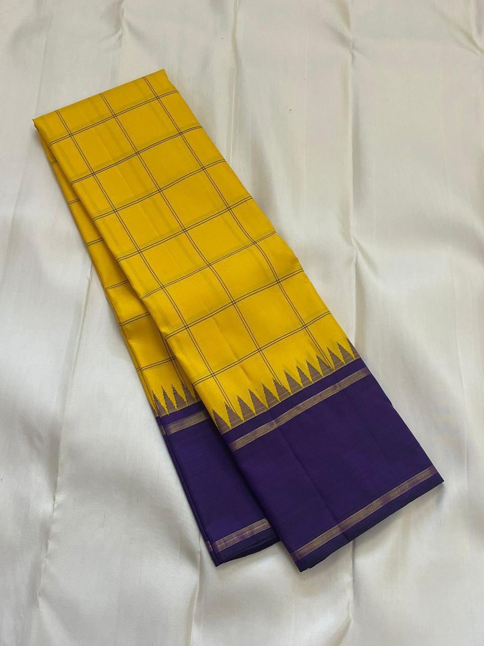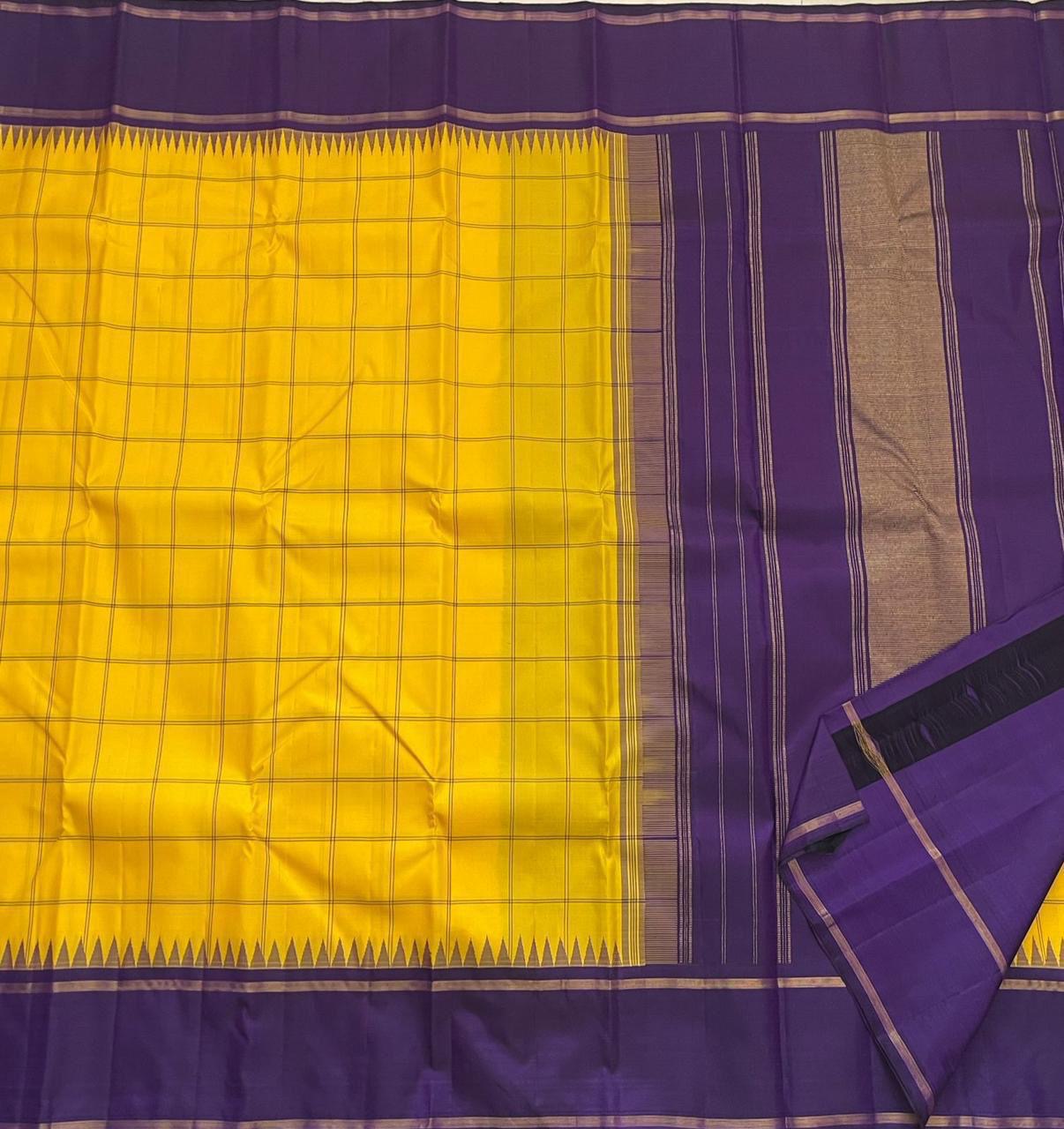 Haldi Violet Kattam Korvai Pure Kanchipuram Silk Saree – Bright Haldi Yellow Checks with Contrasting Violet Korvai Borders Minimal zari lines for an elegant look Grand violet pallu with delicate zari stripes, silk mark certified, ships in 2 weeks