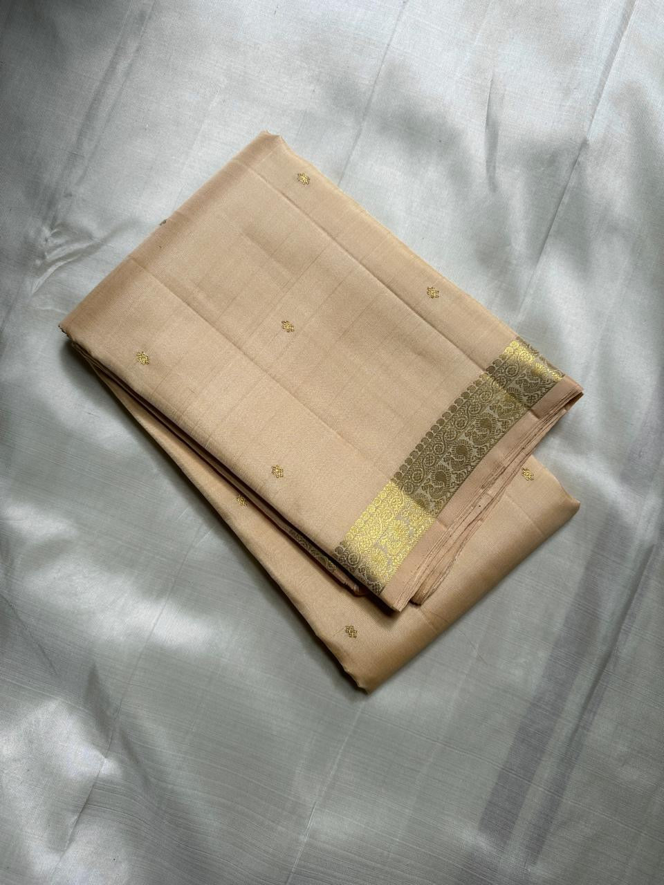 Small Border Sandal | Pure Kanchipuram Silk Saree A serene sandal beige body adorned with subtle gold zari buttas & temple-inspired border ✨ Silk Mark Certified • Free USA Shipping • Ships in Two Weeks