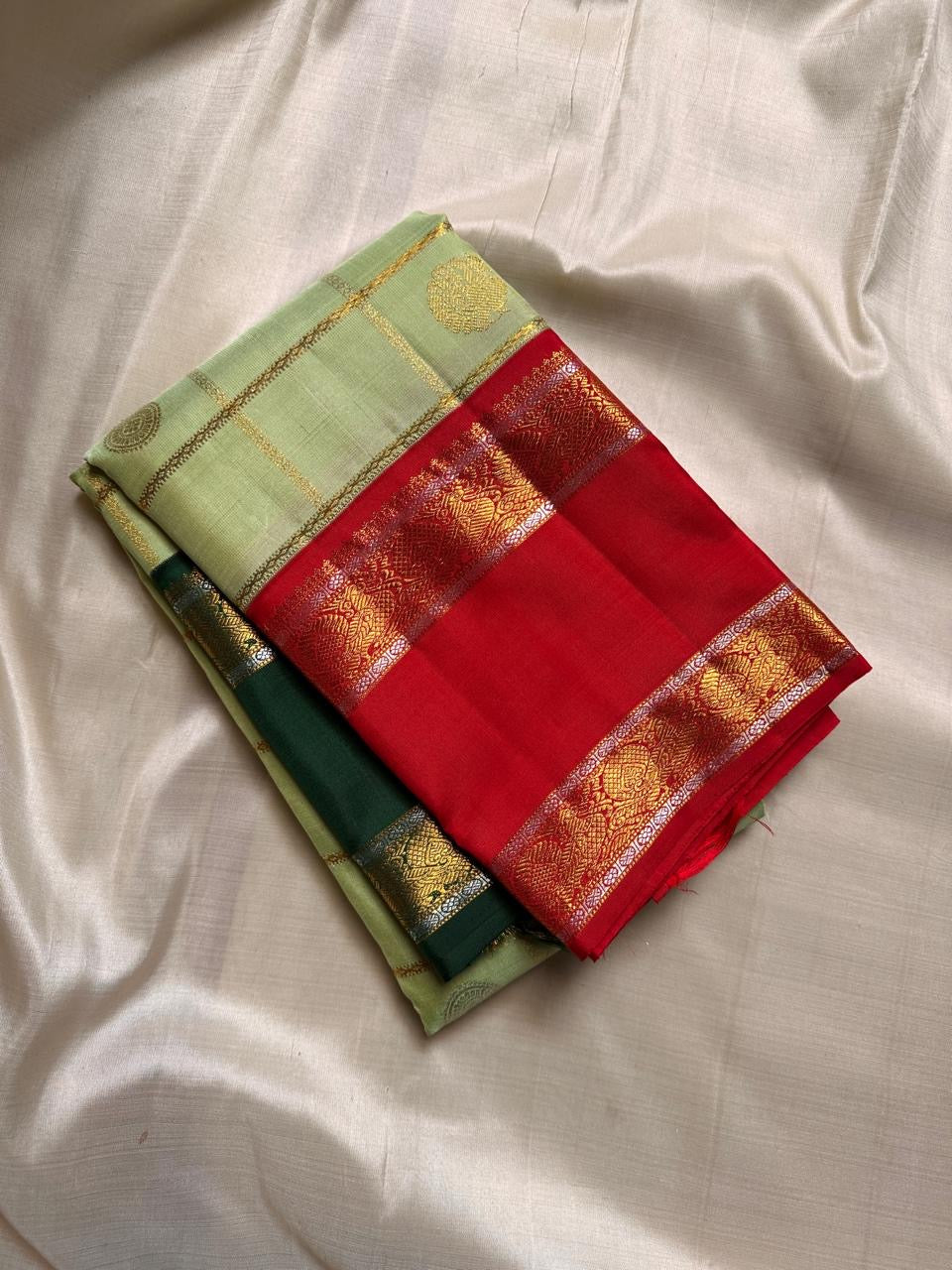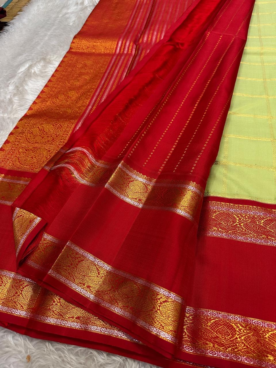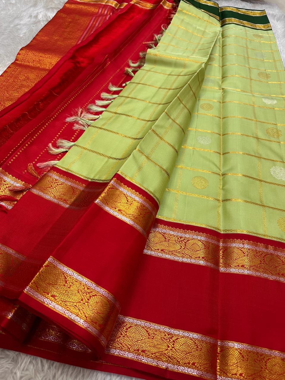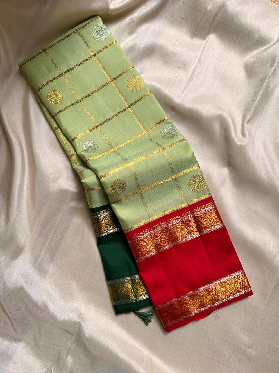 A captivating heirloom Kanchipuram that celebrates the artistry of the Ganga Jamuna weave. The body glows in a fresh pistachio green with delicate gold zari kattam checks adorned with circular floral buttas. What makes this drape truly unique is its dual-tone borders—one side in deep emerald green and the other in bold vermilion red—each richly embellished with intricate gold zari patterns. The contrast vermilion red pallu completes the ensemble with grandeur, woven in traditional zari motifs and temple-inspired designs.