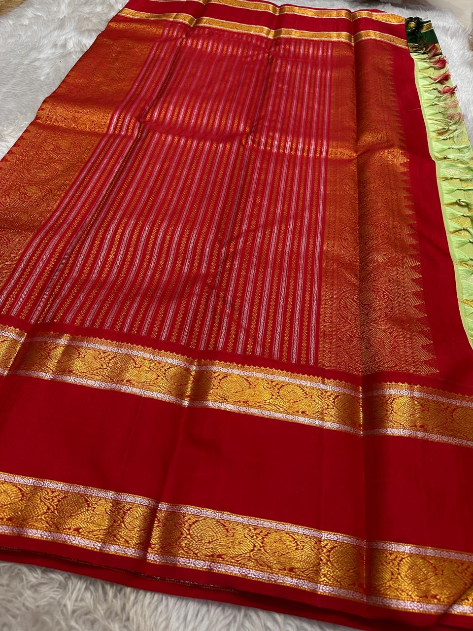 - Pallu: Rich vermilion red with traditional zari motifs and stripes