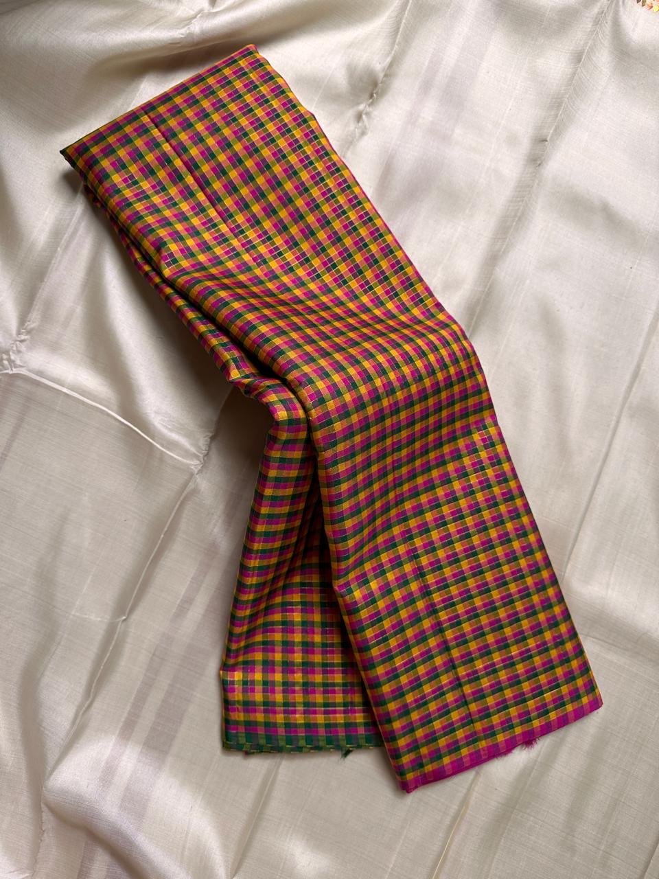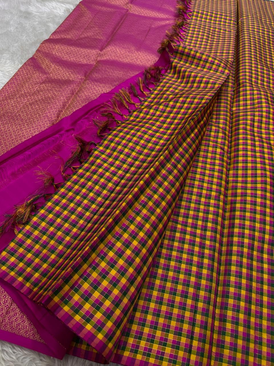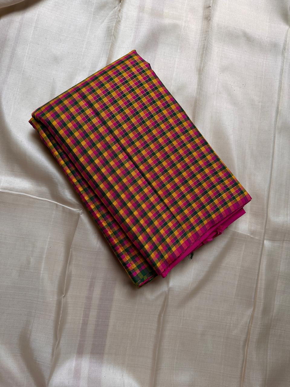 . This elegant borderless Kanchipuram silk saree features classic Paalum Pazhamum baby checks (kasa kasa kattam) in traditional hues of mustard, magenta, and green, evoking the charm of childhood memories and temple-town elegance.