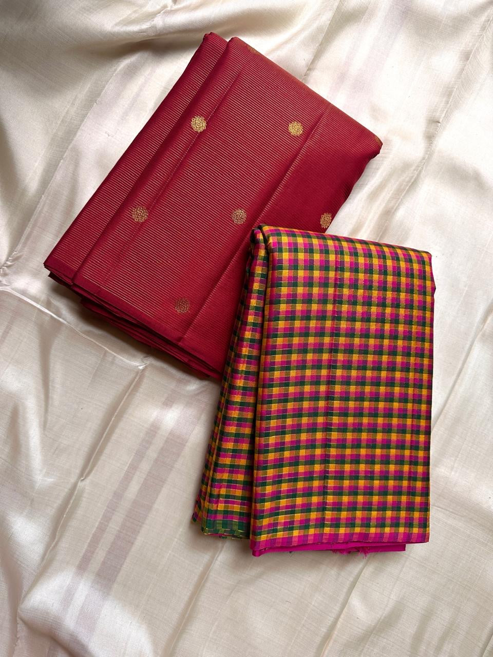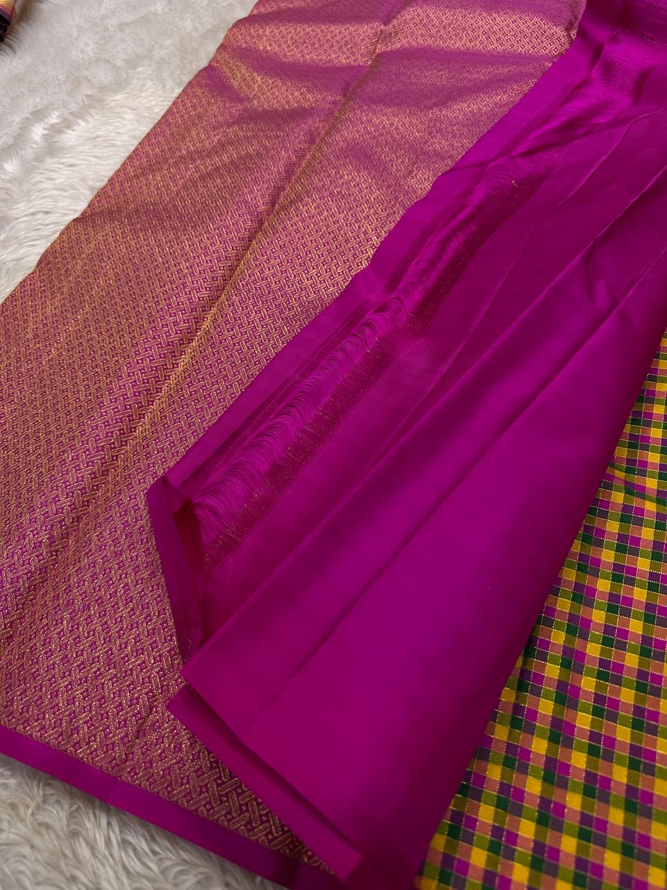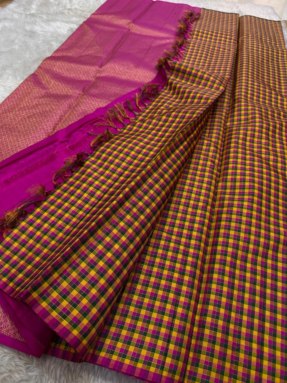 . This elegant borderless Kanchipuram silk saree features classic Paalum Pazhamum baby checks (kasa kasa kattam) in traditional hues of mustard, magenta, and green, evoking the charm of childhood memories and temple-town elegance.