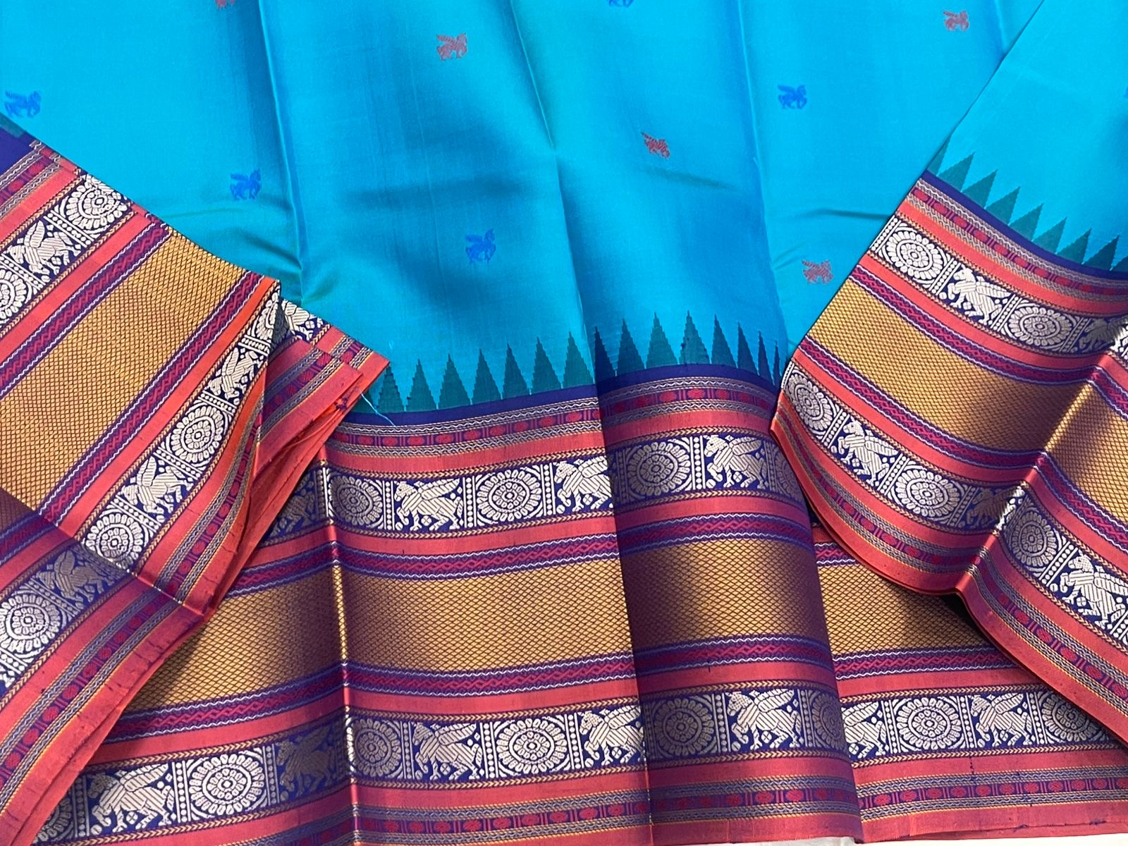 Peacock-teal body with woven silk-thread buttas in navy & coral hues Korvai contrast ruby-maroon borders with gaja-chakram & temple motifs Grand varisaipettu striped pallu in navy, mustard & maroon tones Silk Mark Certified • Ships in Two Weeks