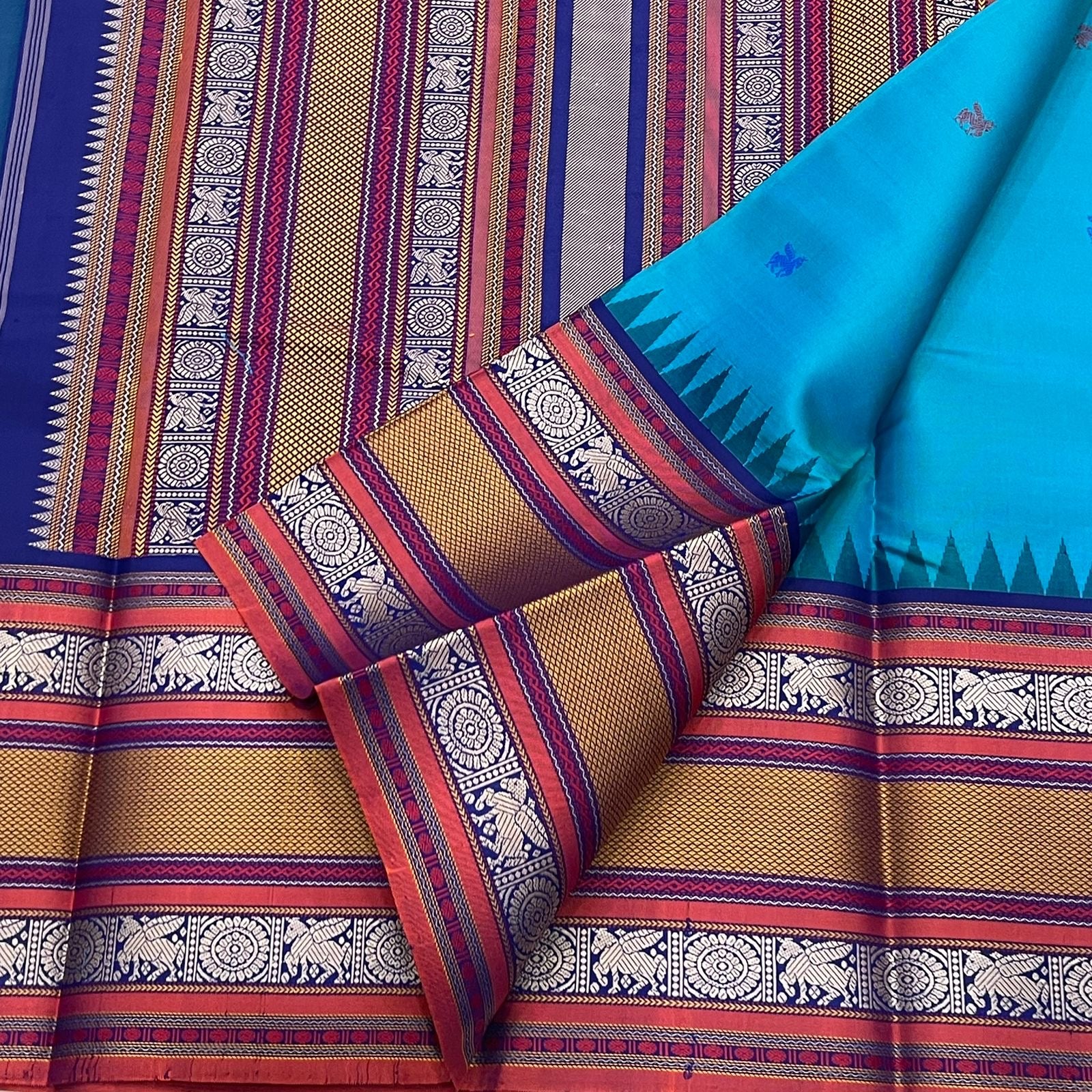 • Body: Sapphire/peacock-teal with scattered silk-thread buttas; crisp temple-tooth (gopuram) inner border.