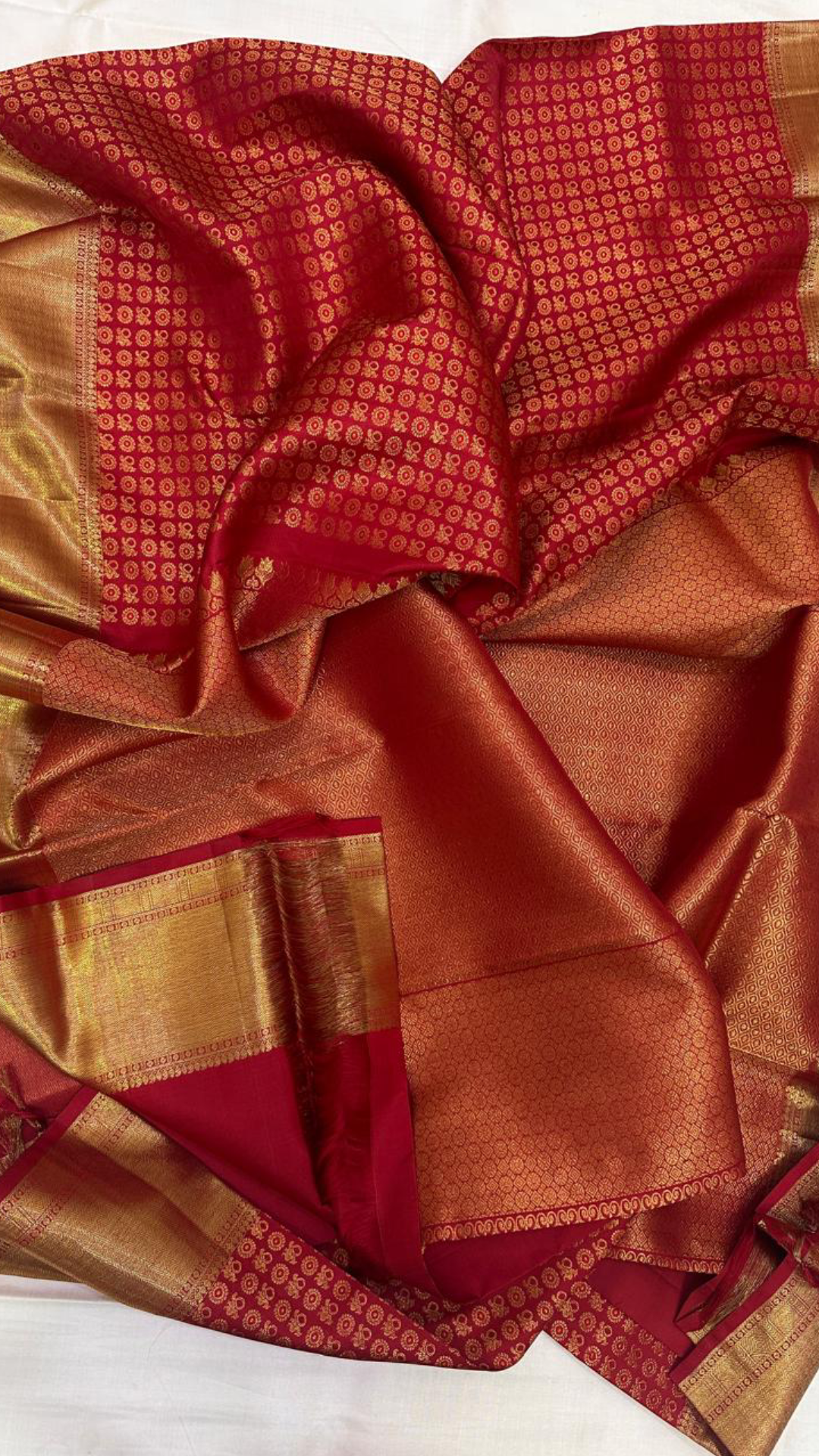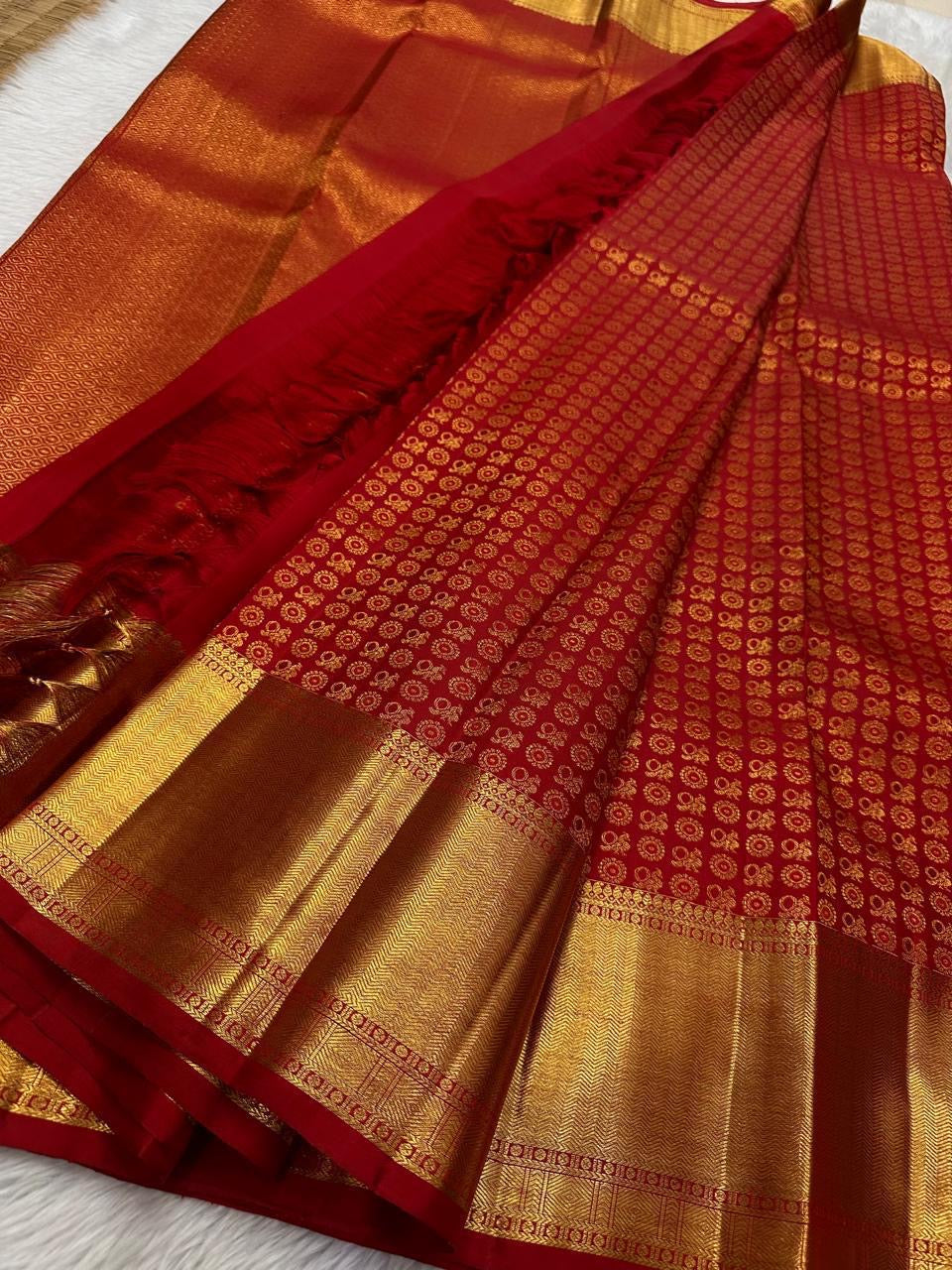 Tara – Red Kanchipuram Pure Silk Saree ✨ Woven with Pure 4g Zari buttas Throughout Deep Roja-Red Body with Golden Zari Buttas Broad 4g Zari Border with Traditional Weave Silk Mark Certified | Free USA Shipping