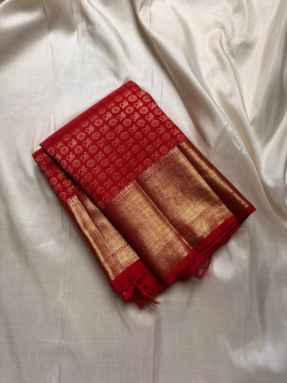 Completed with a coordinated red blouse piece edged with a zari border, Tara – Red is a statement piece—ideal for weddings, temple rituals, and festive celebrations where tradition meets luxury.