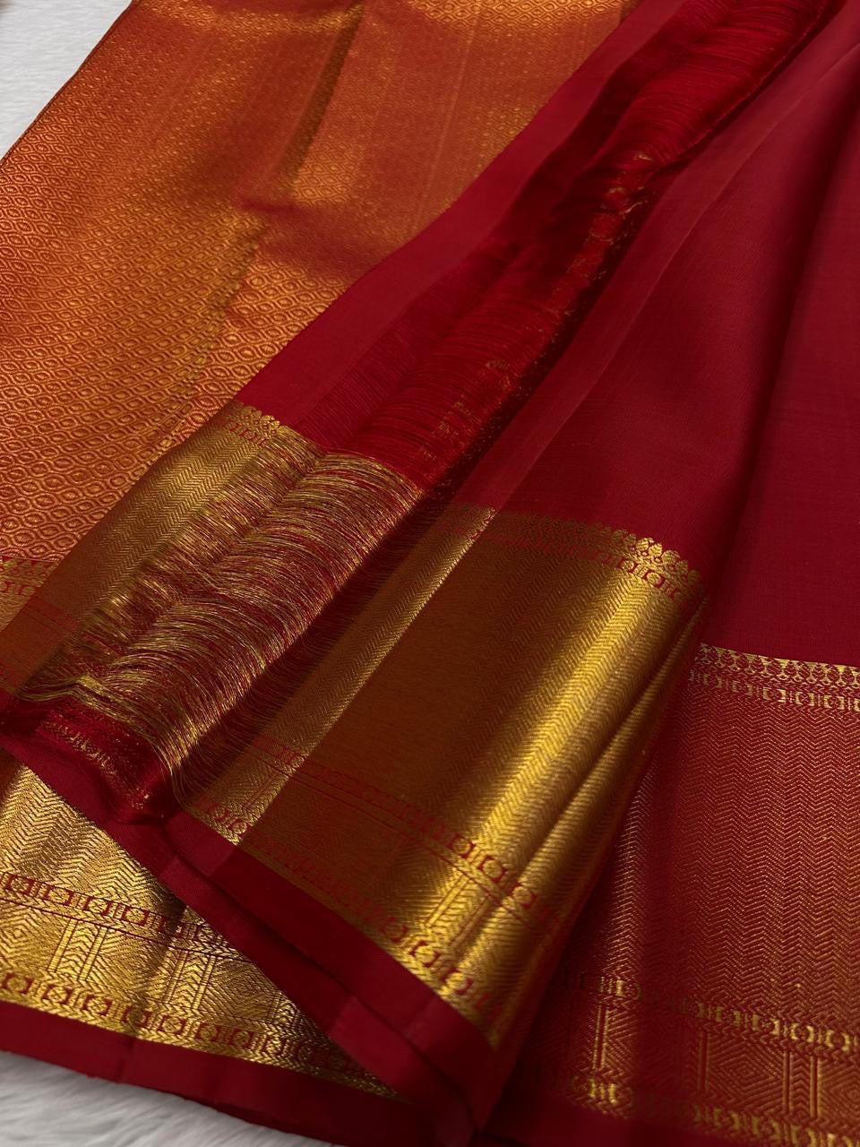 Its broad 4g zari border gleams in traditional herringbone and geometric designs, framed with heritage artistry. The majestic pallu, woven densely with pure 3G zari latticework and ornamental motifs, shimmers with heirloom-worthy grandeur.