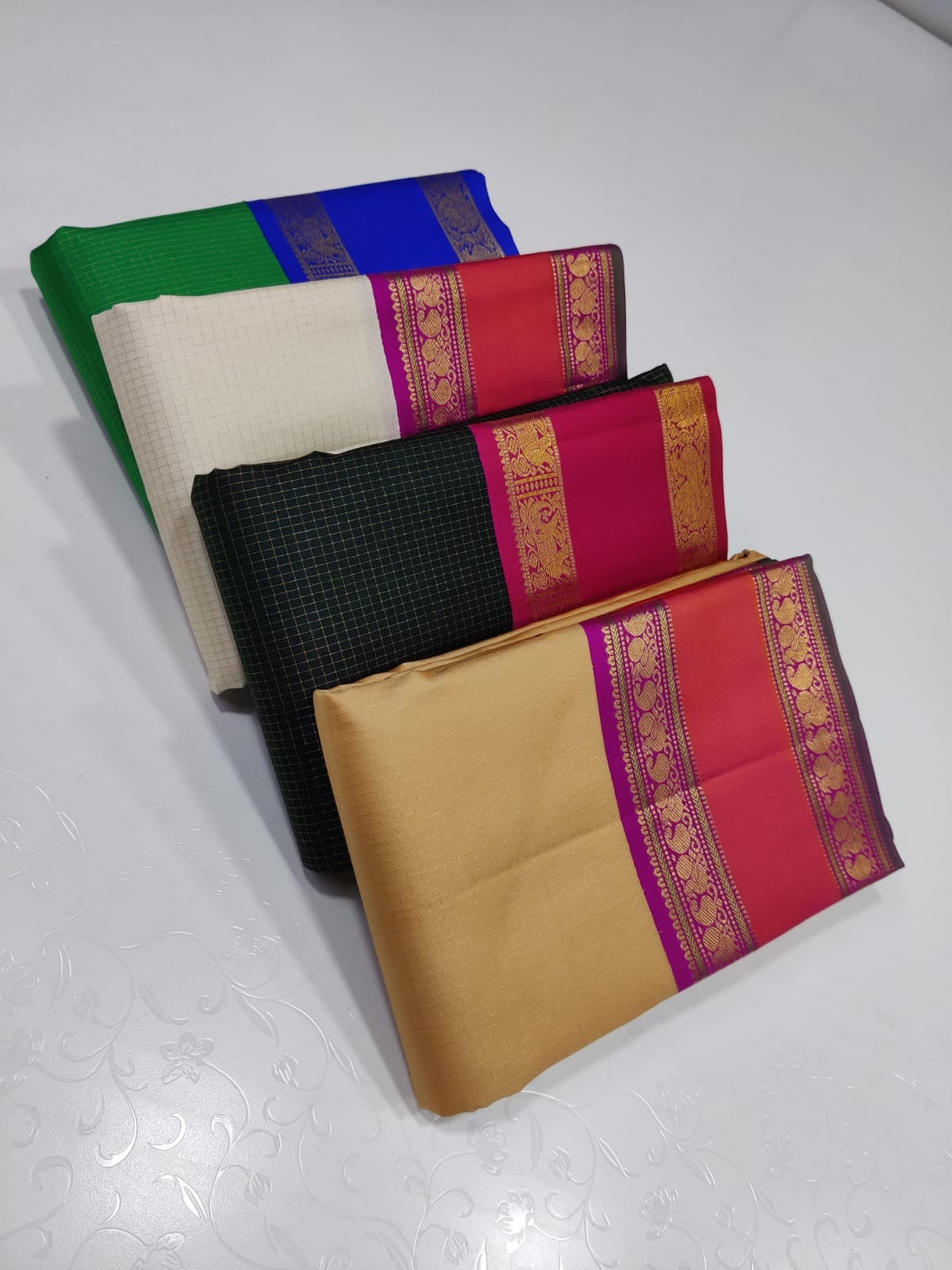- Border: Royal blue rettapet-style border with intricate gold-zari designs