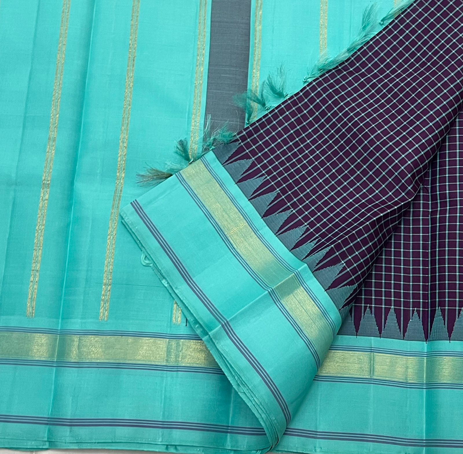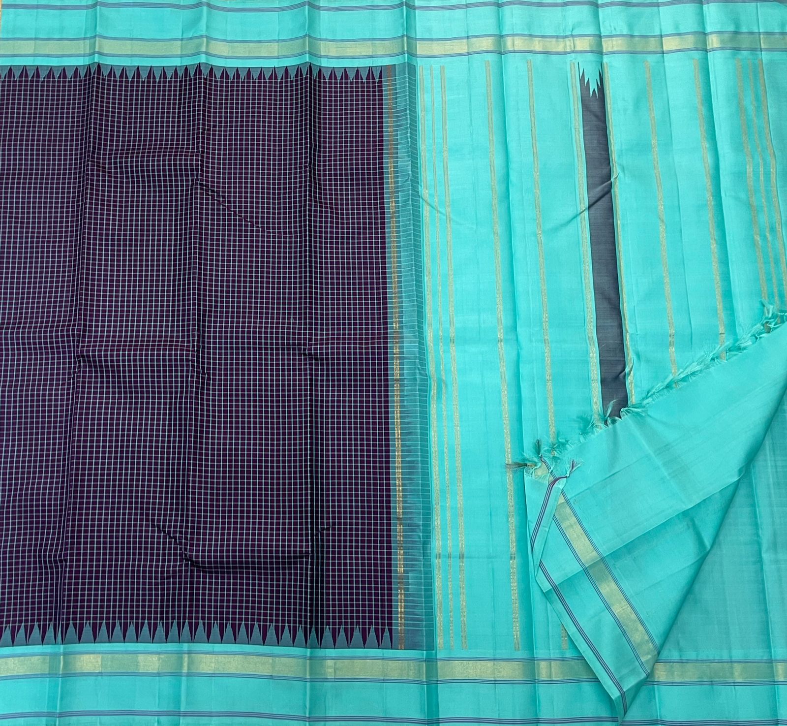Pure Handwoven Kanchipuram Silk Saree – Deep Aubergine Body with Micro Checks Contrasting Aqua Blue Korvai Borders with Temple Motifs & silk thread Stripes Elegant Striped Aqua seer Pallu Silk Mark Certified ✅ ships in 2 weeks.