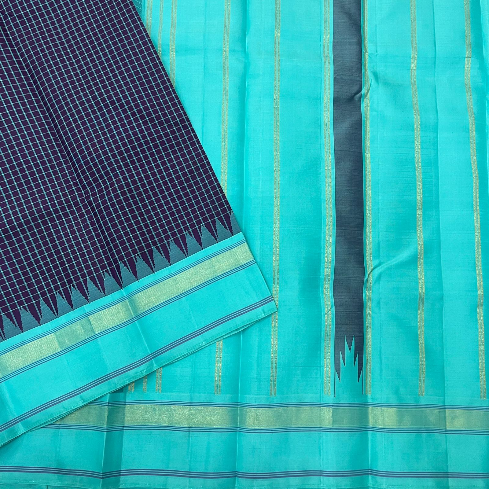 View comparePure Handwoven Kanchipuram Silk Saree – Deep Aubergine Body with Micro Checks Contrasting Aqua Blue Korvai Borders with Temple Motifs & silk thread Stripes Elegant Striped Aqua seer Pallu Silk Mark Certified ✅ ships in 2 weeks.